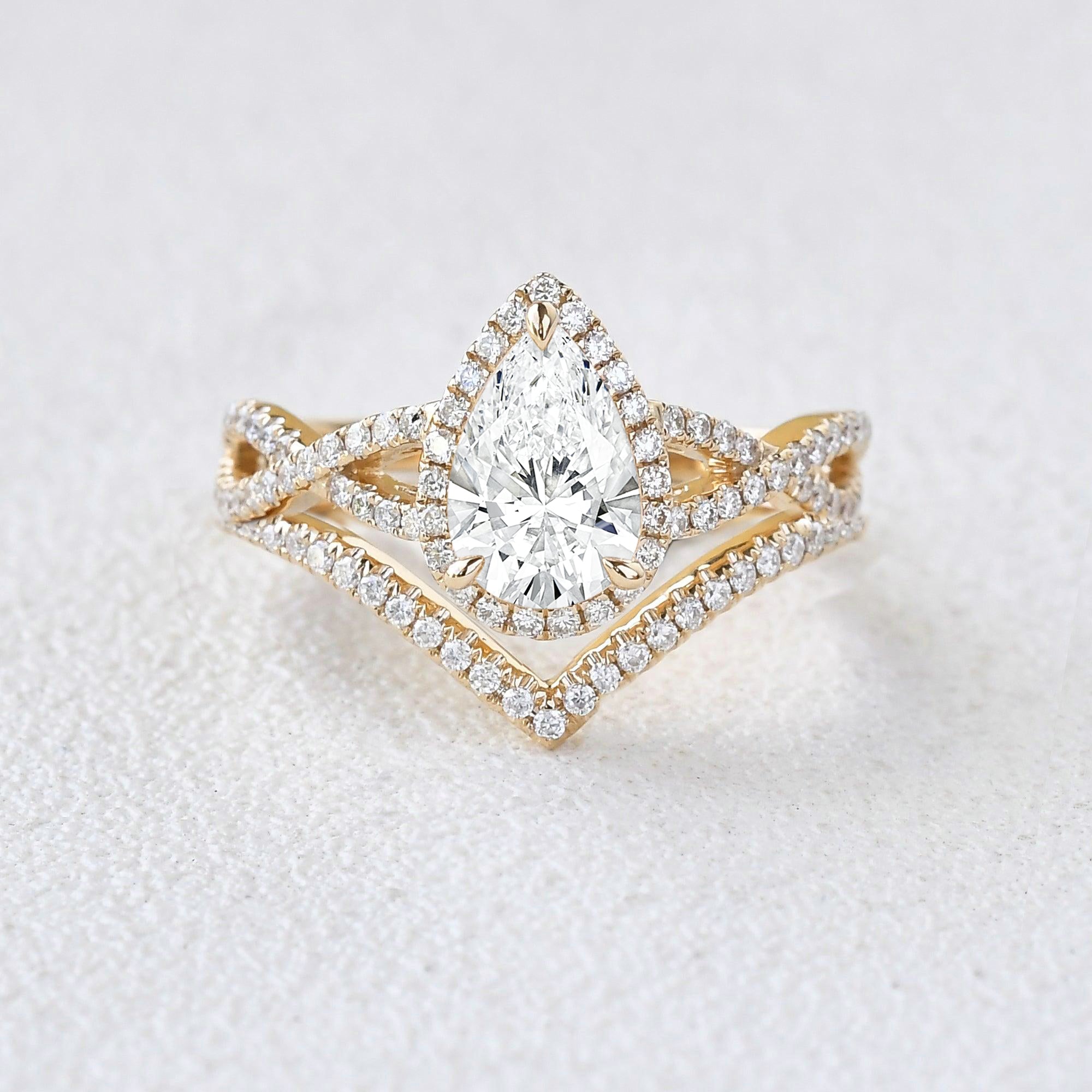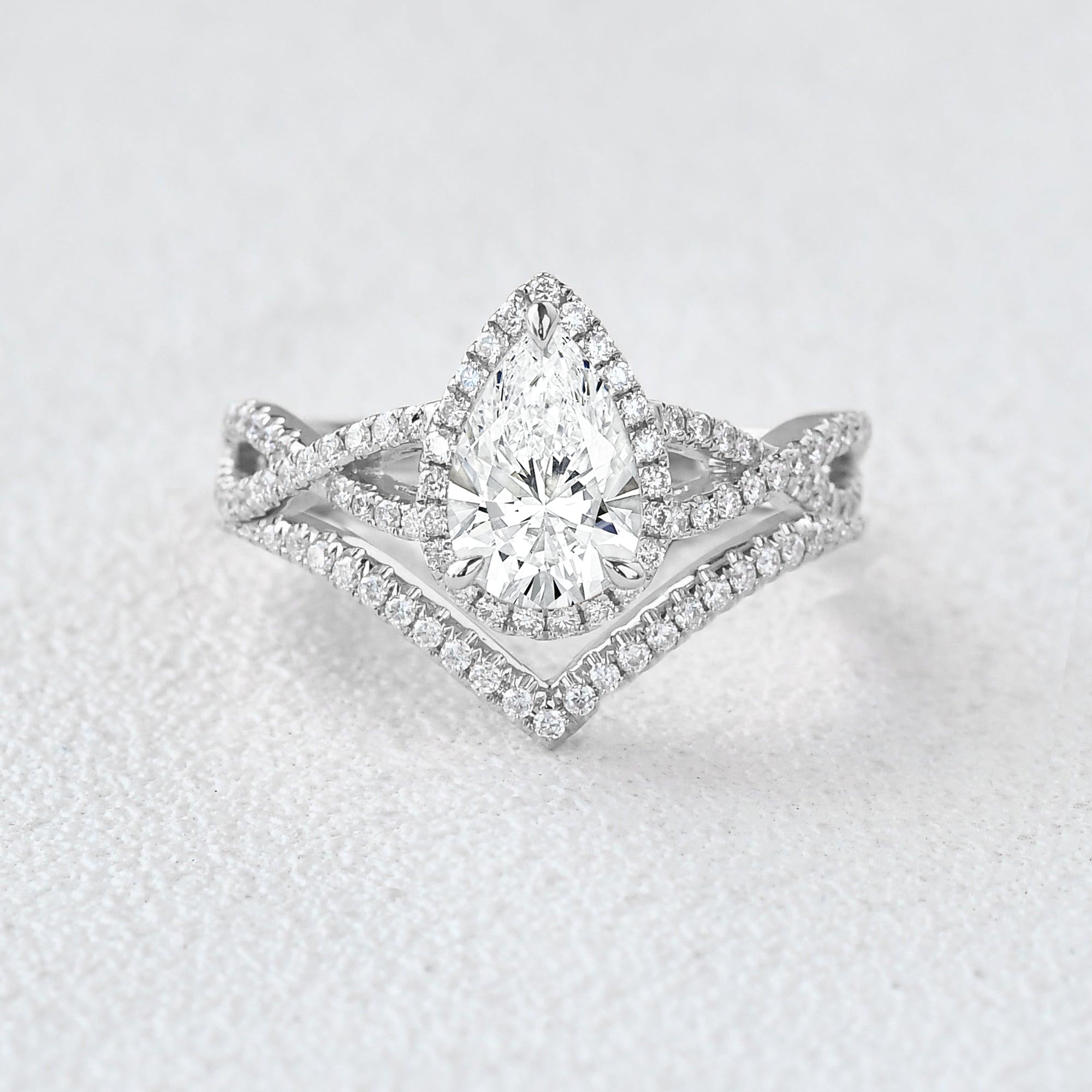 1.0ct Pear Cut Halo Lab Grown Diamond Halo Engagement Ring Set 2pcs