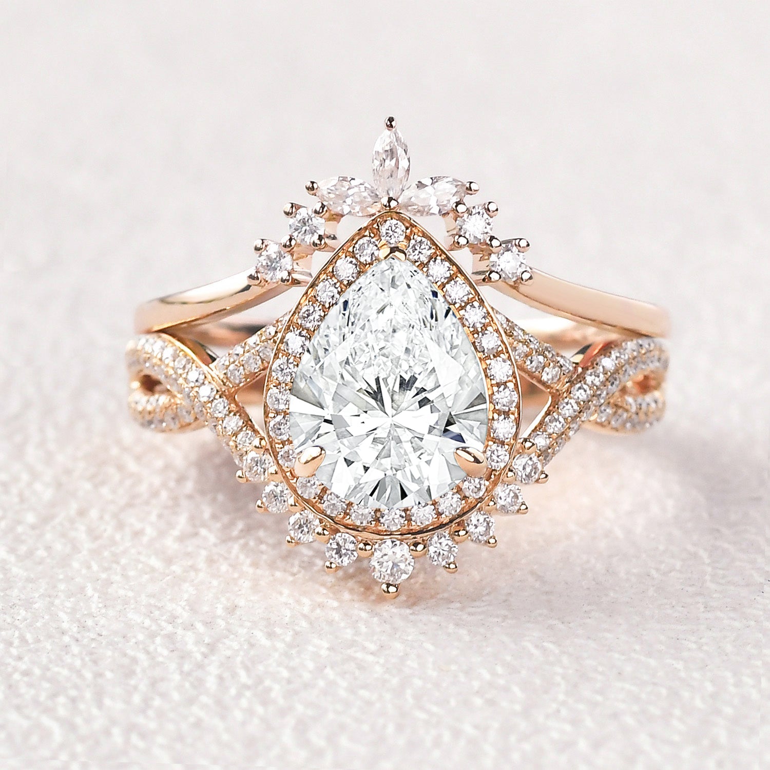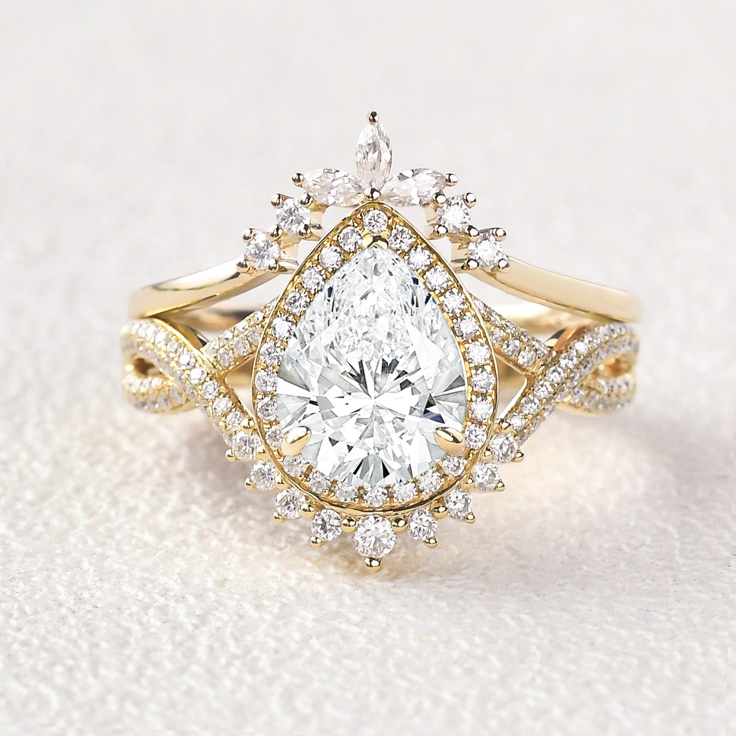 Felicegals 2.0ct Pear Shaped Lab Grown Diamond Infinity Gold Ring Set 2pcs Twisted Band Lab Diamond Halo Ring Anniversary Gift
