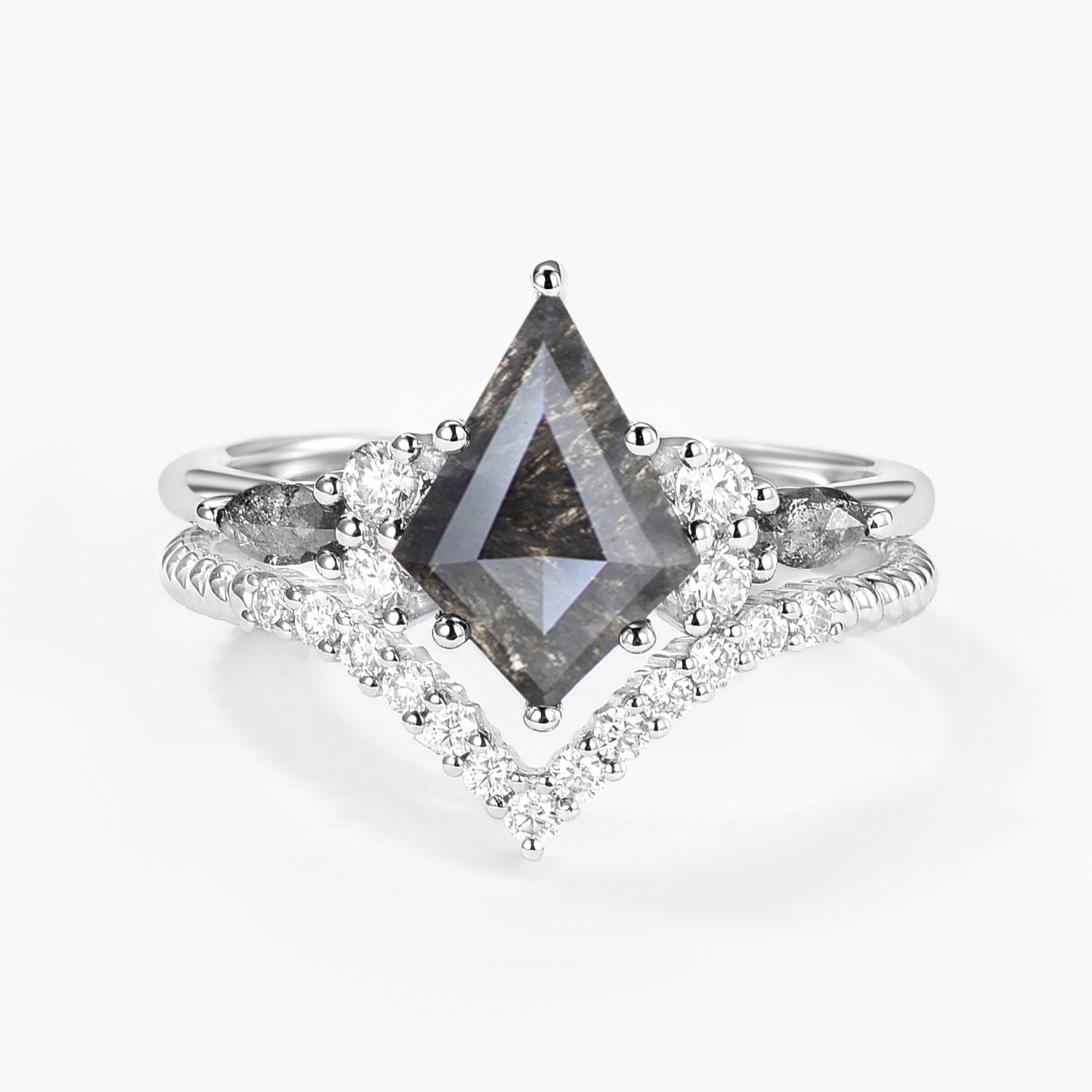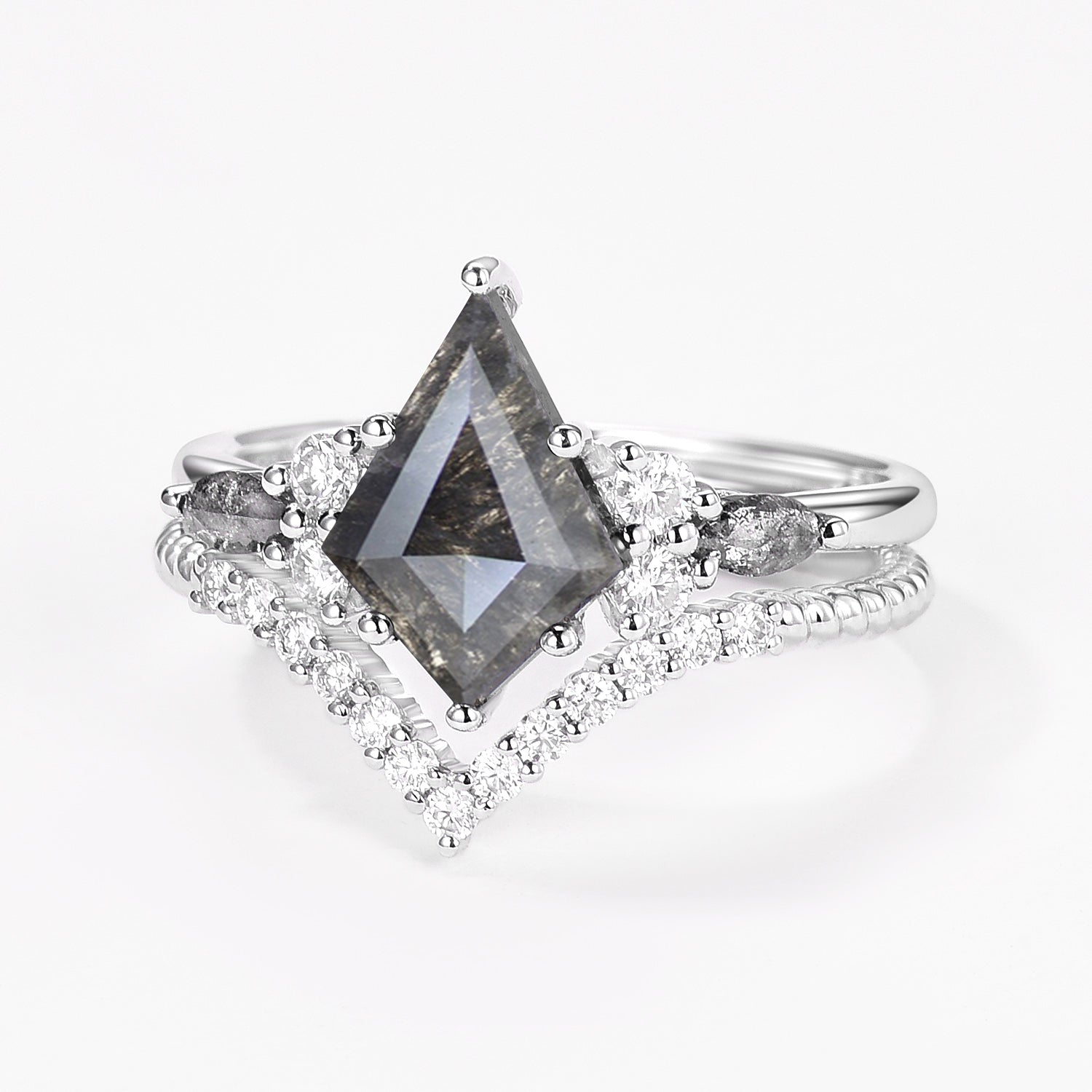 Dark Grey Kite Cut Salt and Pepper Diamonds Twist Engagement Ring Set 2pcs