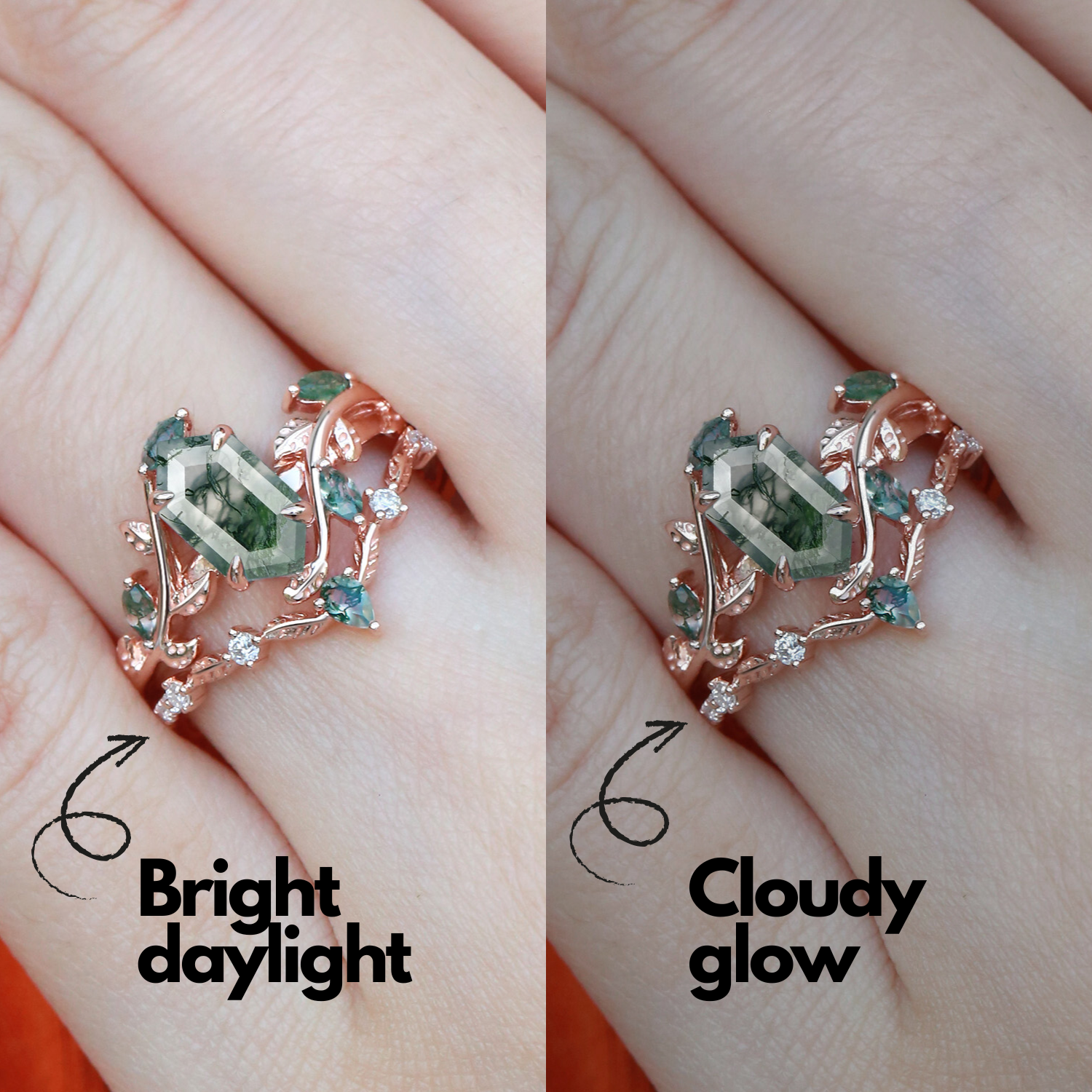 Green Moss Agate Long Hexagon Vine Engagement Ring Set 2pcs - Daphne