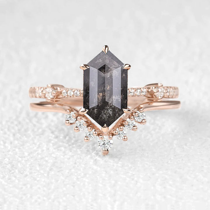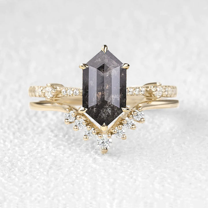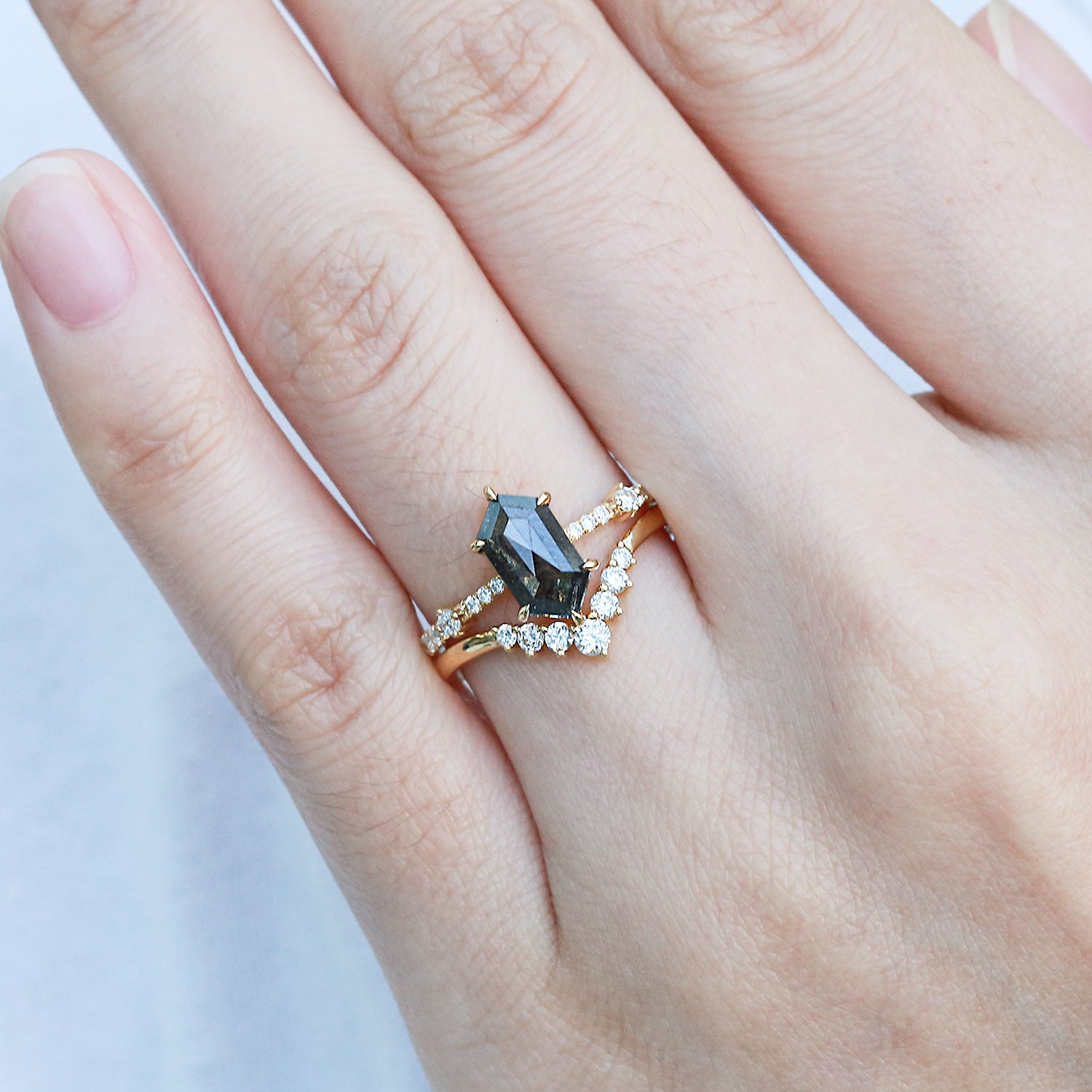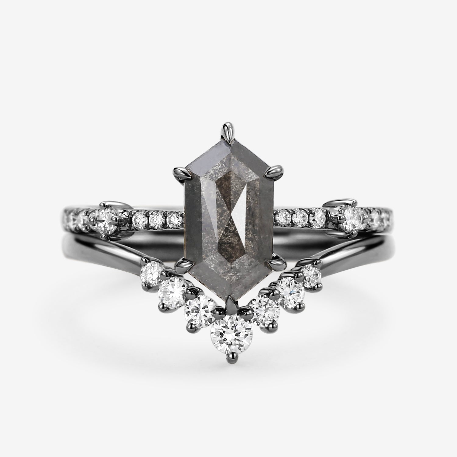 The Perfect Choice for the Modern Bride: Hexagon Black & White Salt and Pepper Diamonds Ring Set 2pcs Handmade engagement ring with matching stacking band Hexagon salt and pepper Diamond Ring