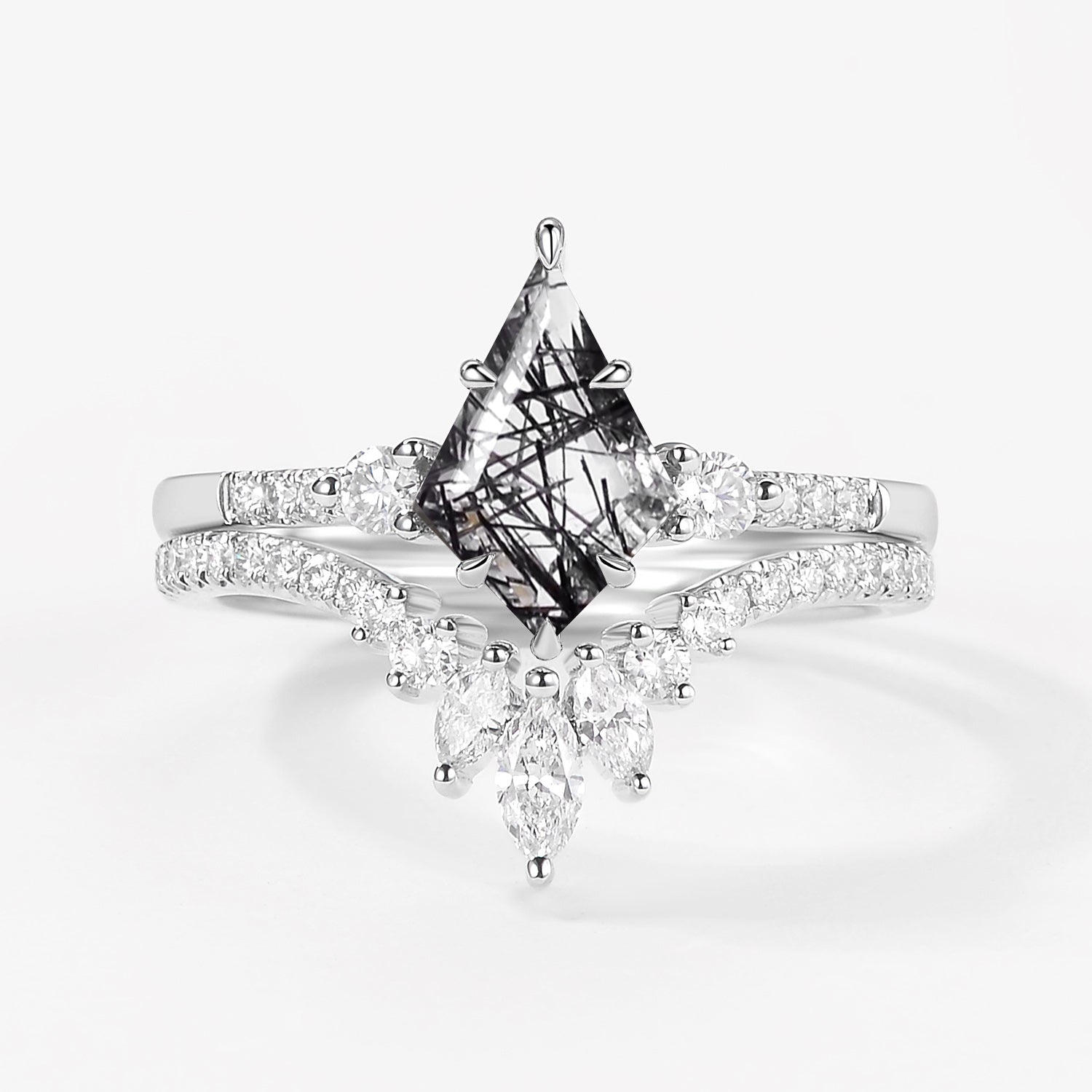 Kite Cut Black Rutilated Quartz Bridal Ring Set 2pcs