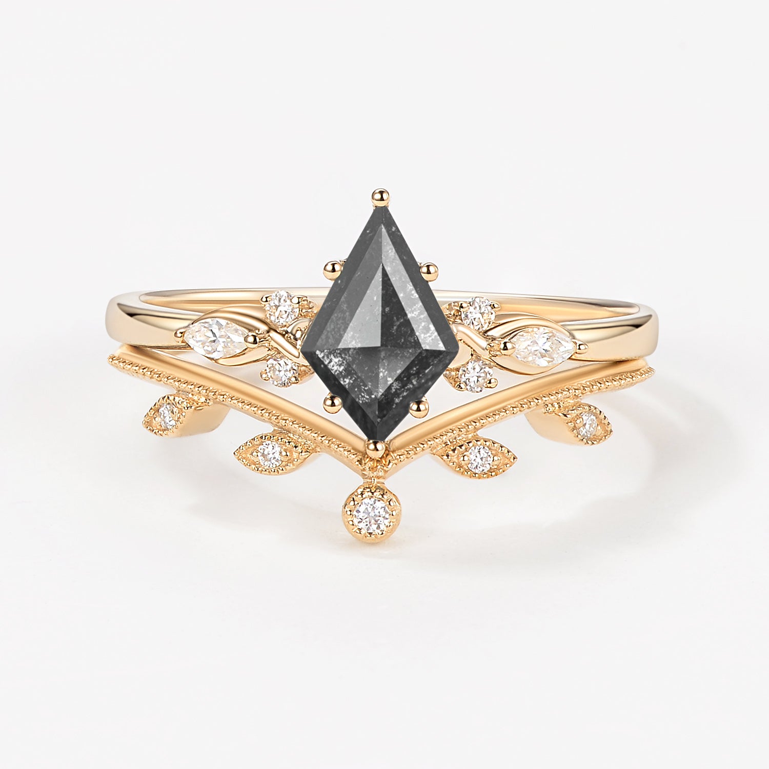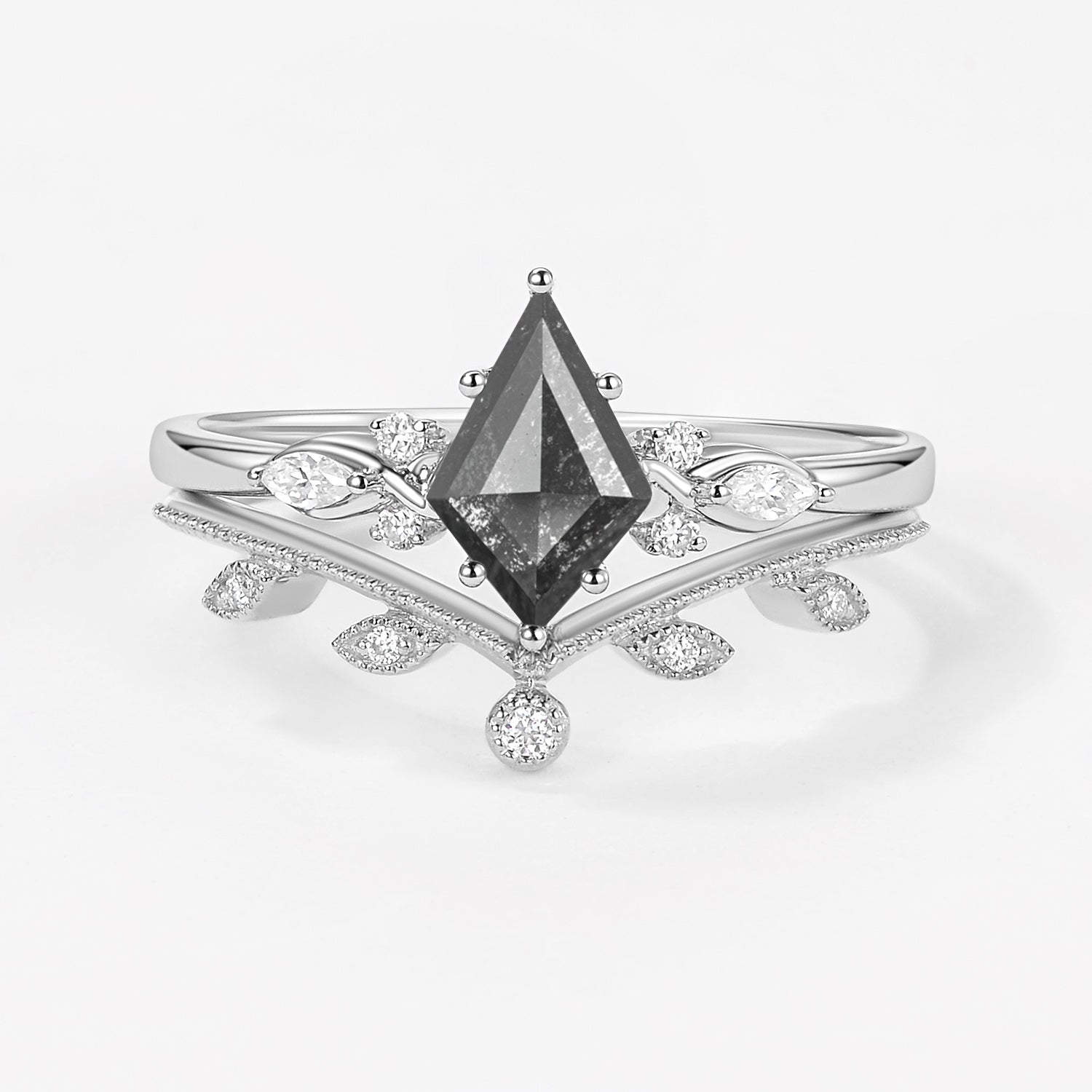 Kite Cut Salt & Pepper Diamonds Leafy Engagement Ring Set 2pcs