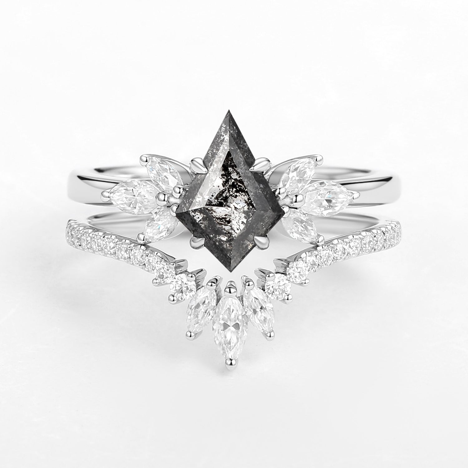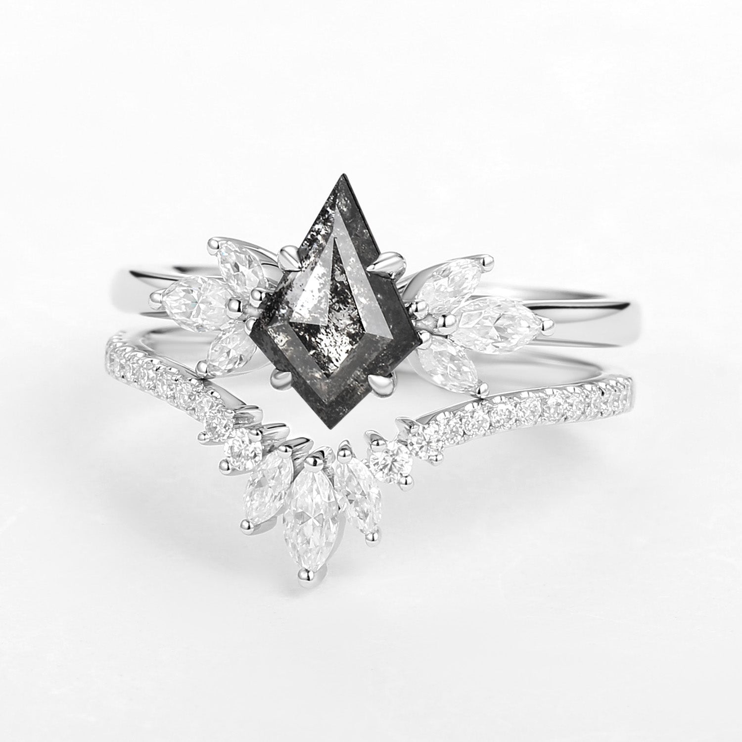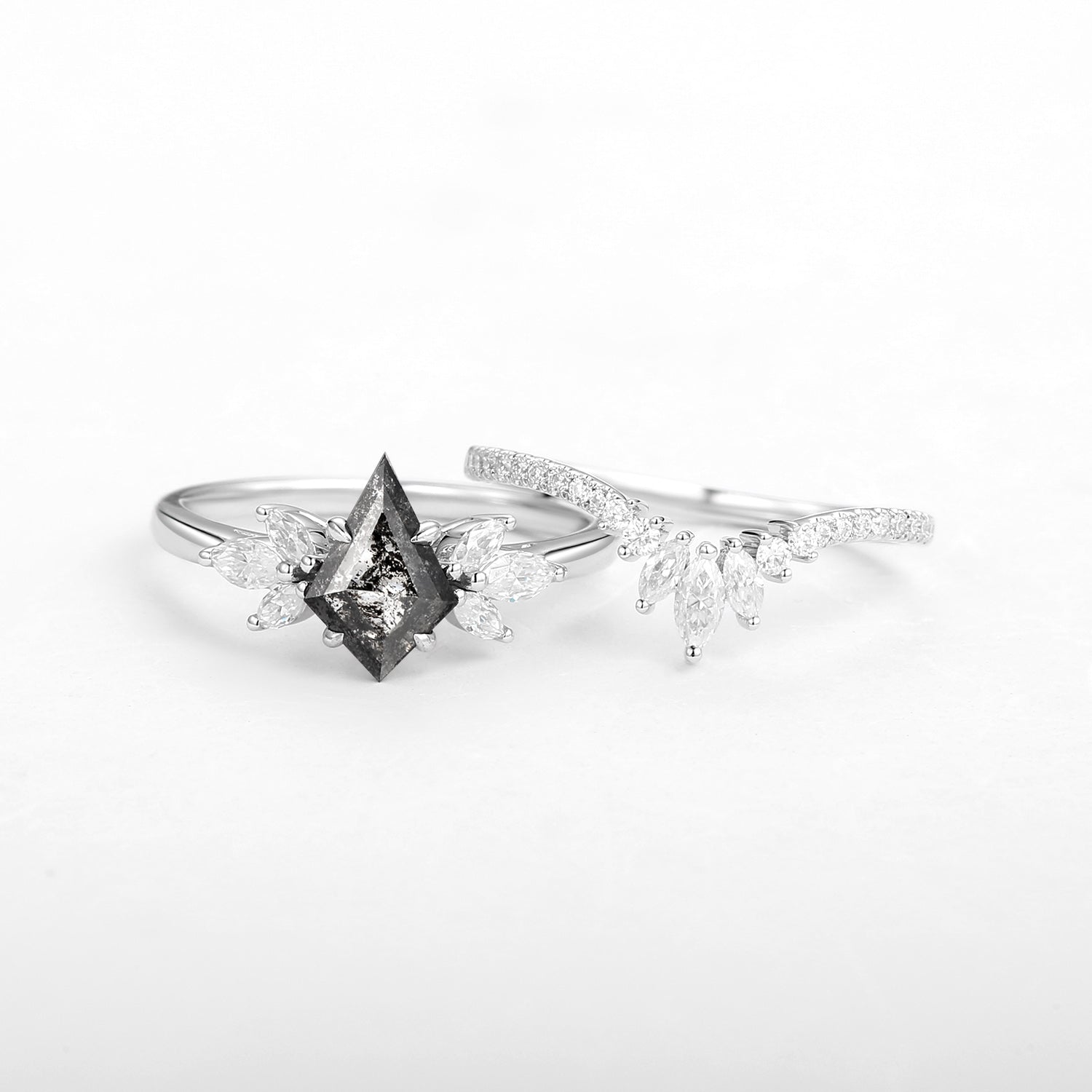 Felicegals kite Shape Engagement Diamond Ring Salt and Paper Diamond Floral Ring Natural Diamond Ring Set 2PCS Salt and Pepper Engagement Unique Kite Ring