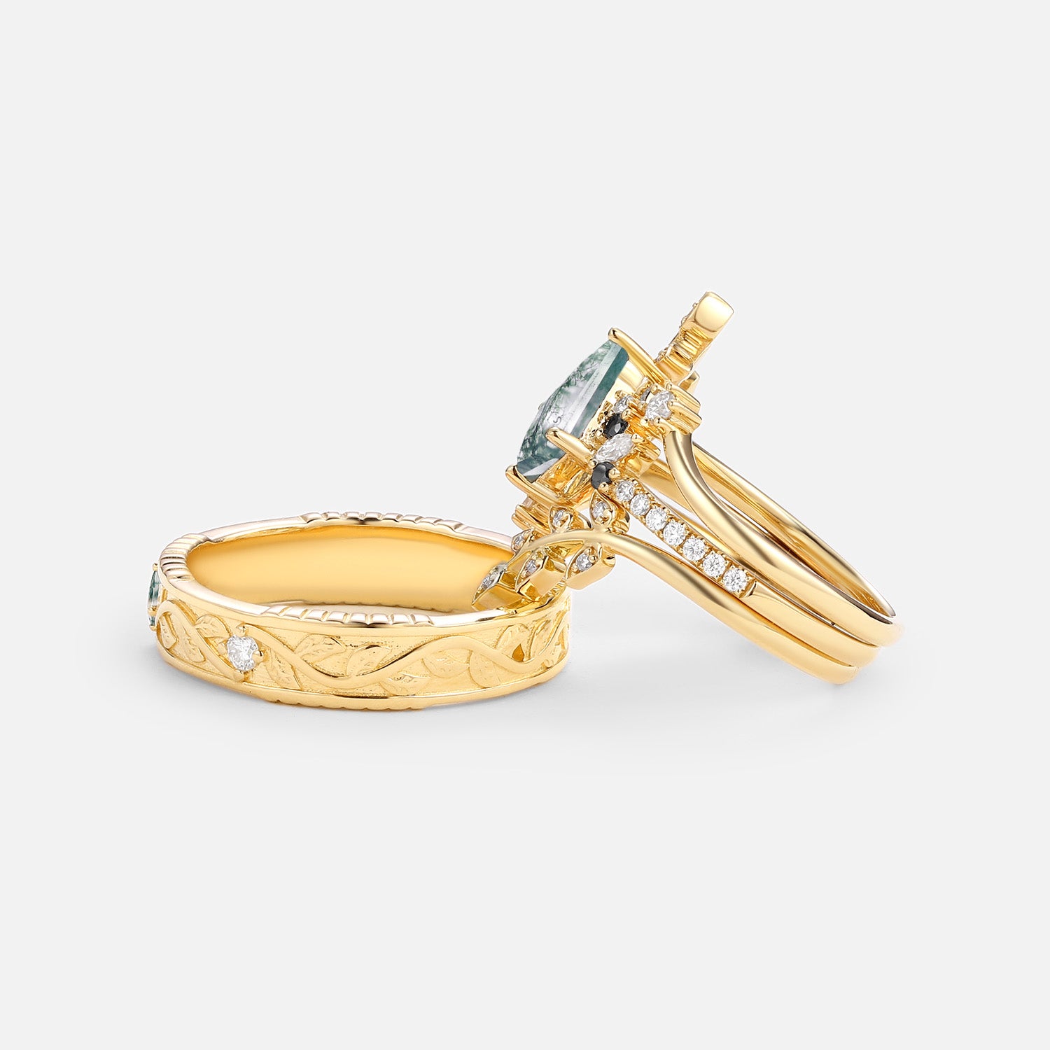 Leafy Kite Cut Moss Agate & Black Moissanite Couple Ring Set 4pcs