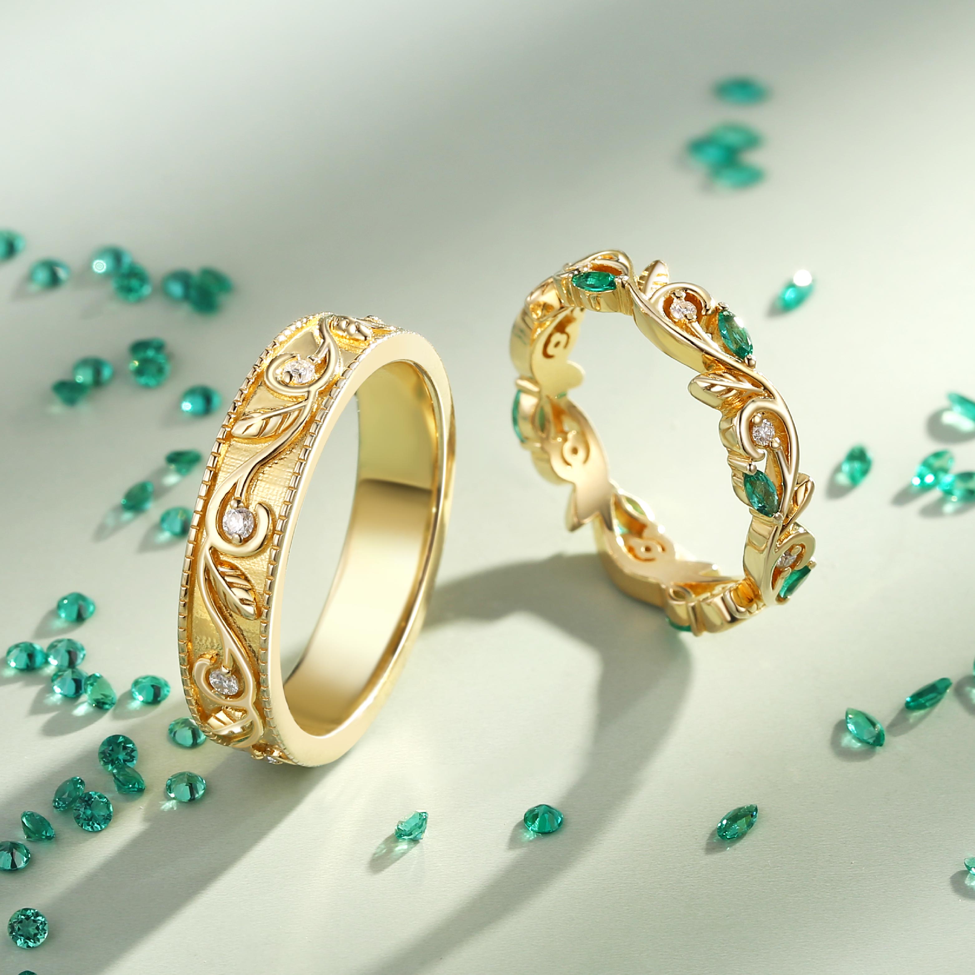 Leafy Moissanite & Lab Emerald Couple Ring Set 2pcs - Lila