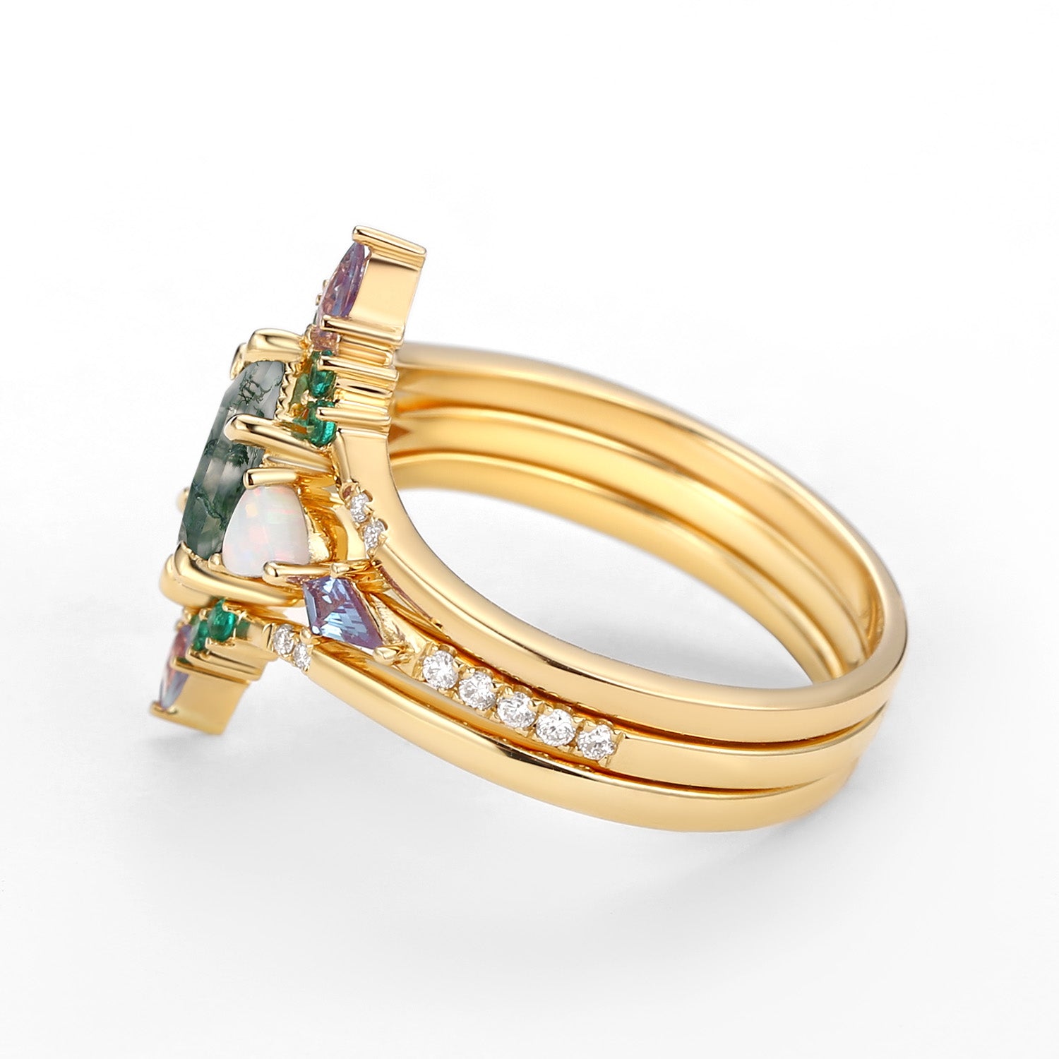 Long Hexagon Moss Agate & Opal & Alexandrite & Emerald Engagement Ring Set 3pcs - Max