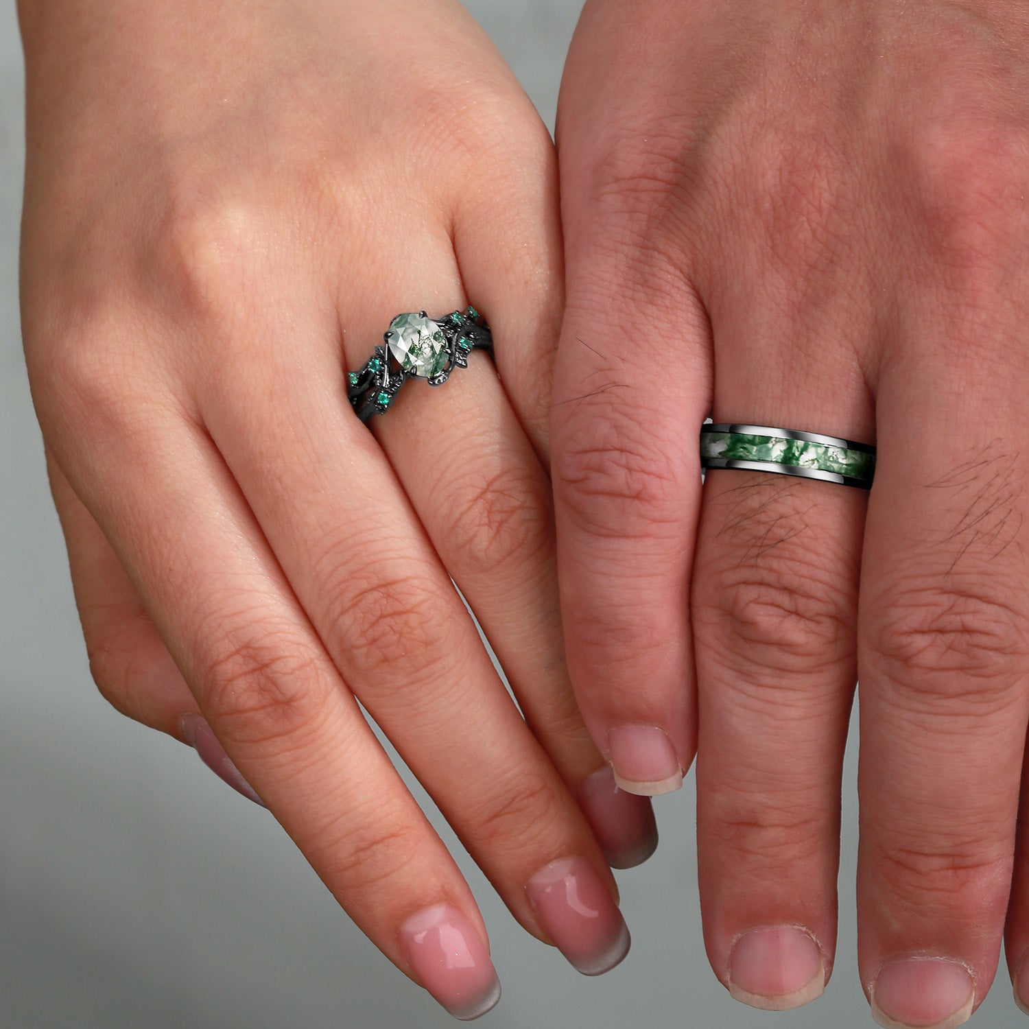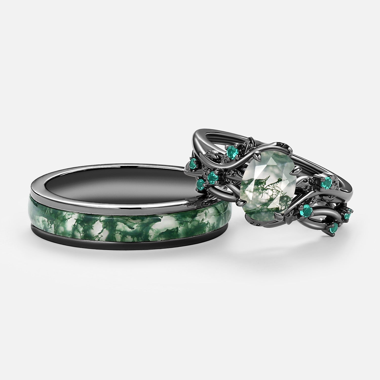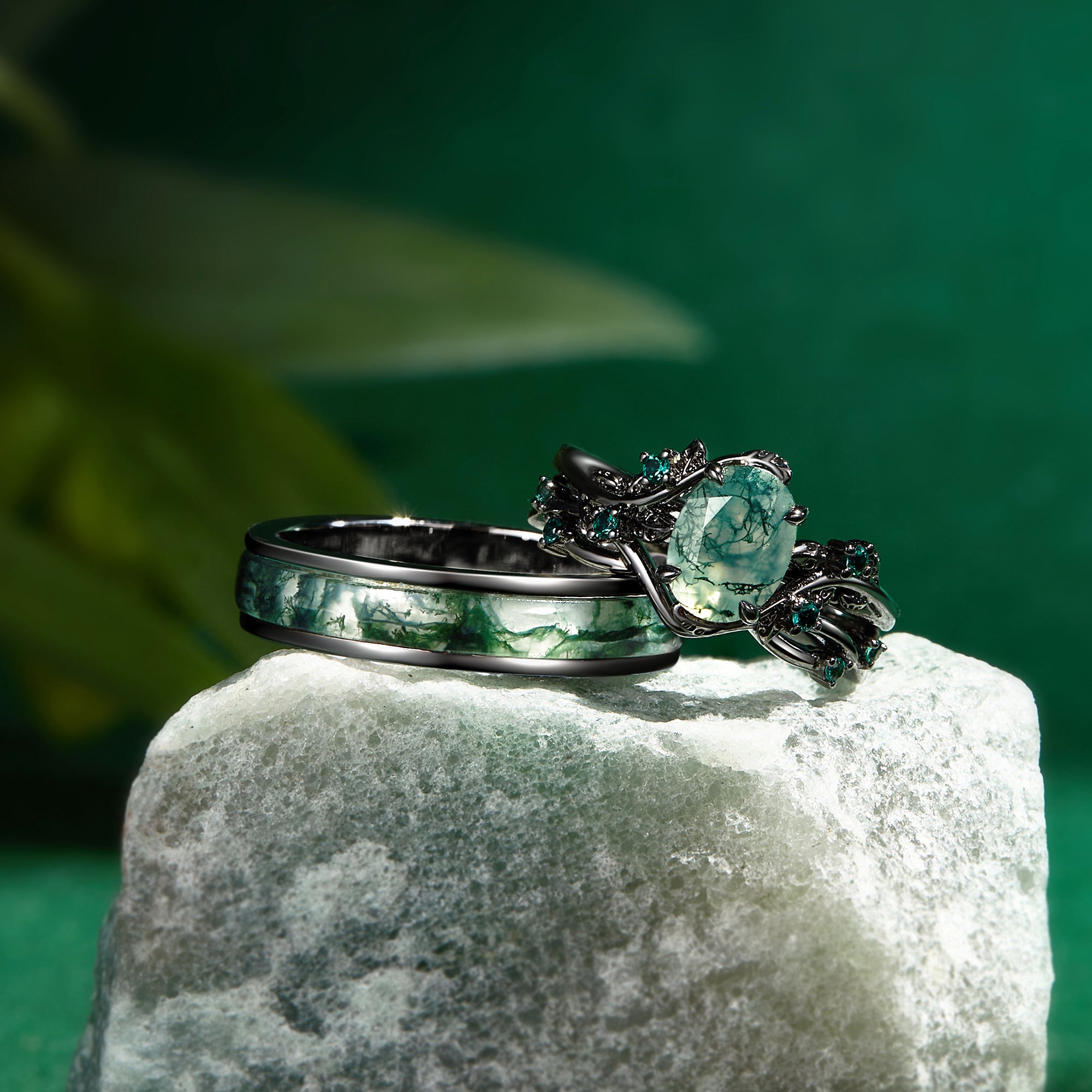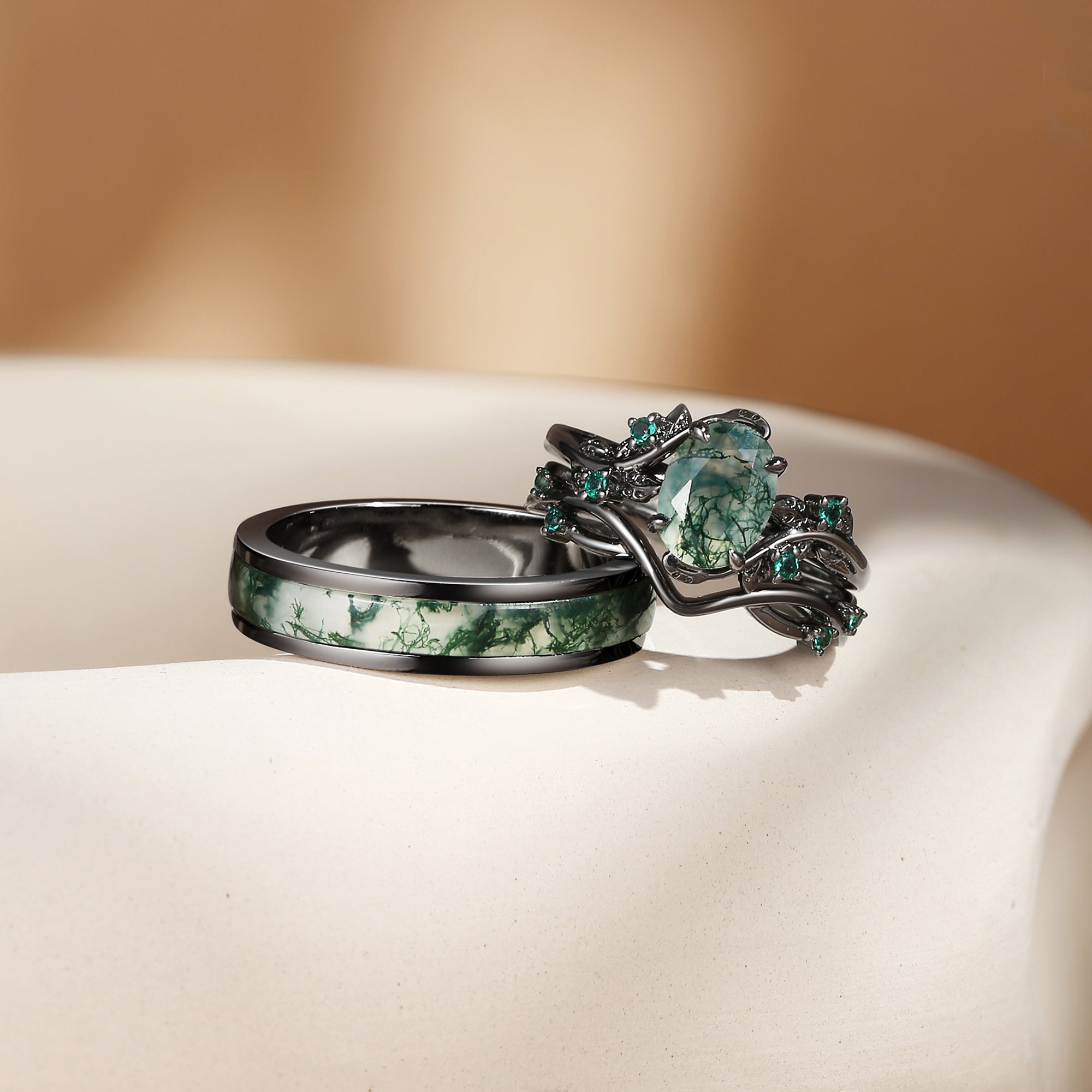 Nature Inspired - Oval Cut Moss Agate Leafy Black Gold Couple Ring Set 3pcs - Mossy