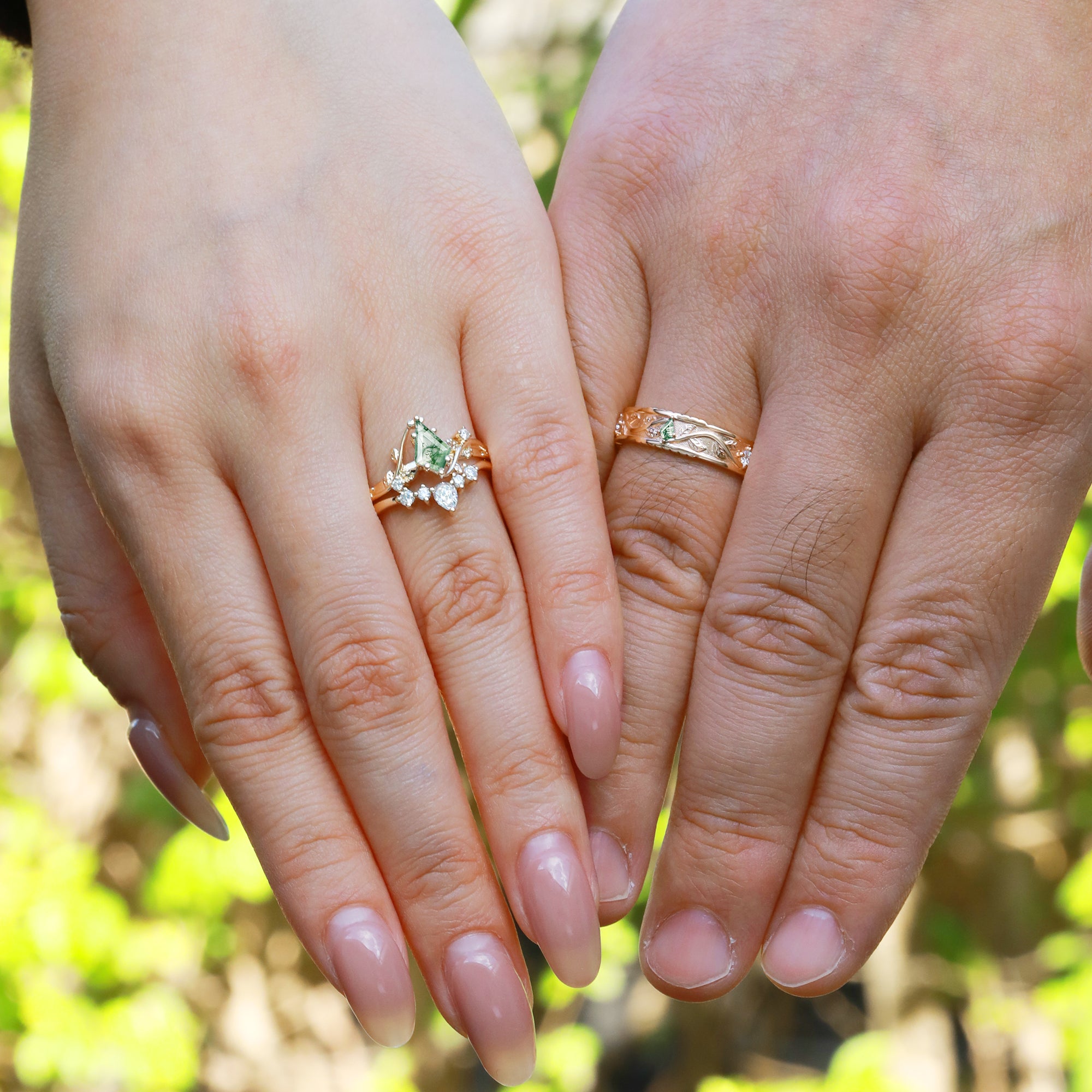 Nature Inspired - Unique Kite Cut Moss Agate Leafy Couple Ring Set 3pcs - Willow