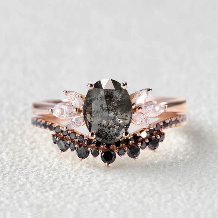 Oval Cut Salt and Pepper Diamonds & Black Moissanite Engagement Ring Sets 2pcs