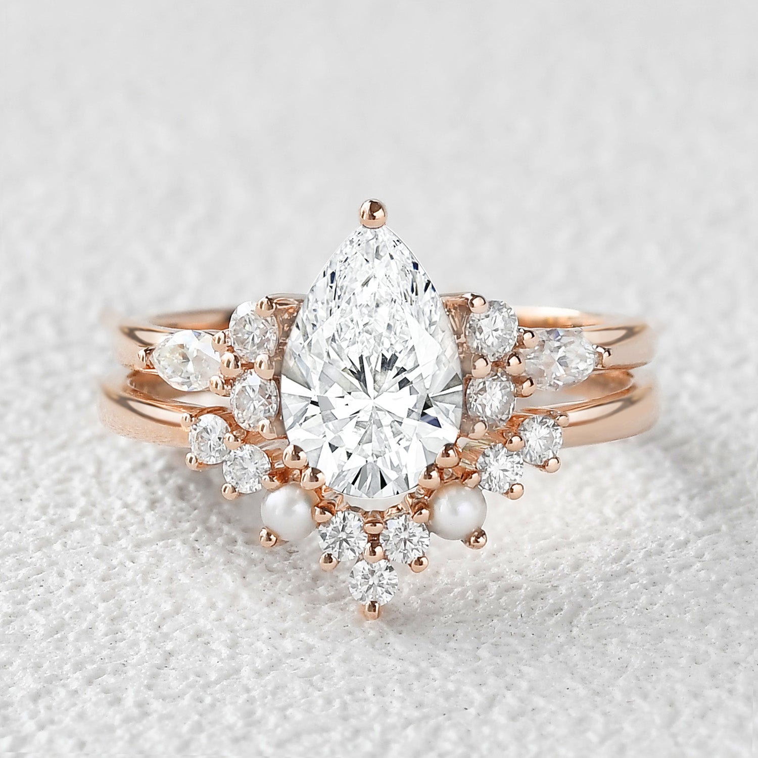 Pear Cut Lab Grown Diamond & Pearl Cluster Ring Set 2pcs