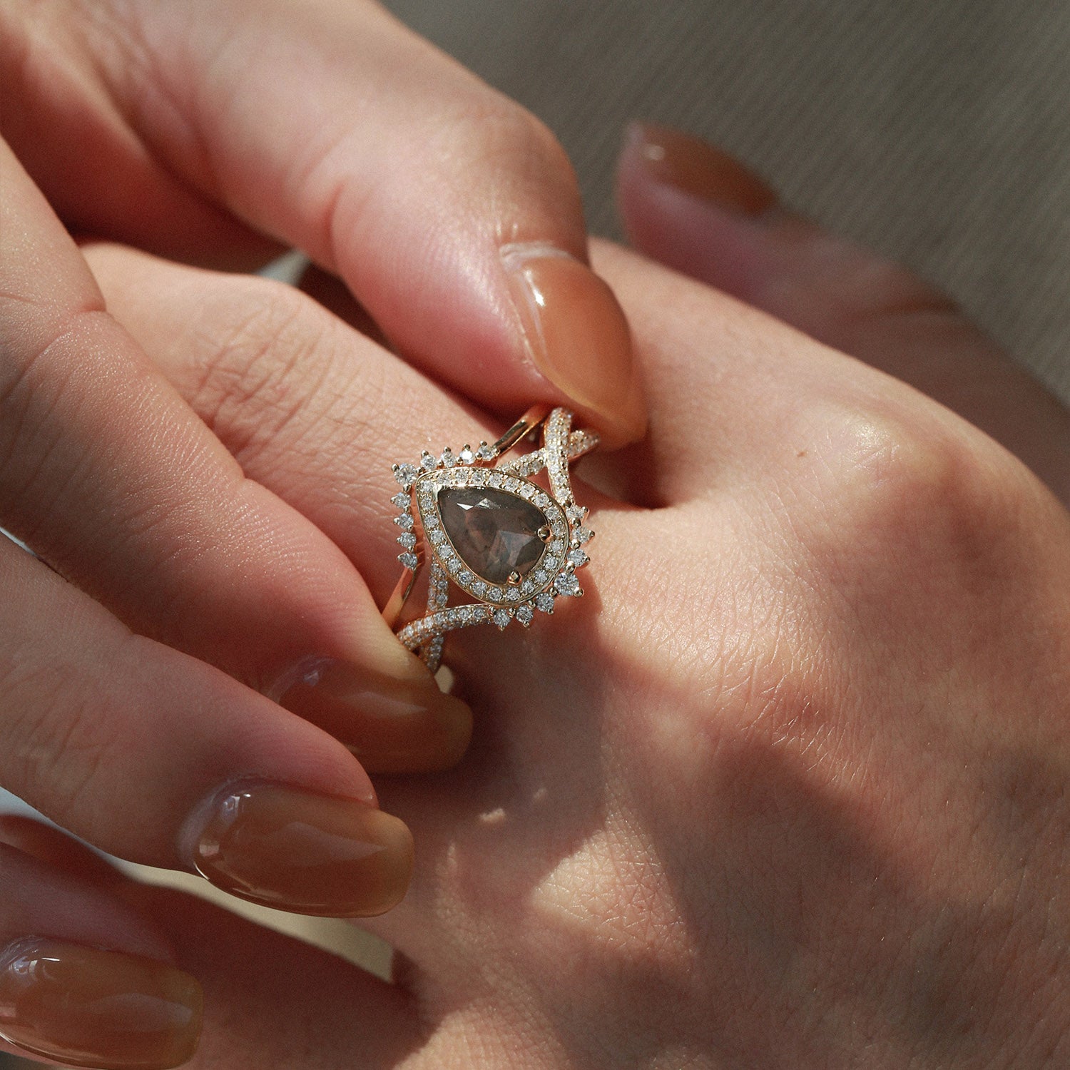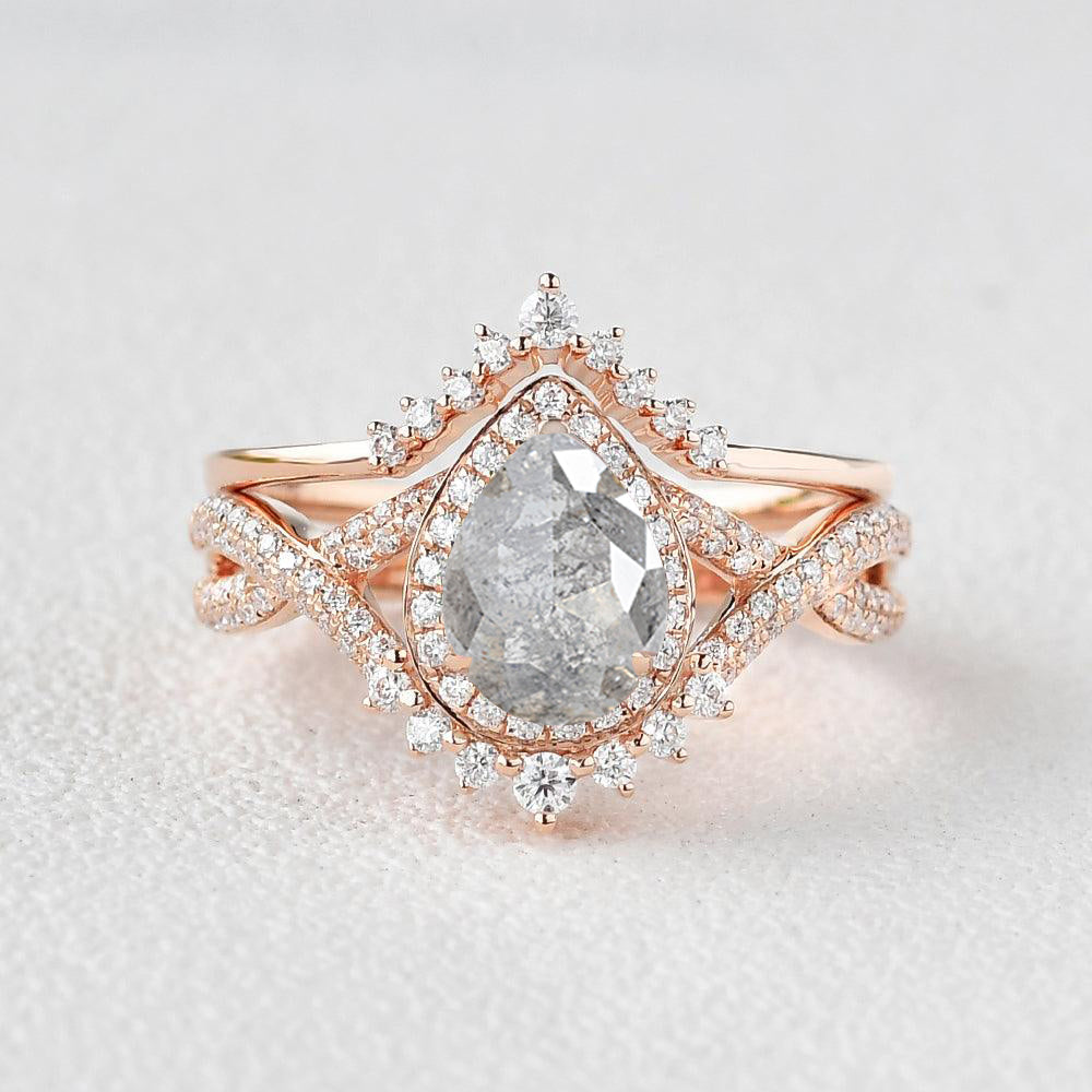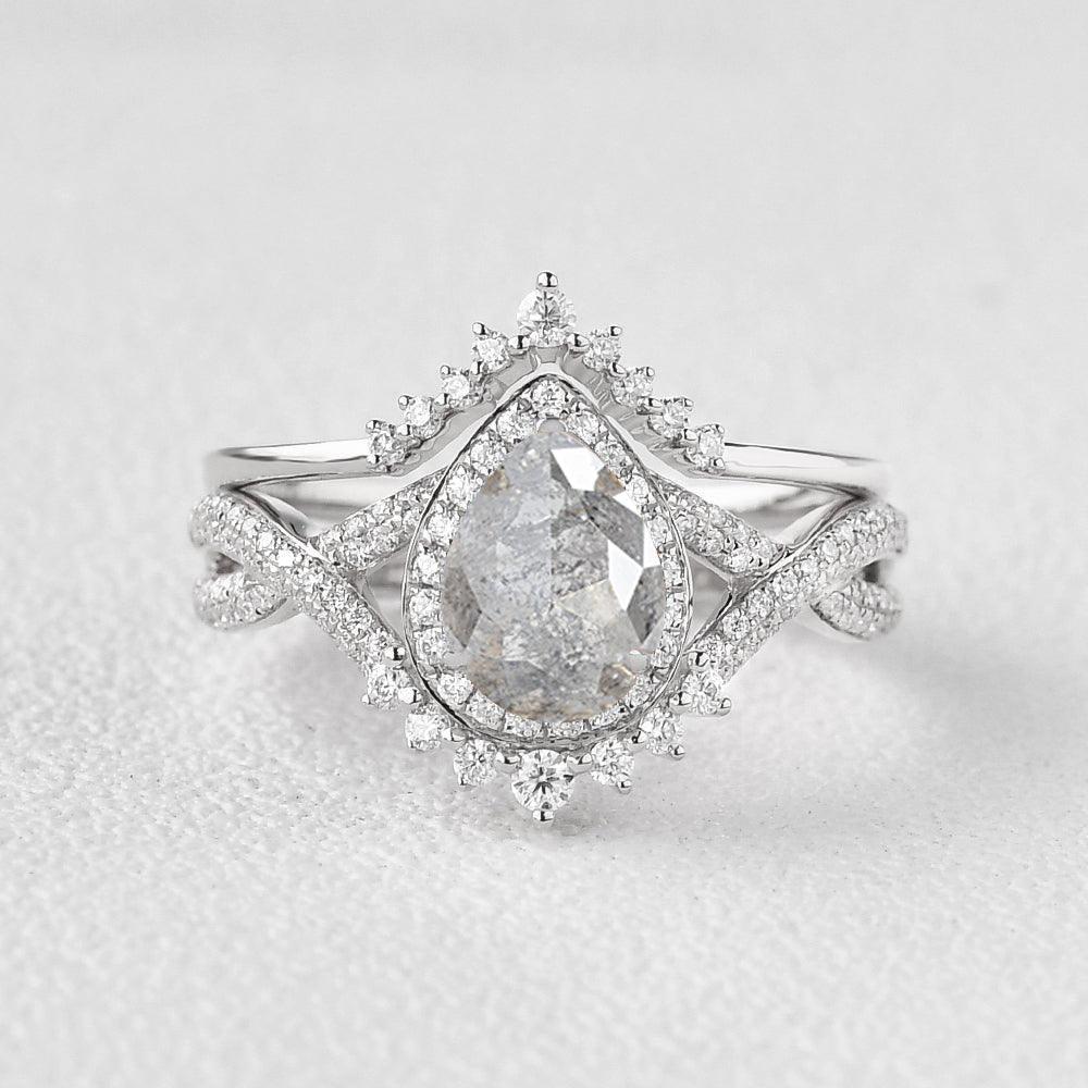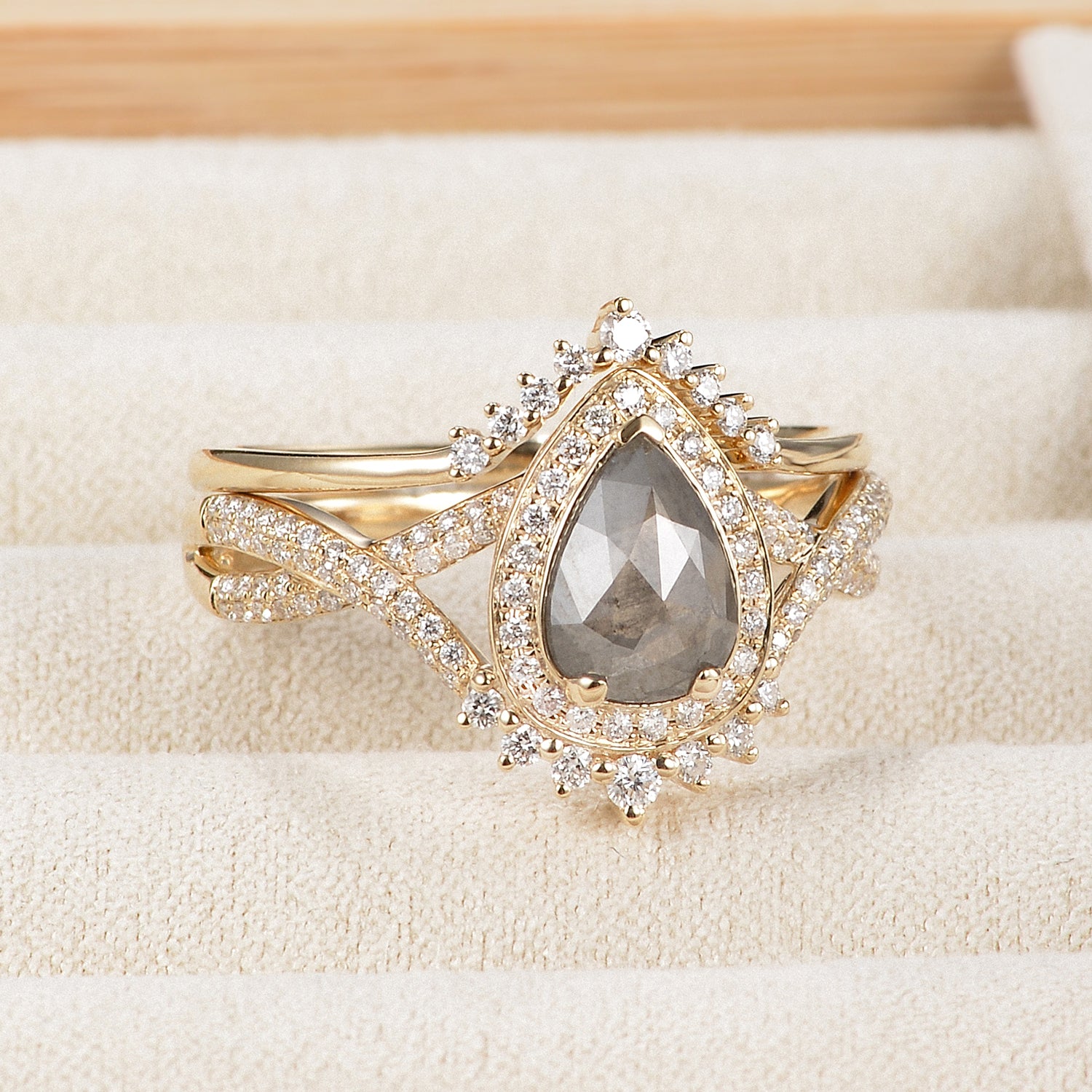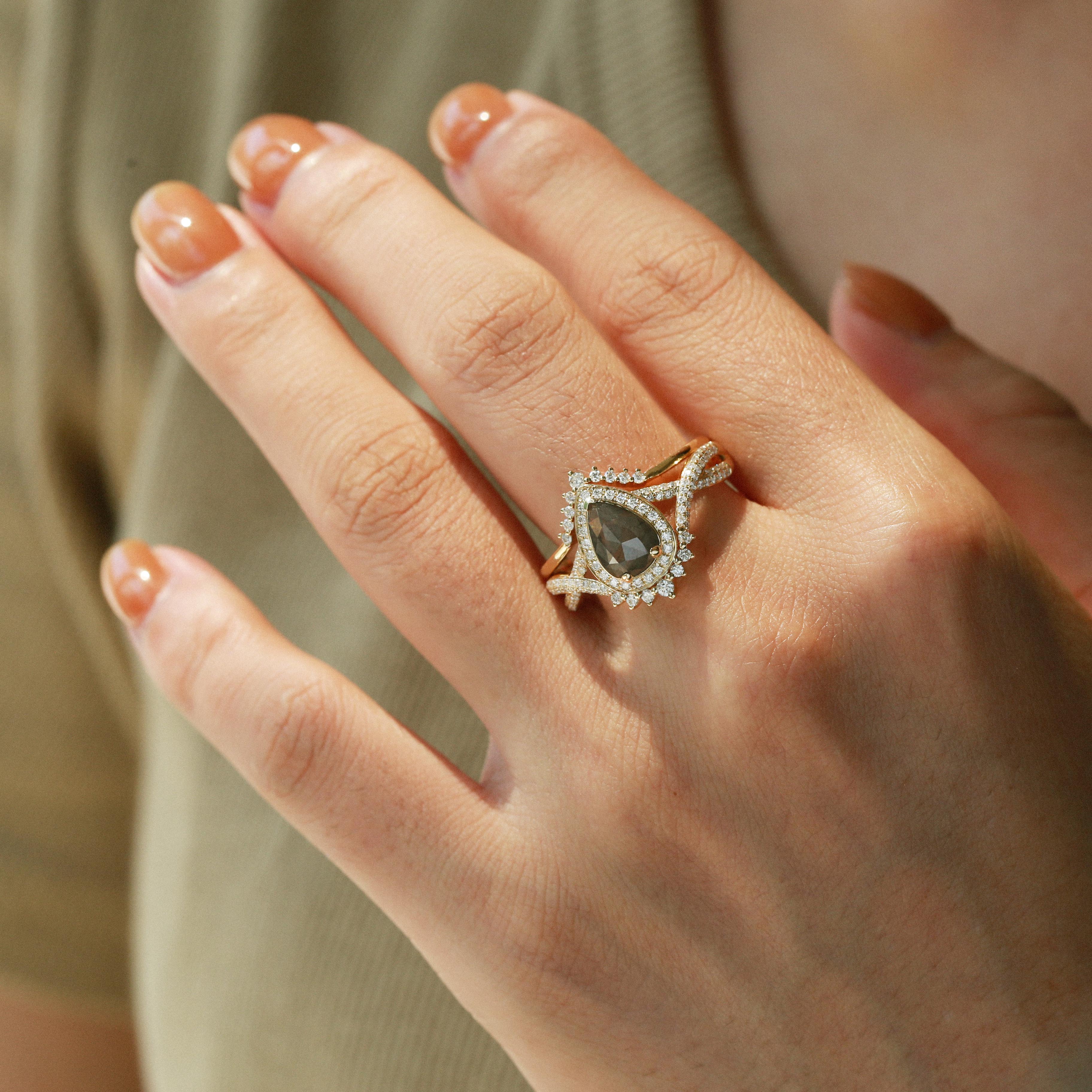 Pear Shaped Salt and Pepper Diamonds Vintage Halo Infinity Ring Set 2pcs - Valentina