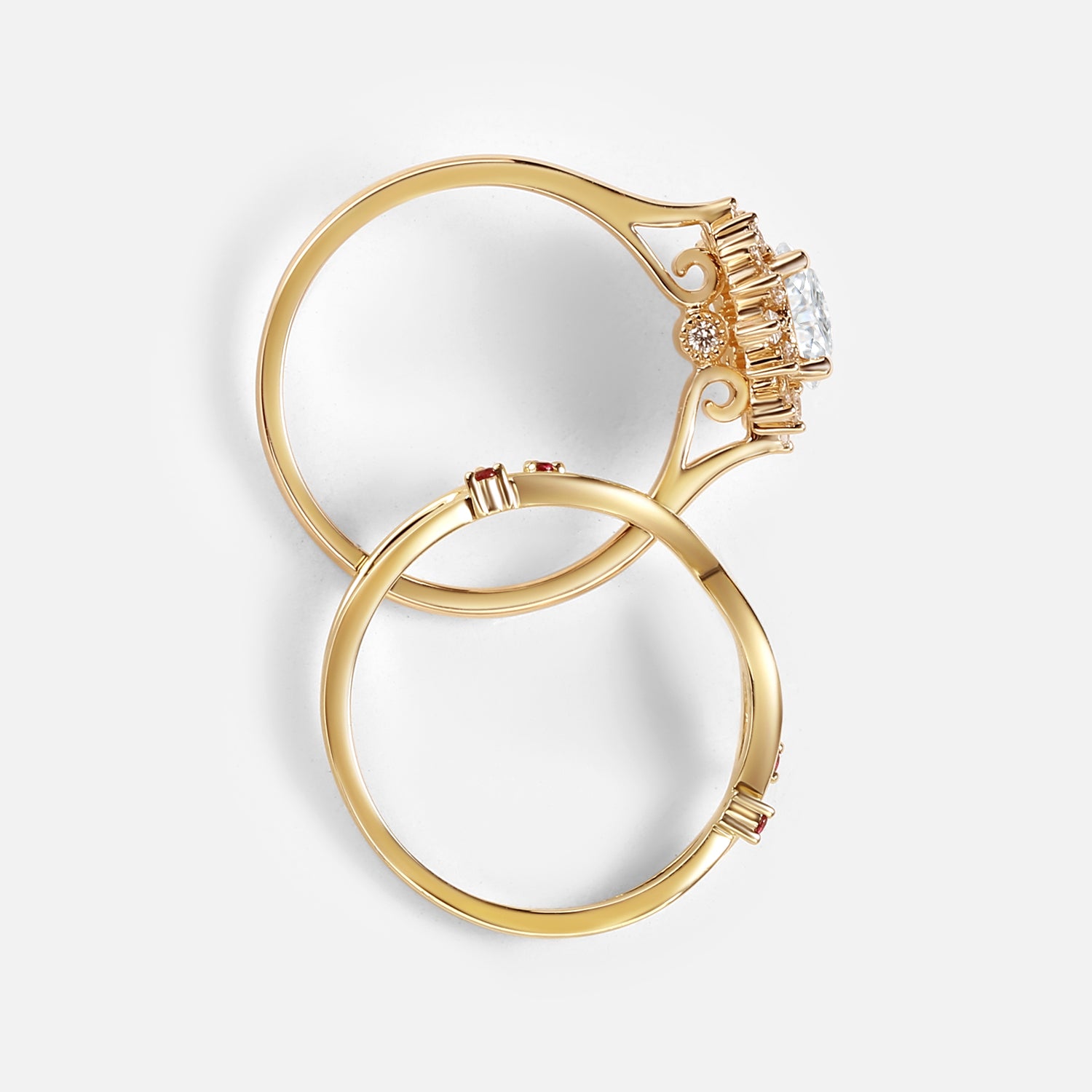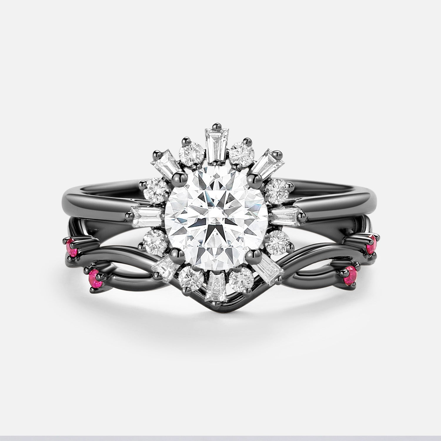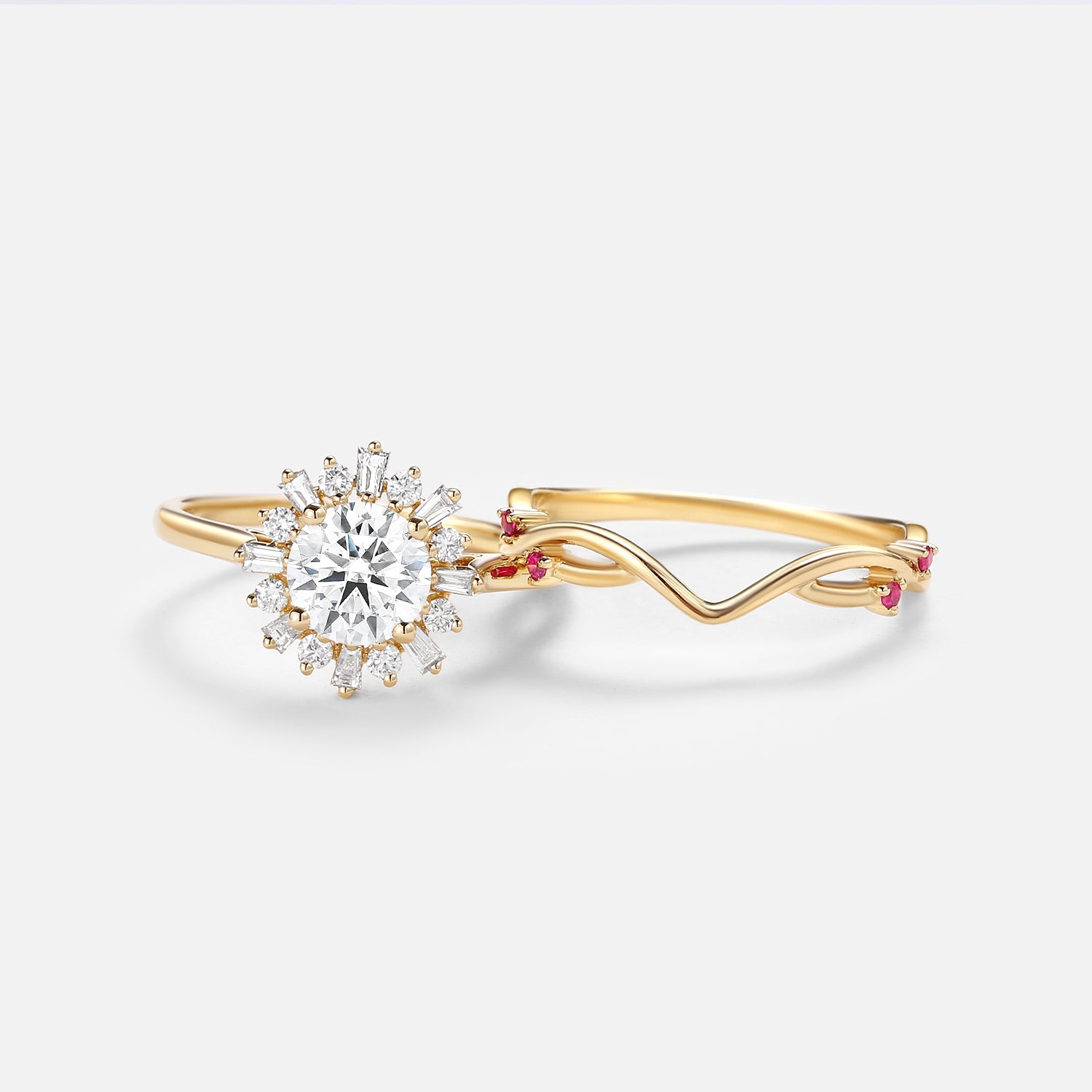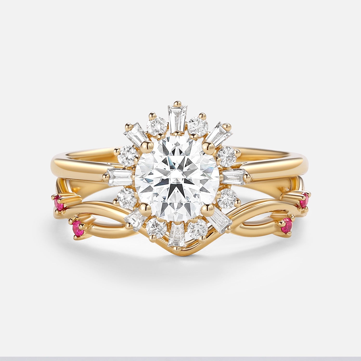 Round Moissanite & Ruby Halo Floral Ring Set 2pcs - Sol