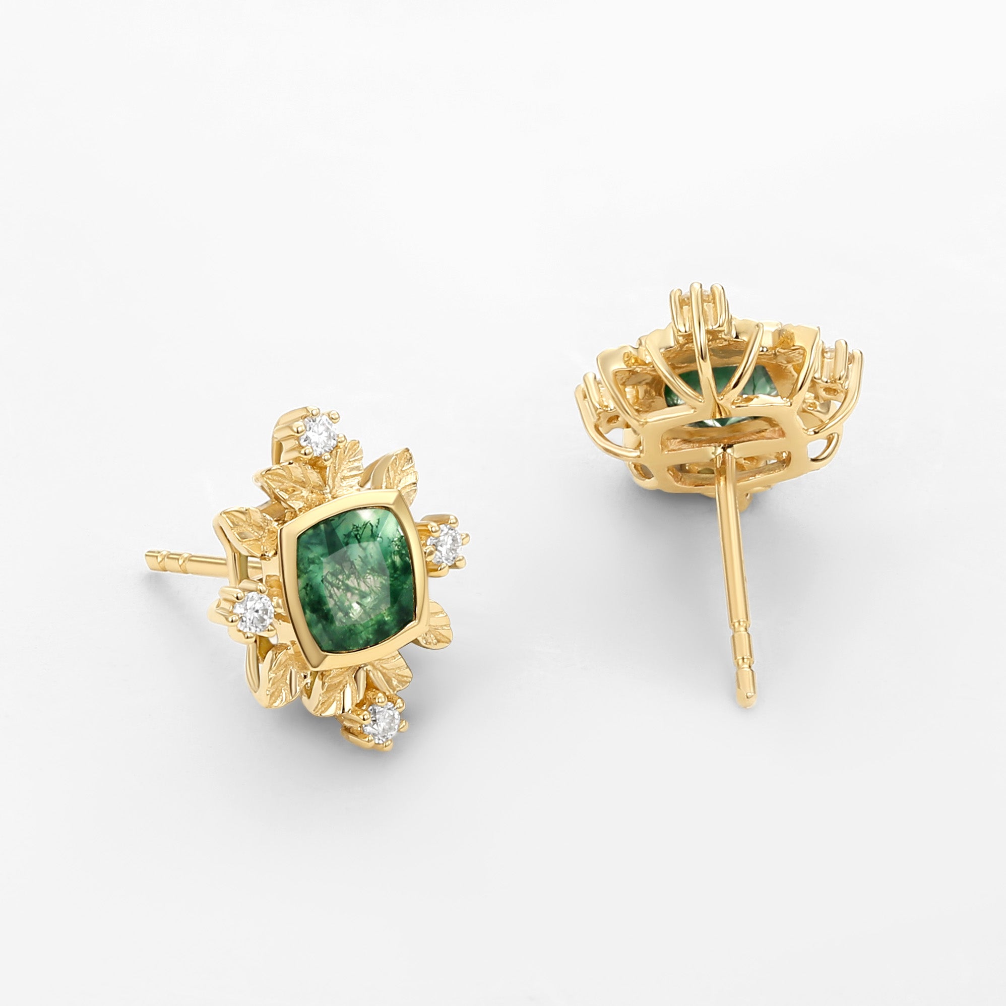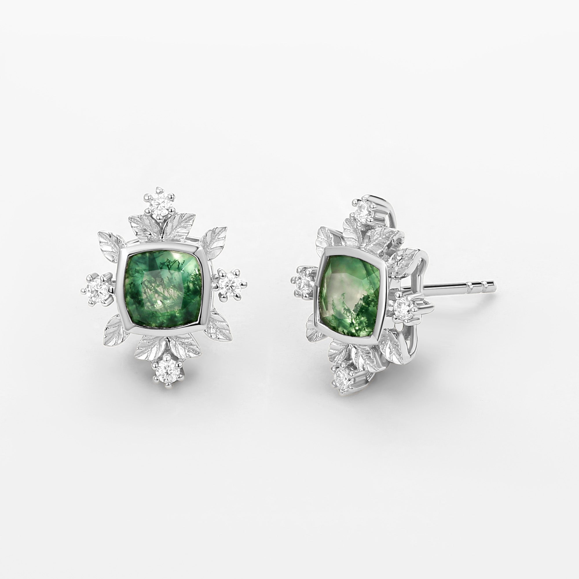 Cushion Cut Moss Agate & Moissanite Leafy Studs Set 2pcs