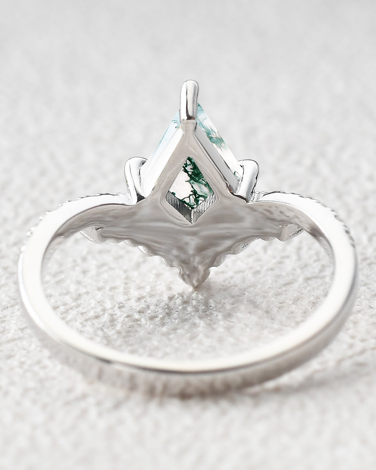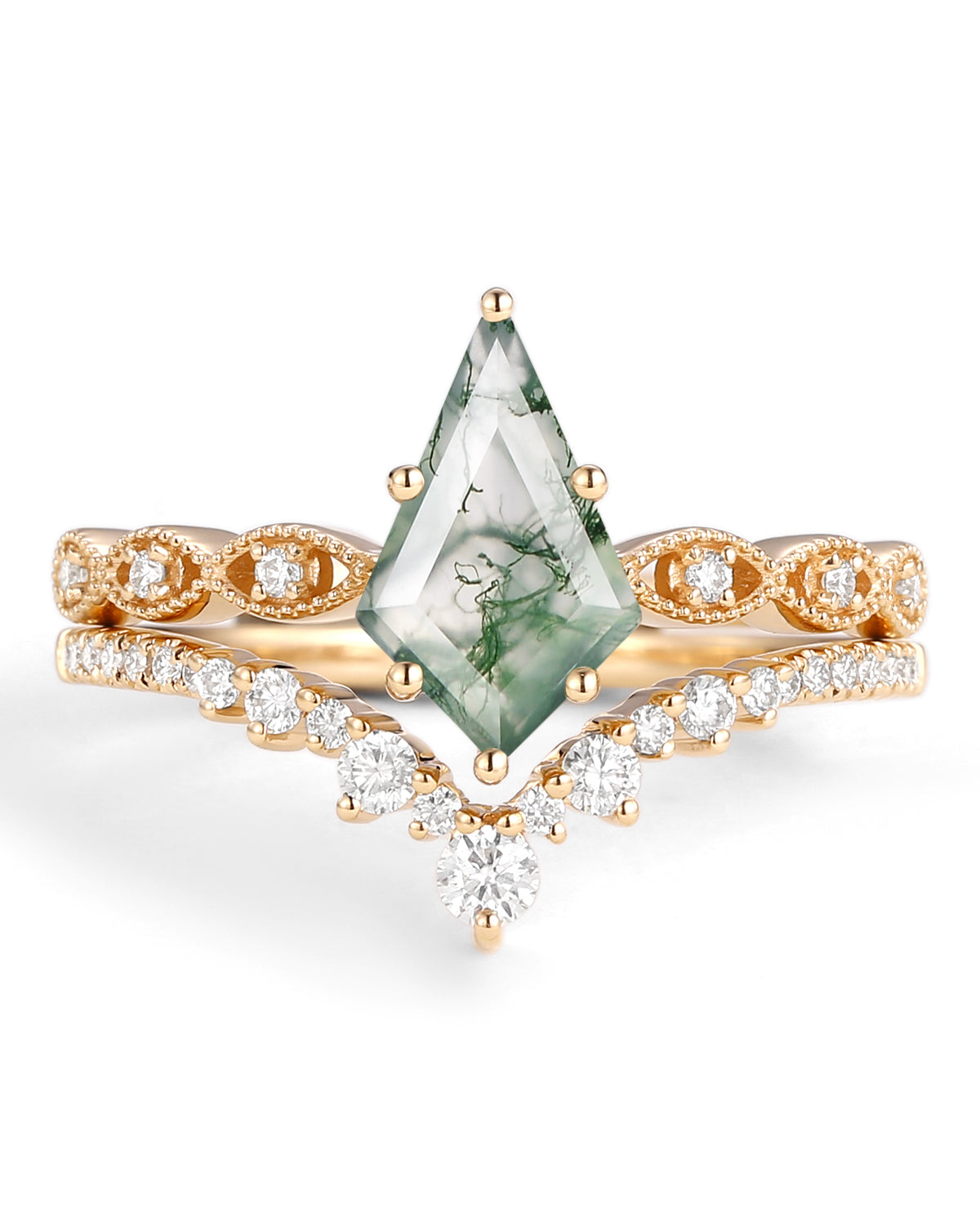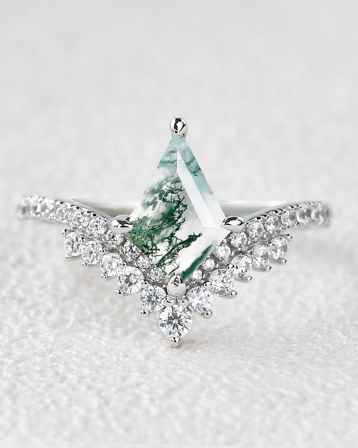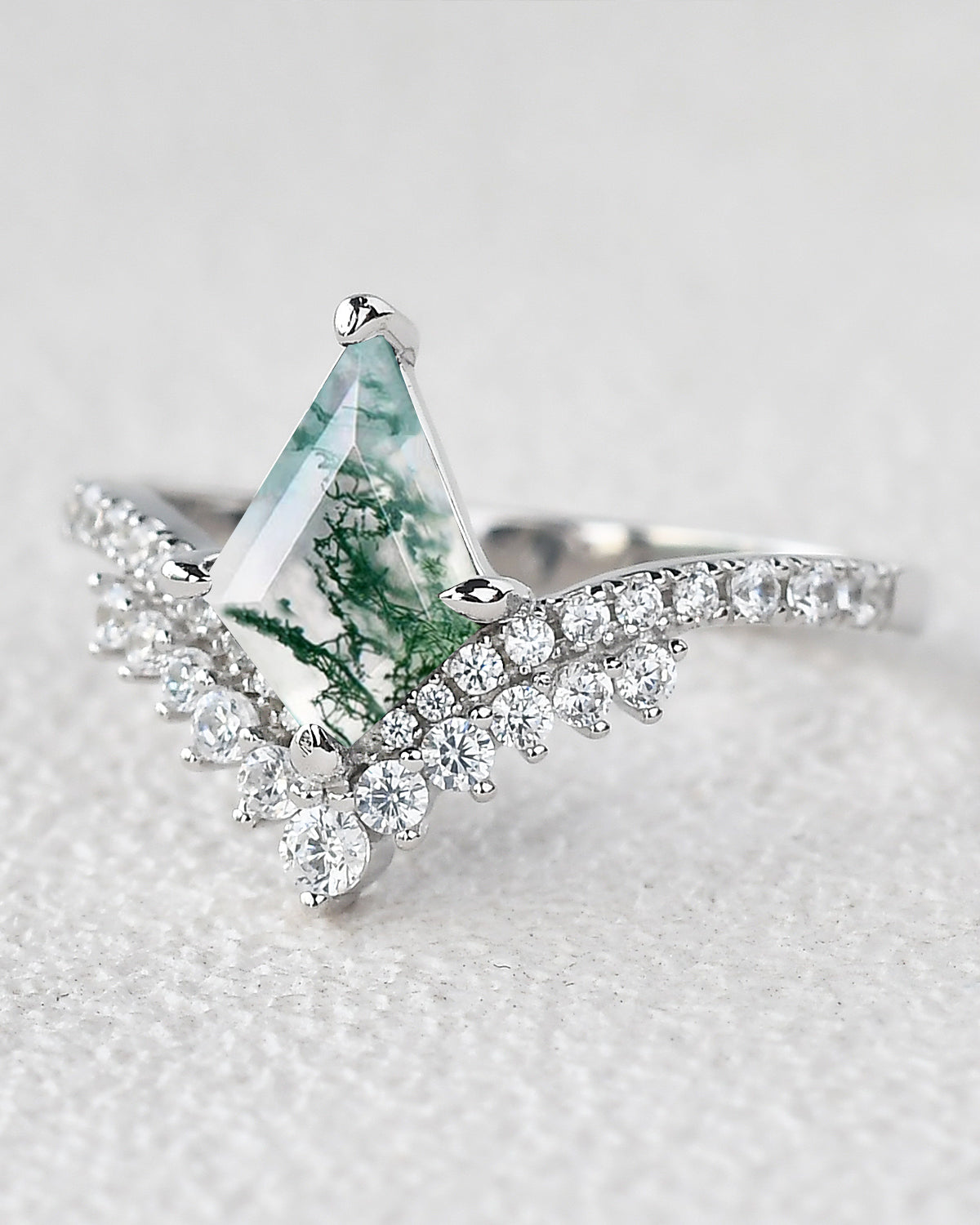 Our Love Kite collection features a variety of kite cut engagement rings, each with its own unique personality and style. The Moss Agate Kite Shape Engagement Ring, the moissanite rings and the Kite Salt and Pepper Diamond Ring are popular rings in our kite engagement ring.