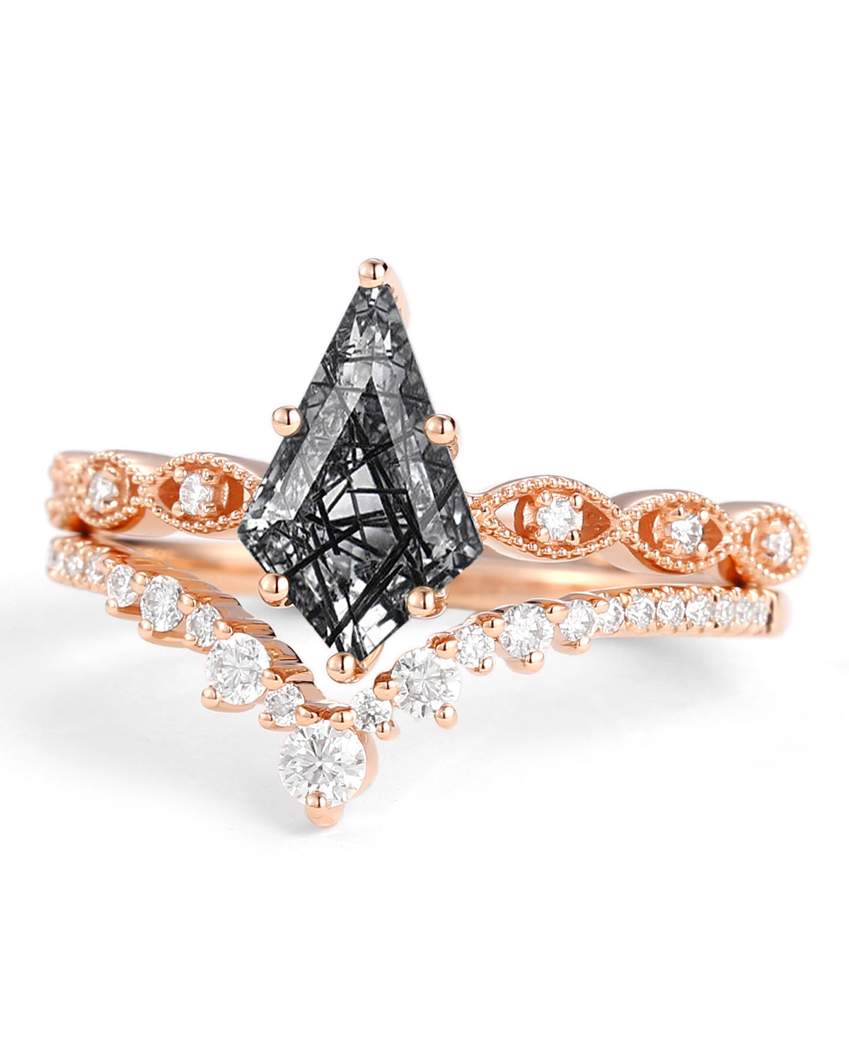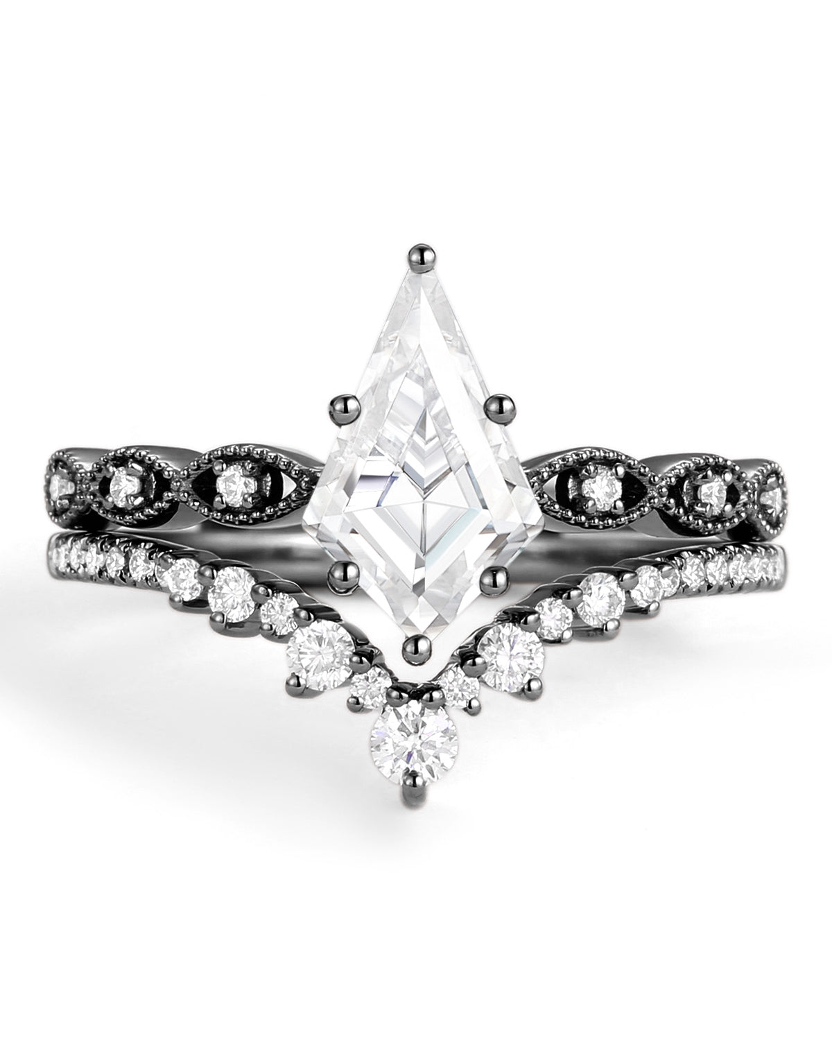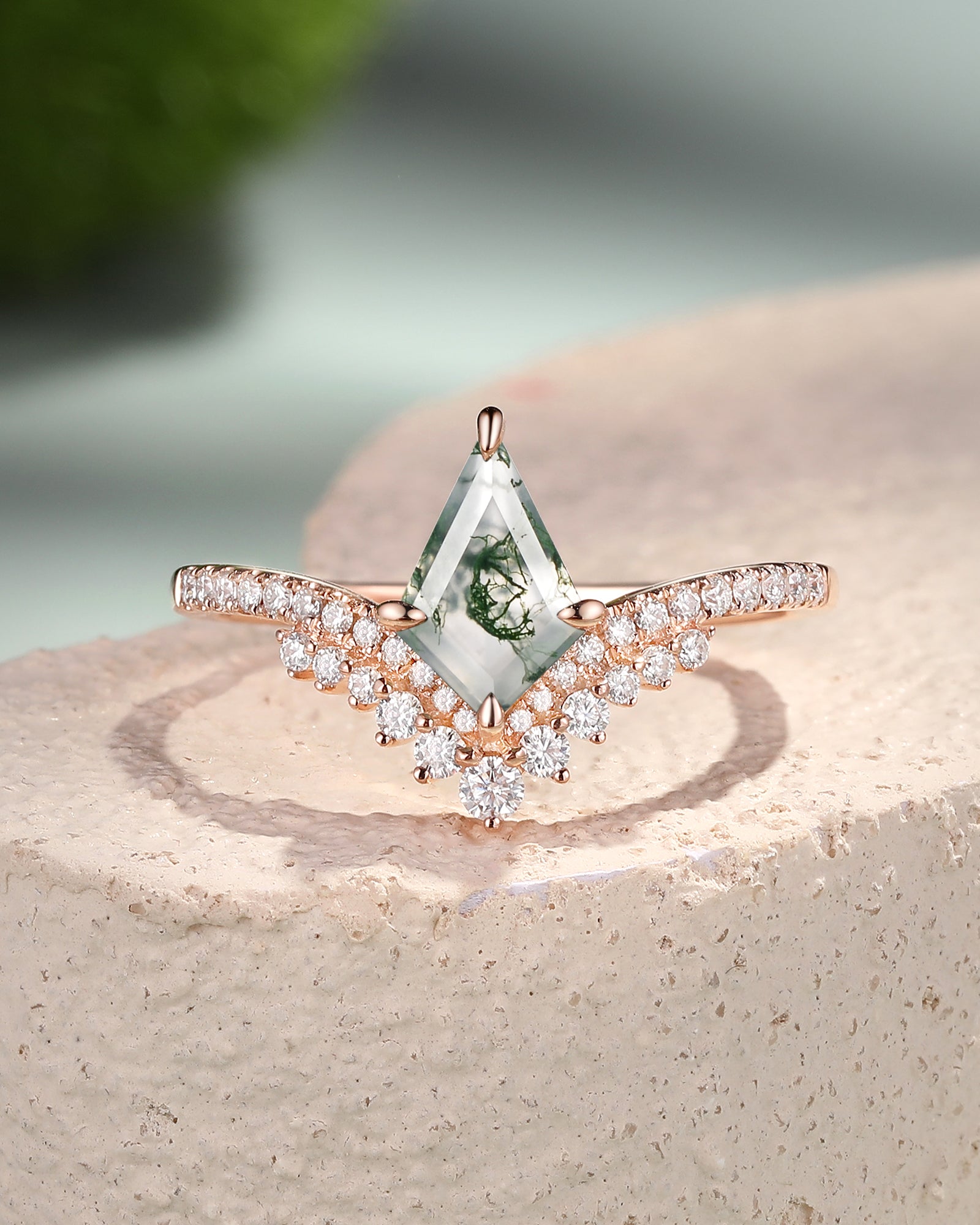 Our Love Kite collection features a variety of kite cut engagement rings, each with its own unique personality and style. The Moss Agate Kite Shape Engagement Ring, the moissanite rings and the Kite Salt and Pepper Diamond Ring are popular rings in our kite engagement ring.