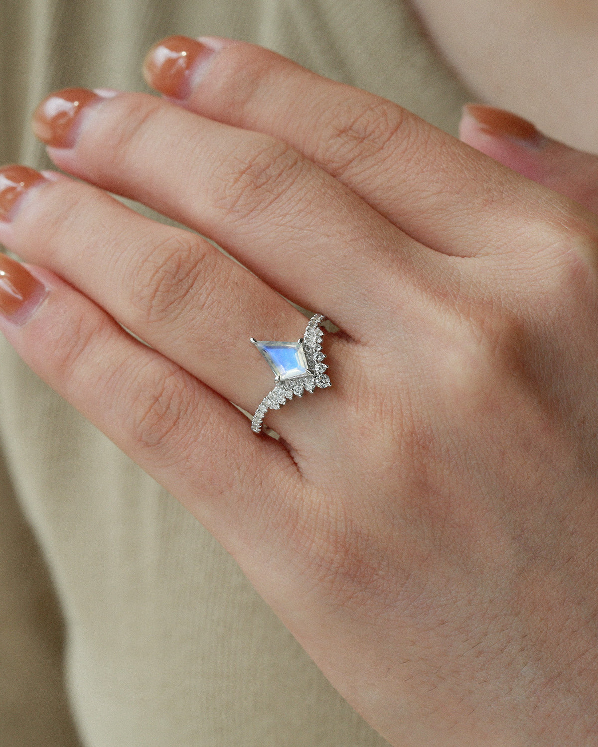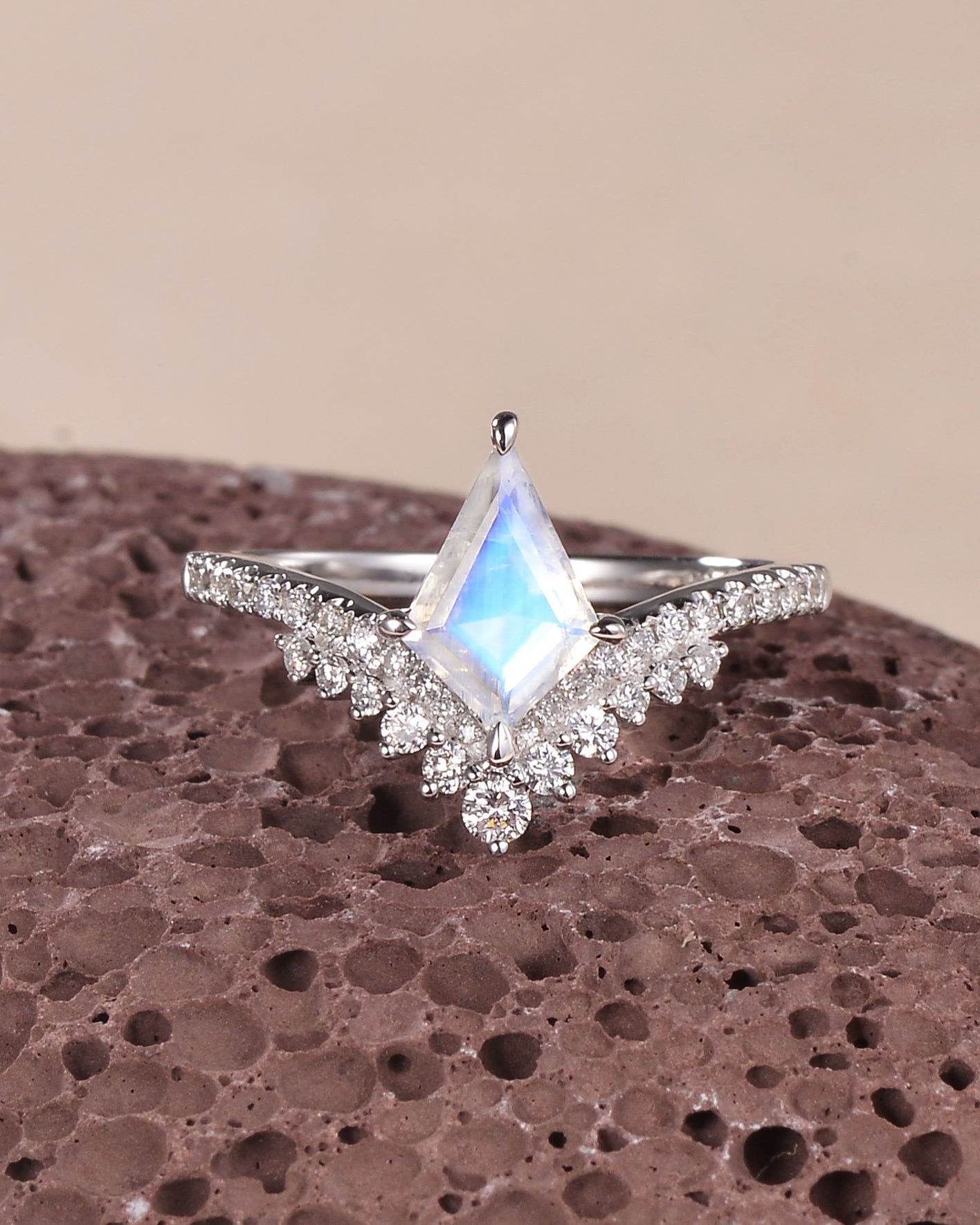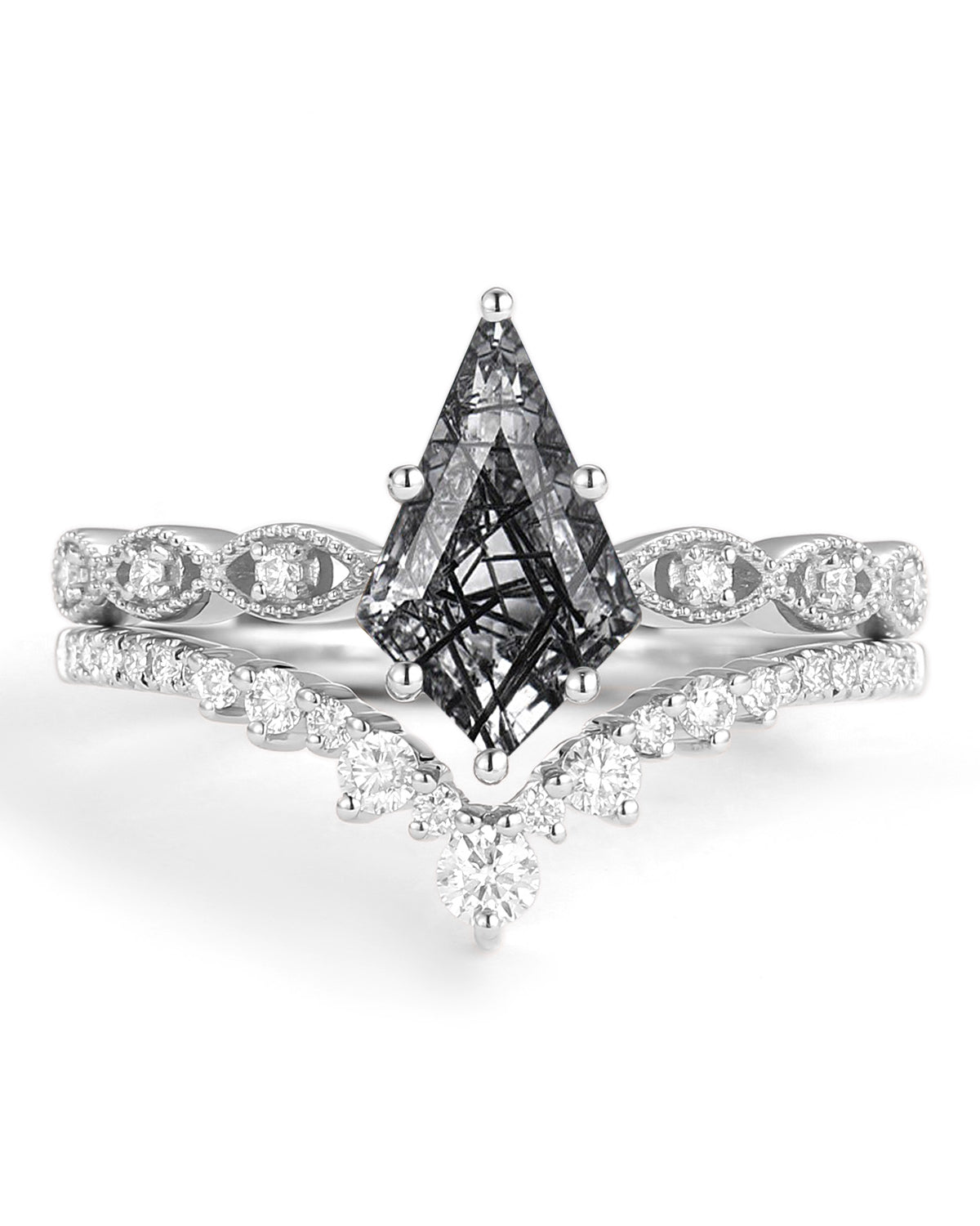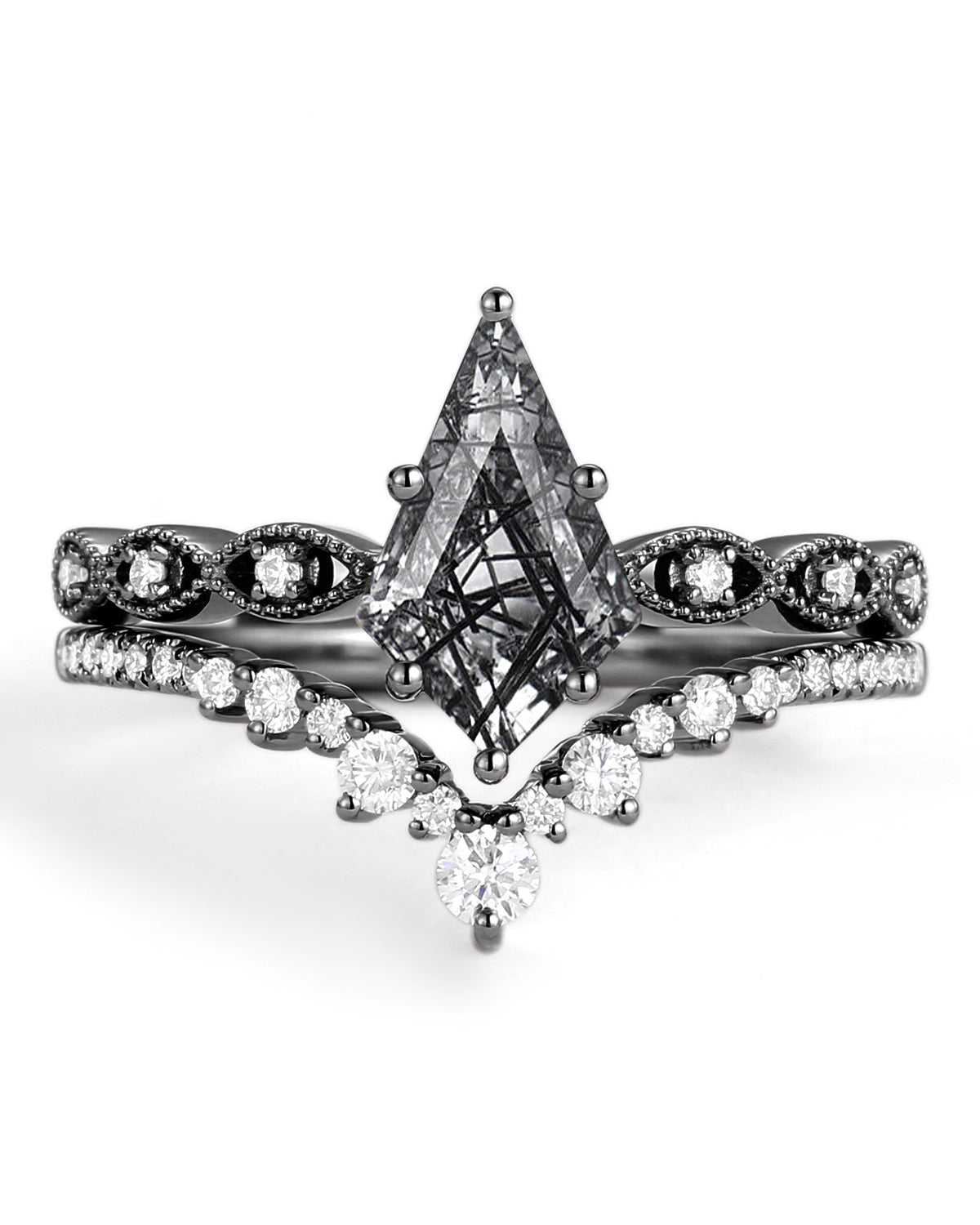 Our Love Kite collection features a variety of kite cut engagement rings, each with its own unique personality and style. The Moss Agate Kite Shape Engagement Ring, the moissanite rings and the Kite Salt and Pepper Diamond Ring are popular rings in our kite engagement ring.