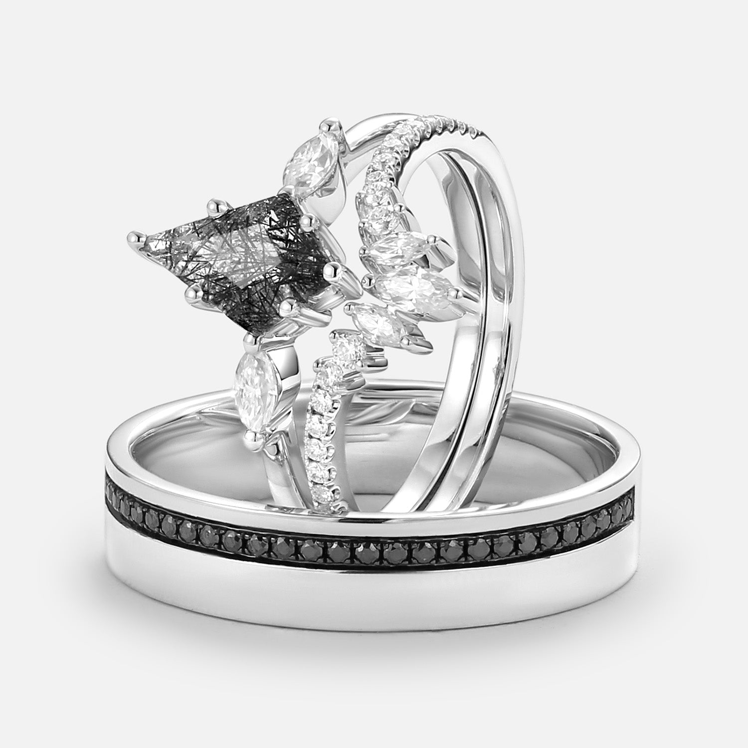 Kite Cut Black Rutilated Quartz Couple Ring Set 3pcs - Jream
