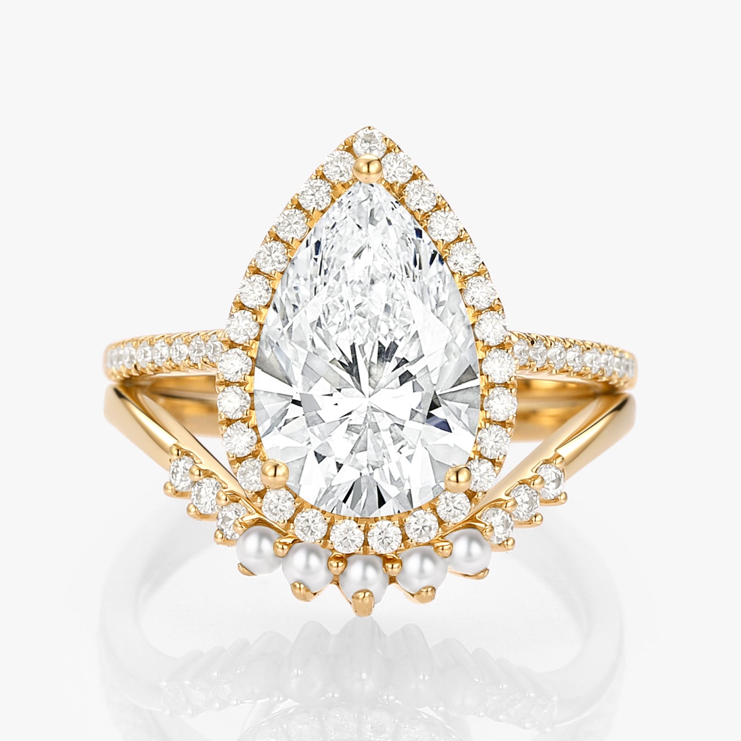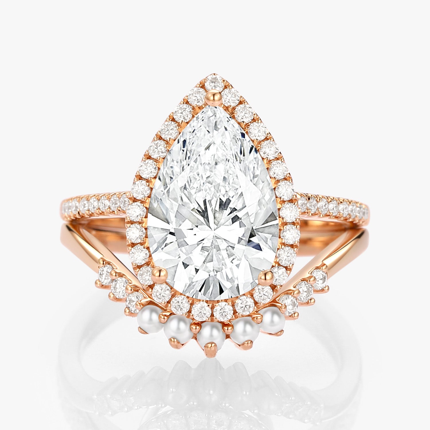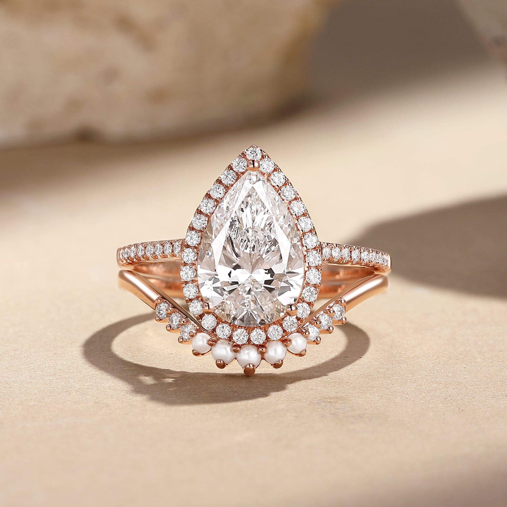 Felicegals 3.0ct Pear Shaped Lab Grown Diamond Pearl Gold Ring Set 2pcs Lab Diamond Halo Ring Anniversary Gift