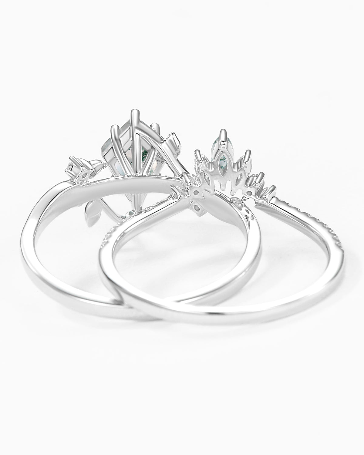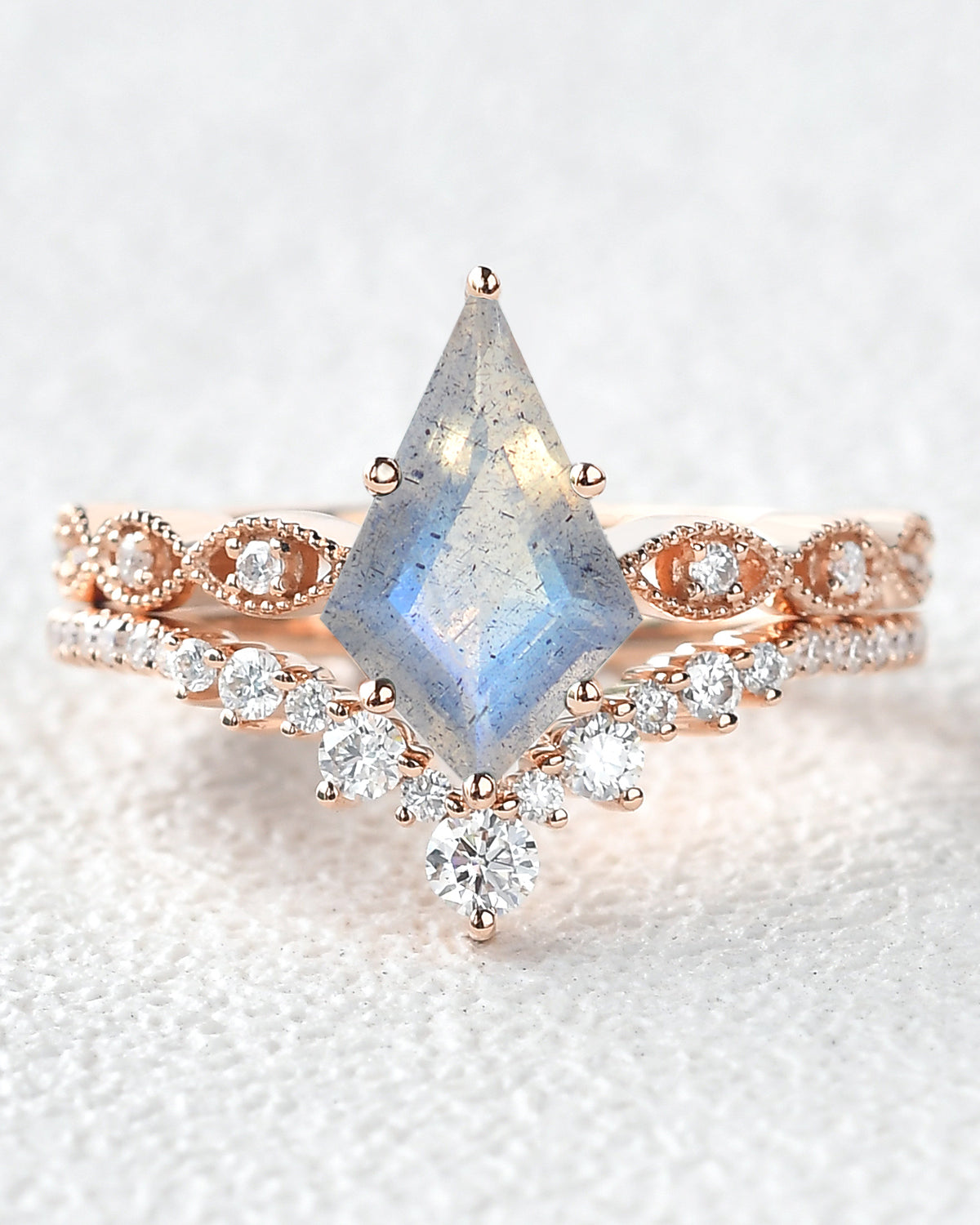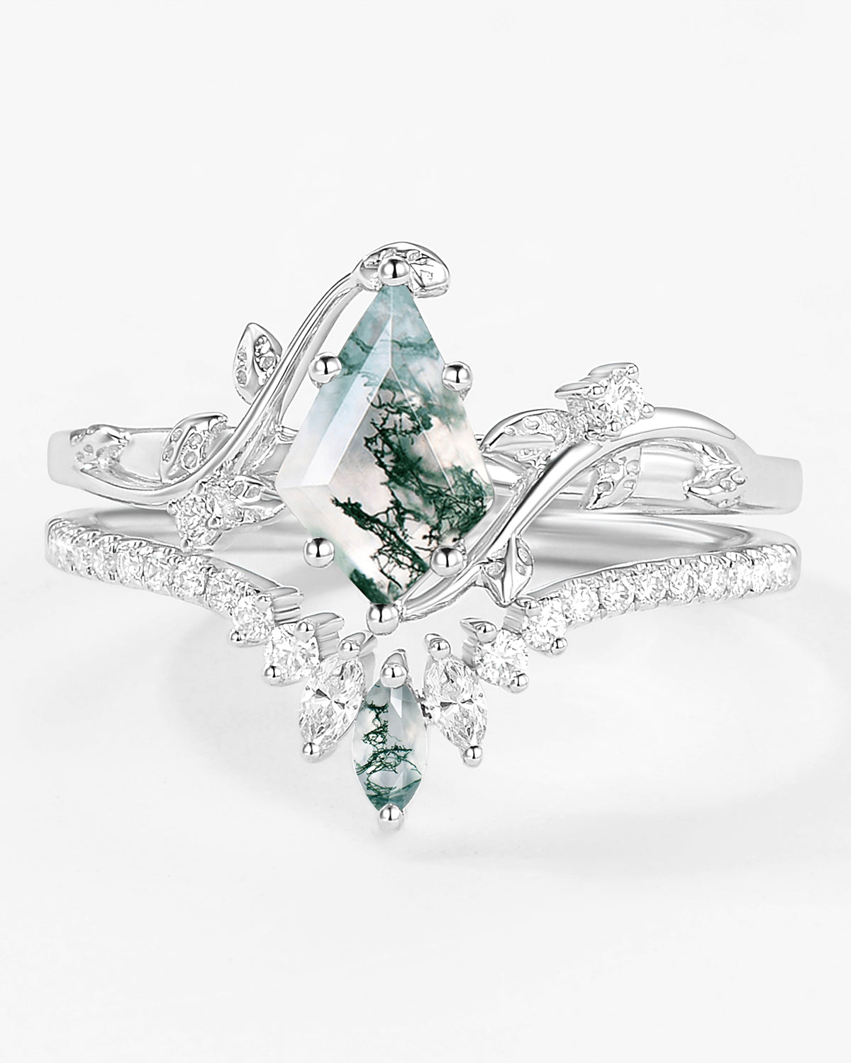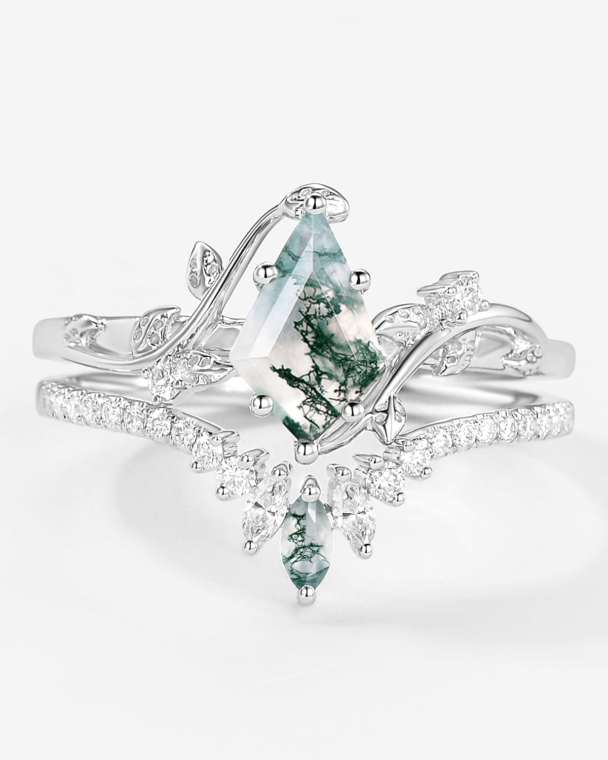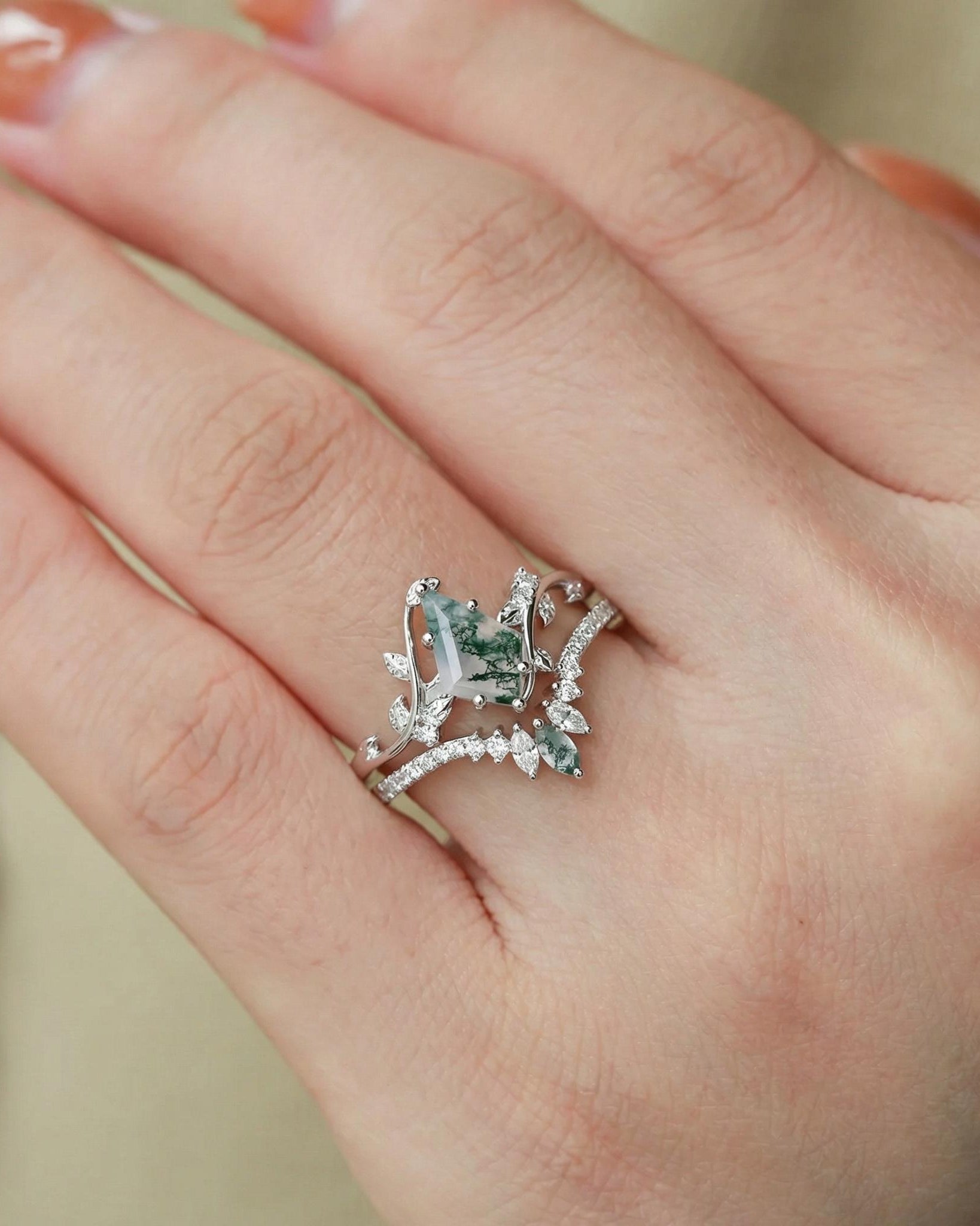 Our Love Kite collection features a variety of kite cut engagement rings, each with its own unique personality and style. The Moss Agate Kite Shape Engagement Ring, the moissanite rings and the Kite Salt and Pepper Diamond Ring are popular rings in our kite engagement ring.