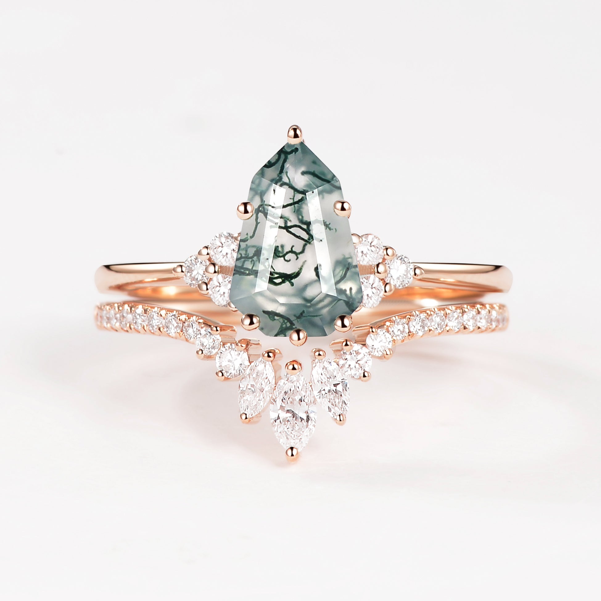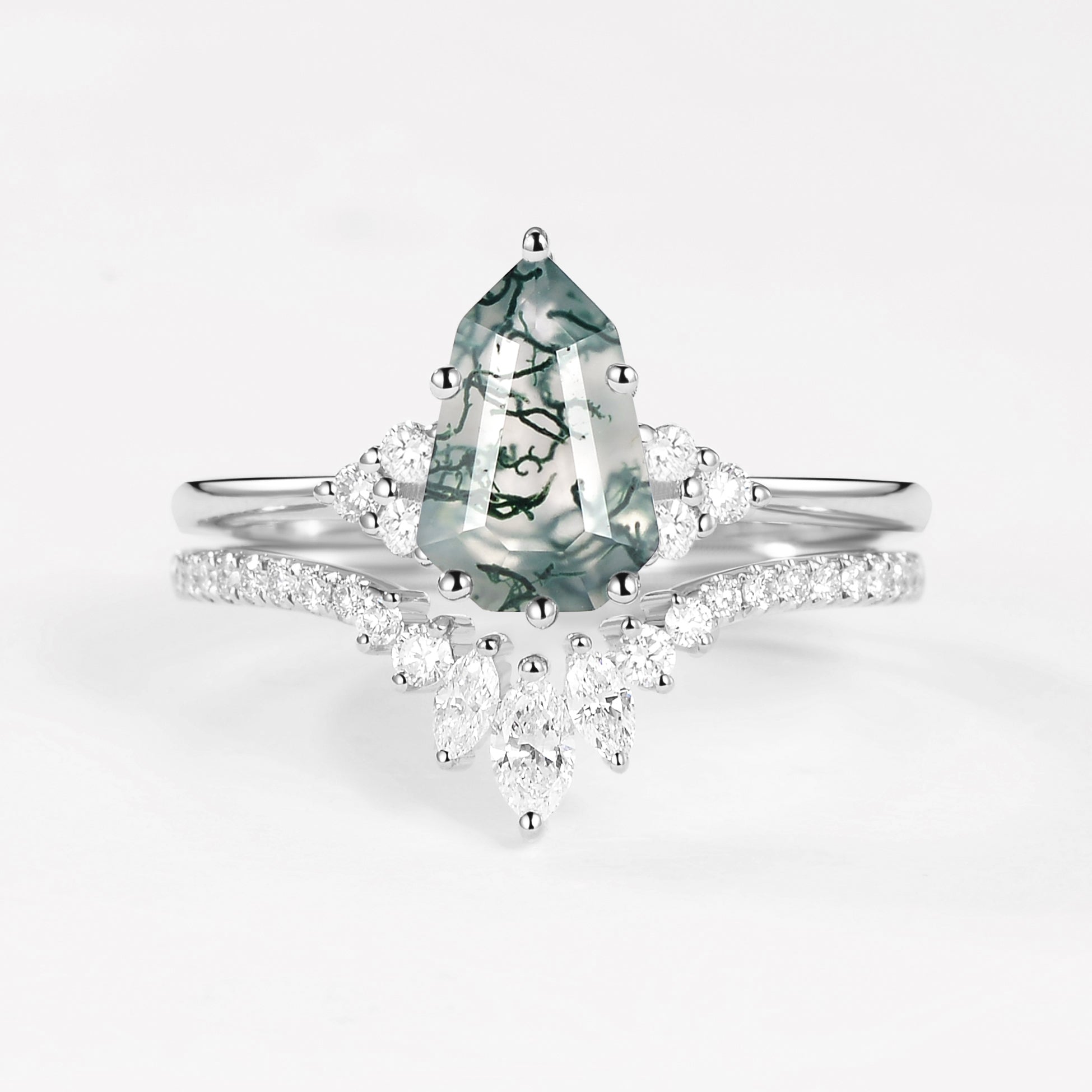 Pear-shaped Fancy Cut Moss Agate Engagement Ring Set 2pcs - Lydia