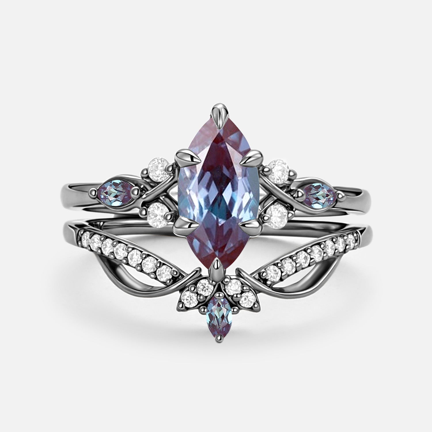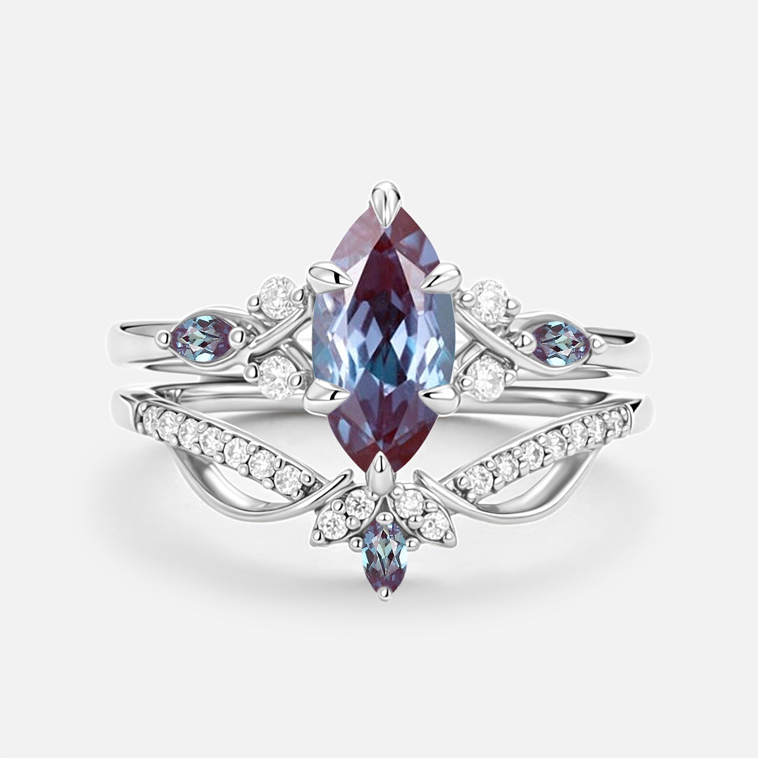 Marquise Cut Lab Alexandrite & Moissanite Engagement Ring Sets 2pcs - Mirage