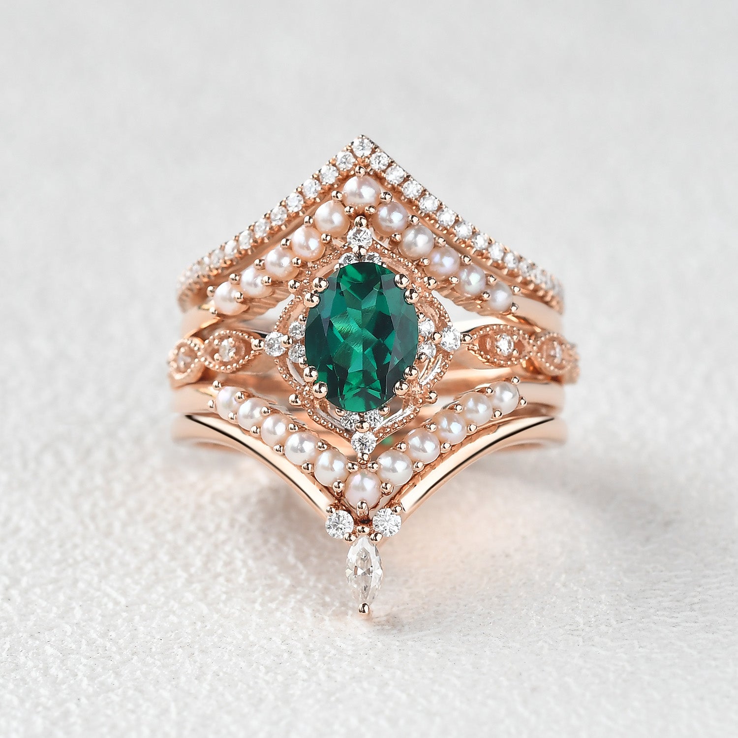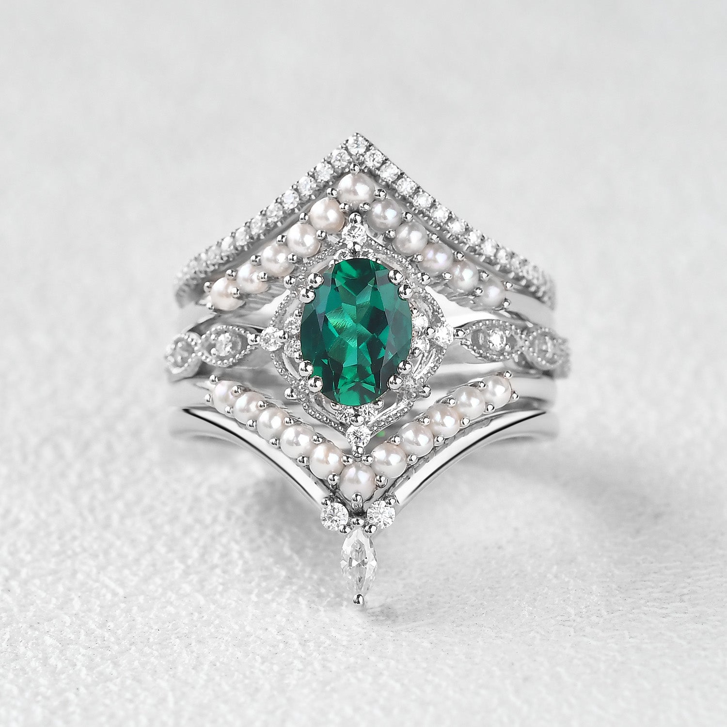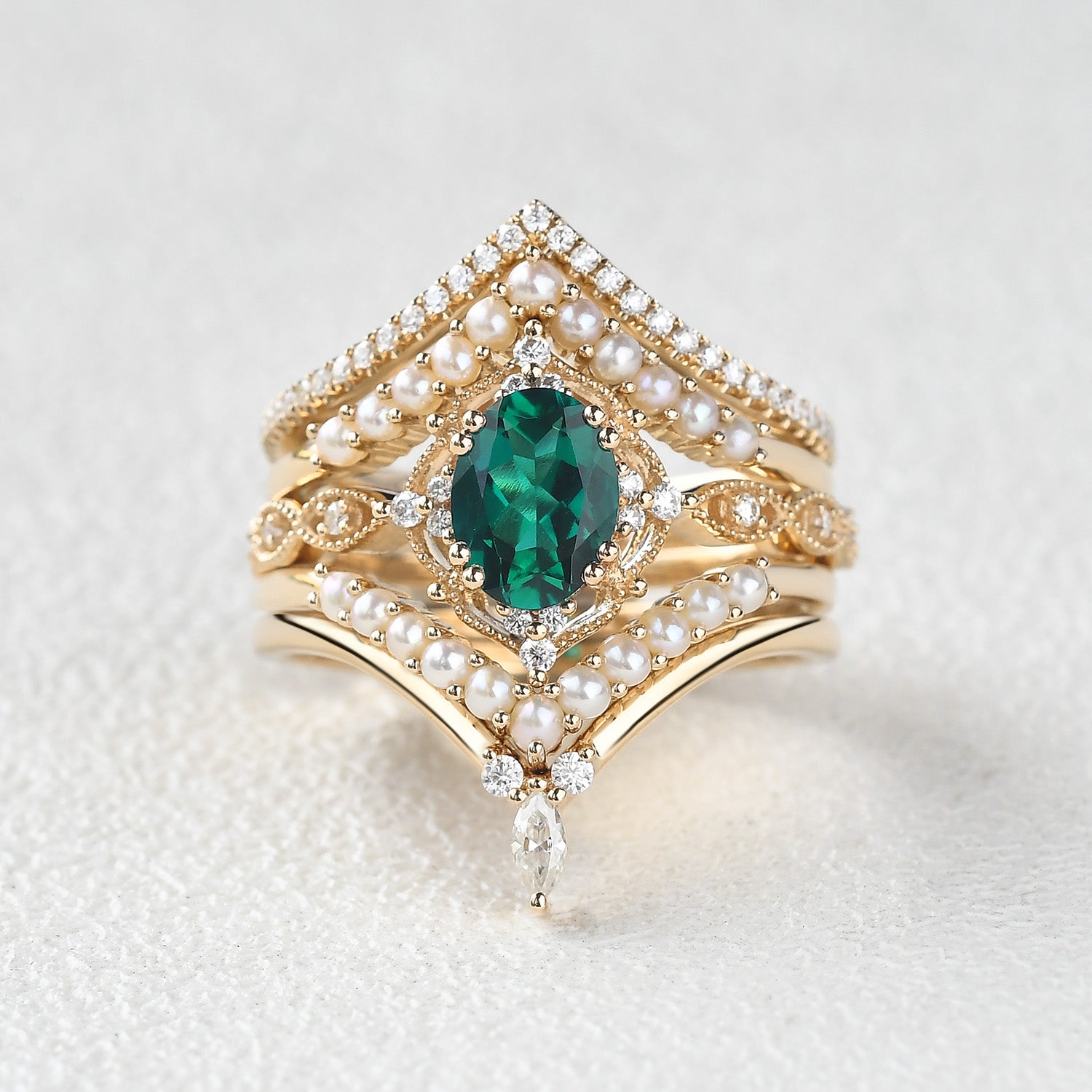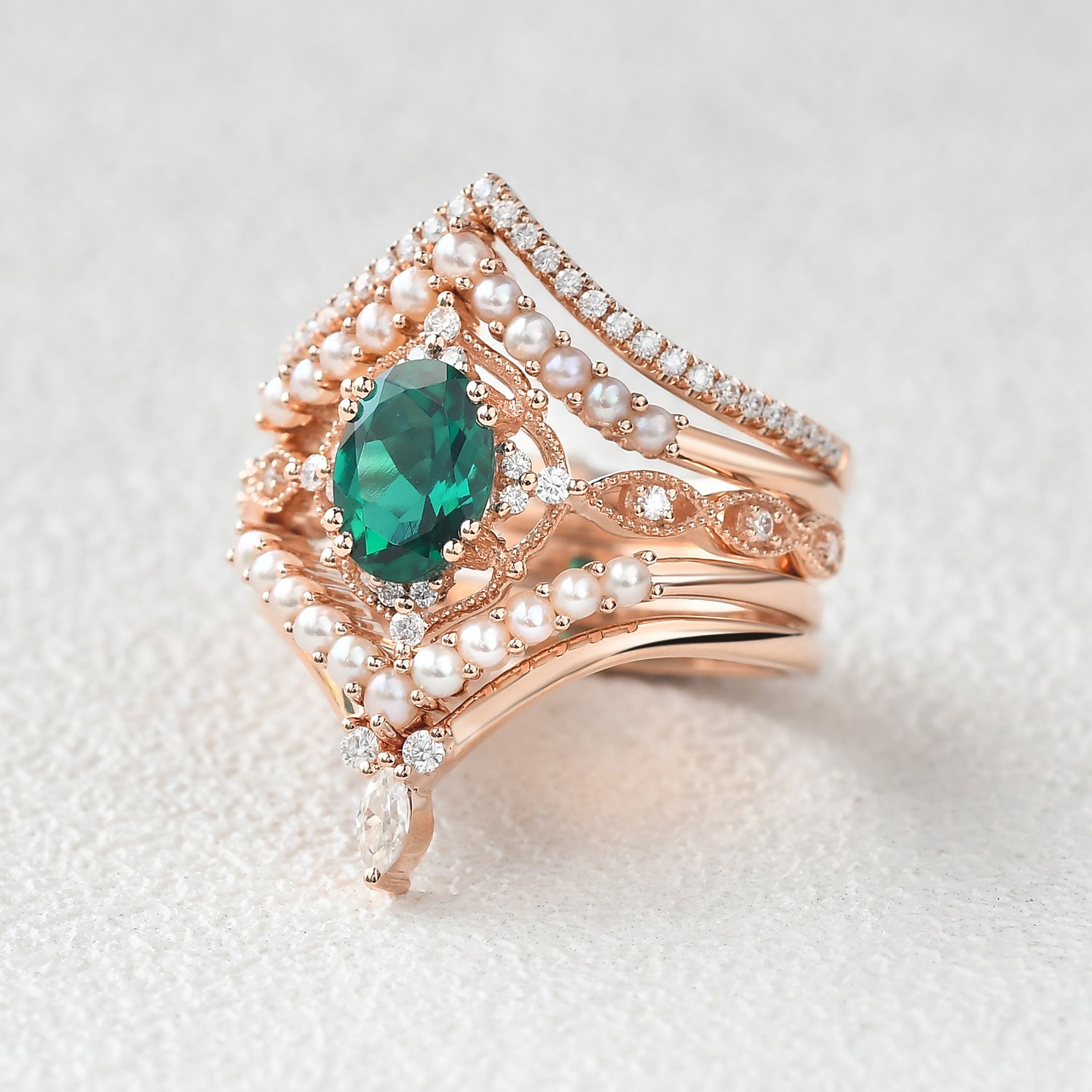Felicegals 1.5ct Emerald Signature Vintage Extravaganza Ring Set 5pcs Set 3pcs Antique Oval Akoya Pearl Wedding Ring Bridal Set Vine Vintage Inspired Ring Art Deco Curved Moissanite Wedding Band Set