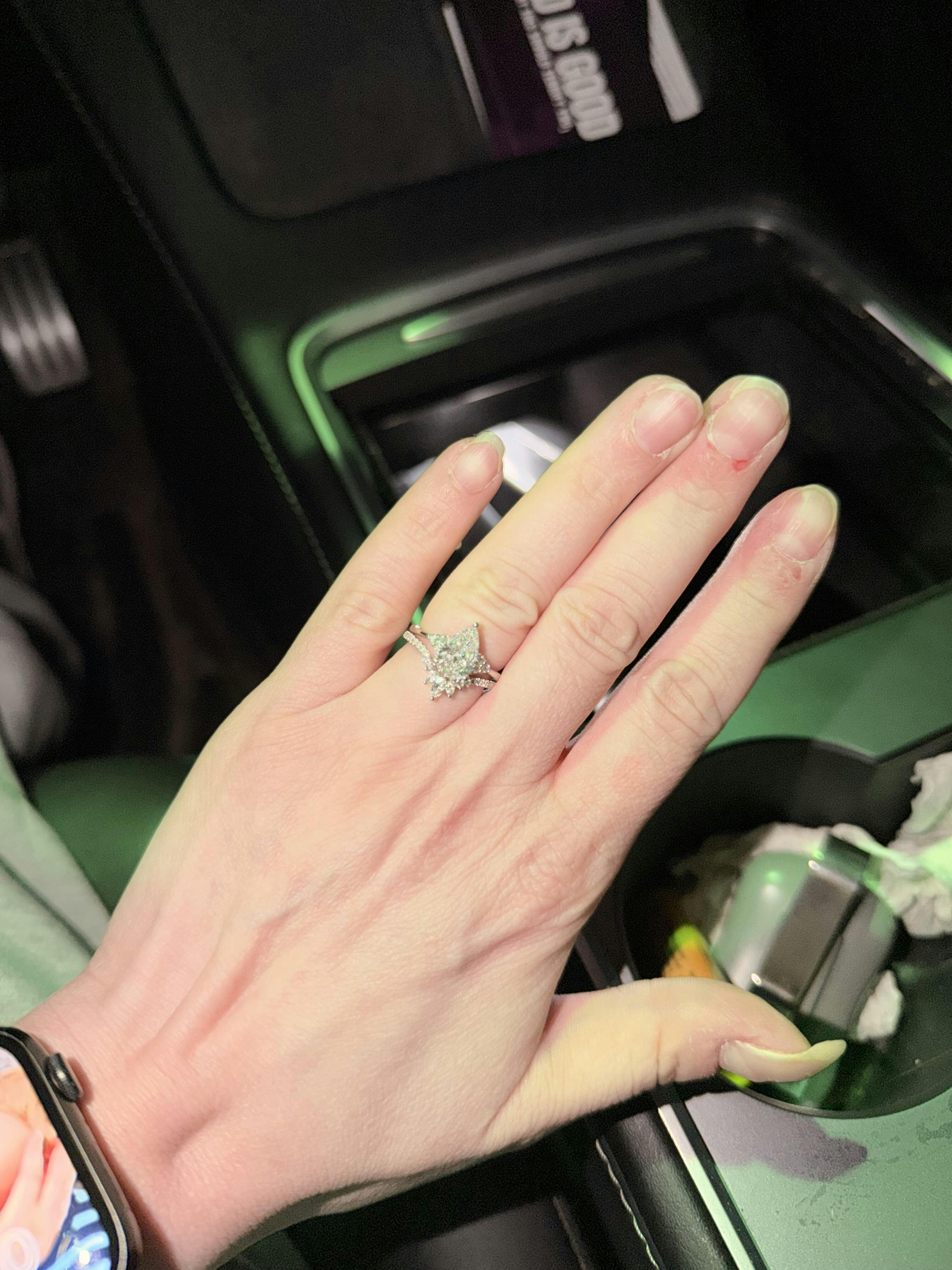 Pear Lydia is the ring that has it all. The set features a stunning cluster bouquet of stones, elegantly set in a spectacular pear shape.It is a flawless pear ring. These beautiful hand-selected marquise and round stones sit artfully in the most balanced way possible. I once was aksed, "why this set makes me feel all kinds of emotions?" I said, "this set is everything - classy, elegant, sophisticated, effortlessly, hopelessly romantic, it is the 1.5 carat moissanite ring you get when you don't know and the ring you get when you do know".