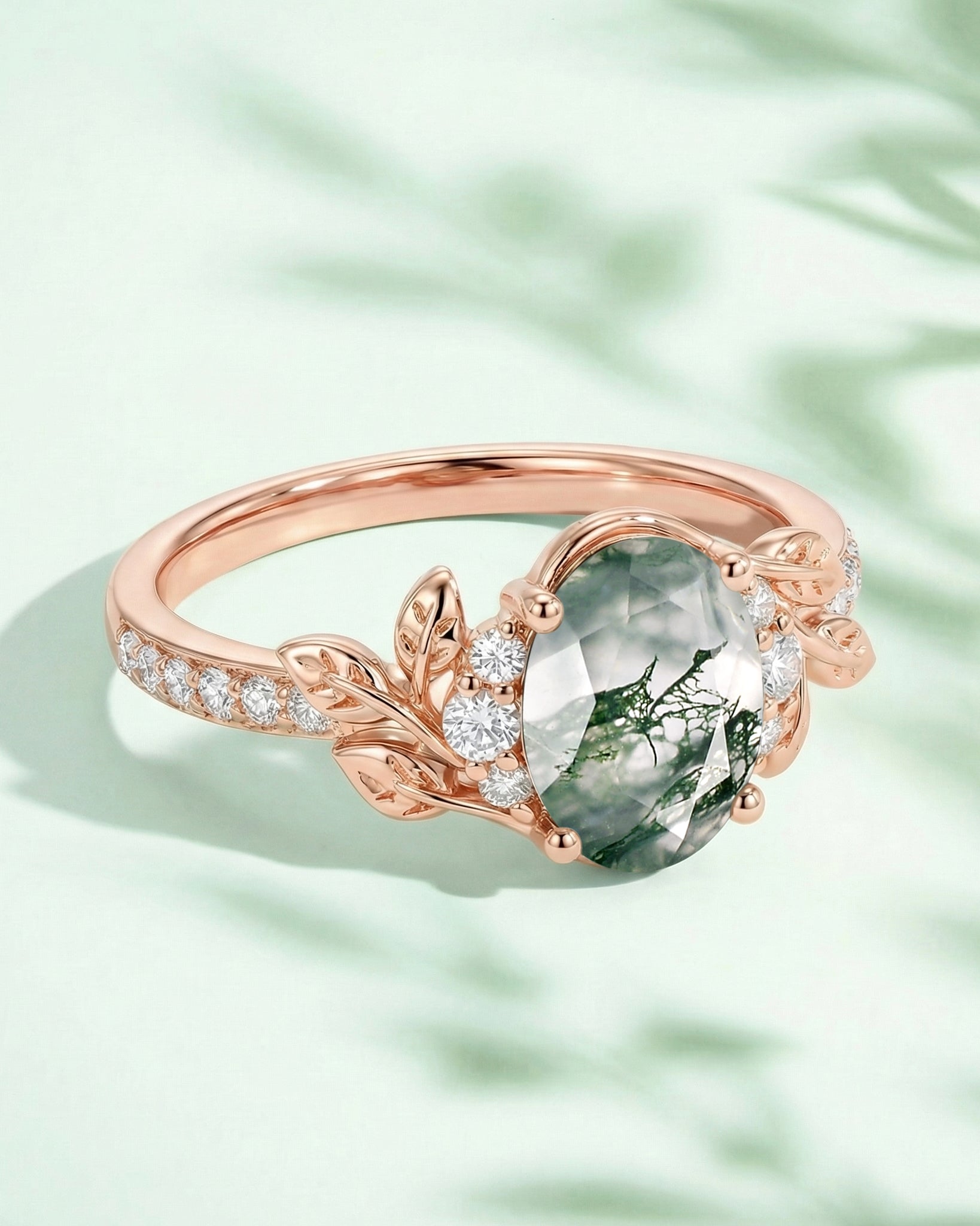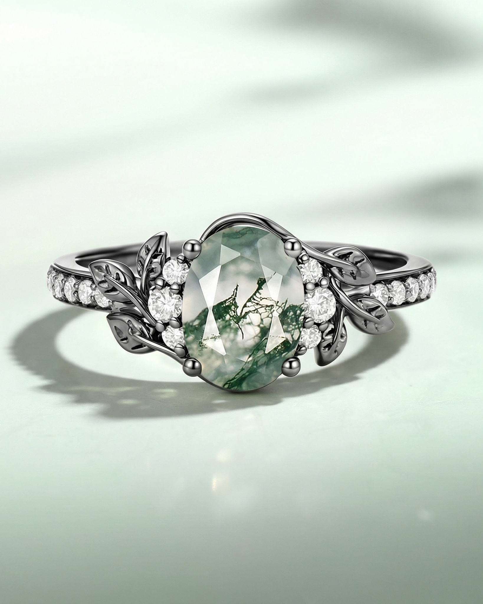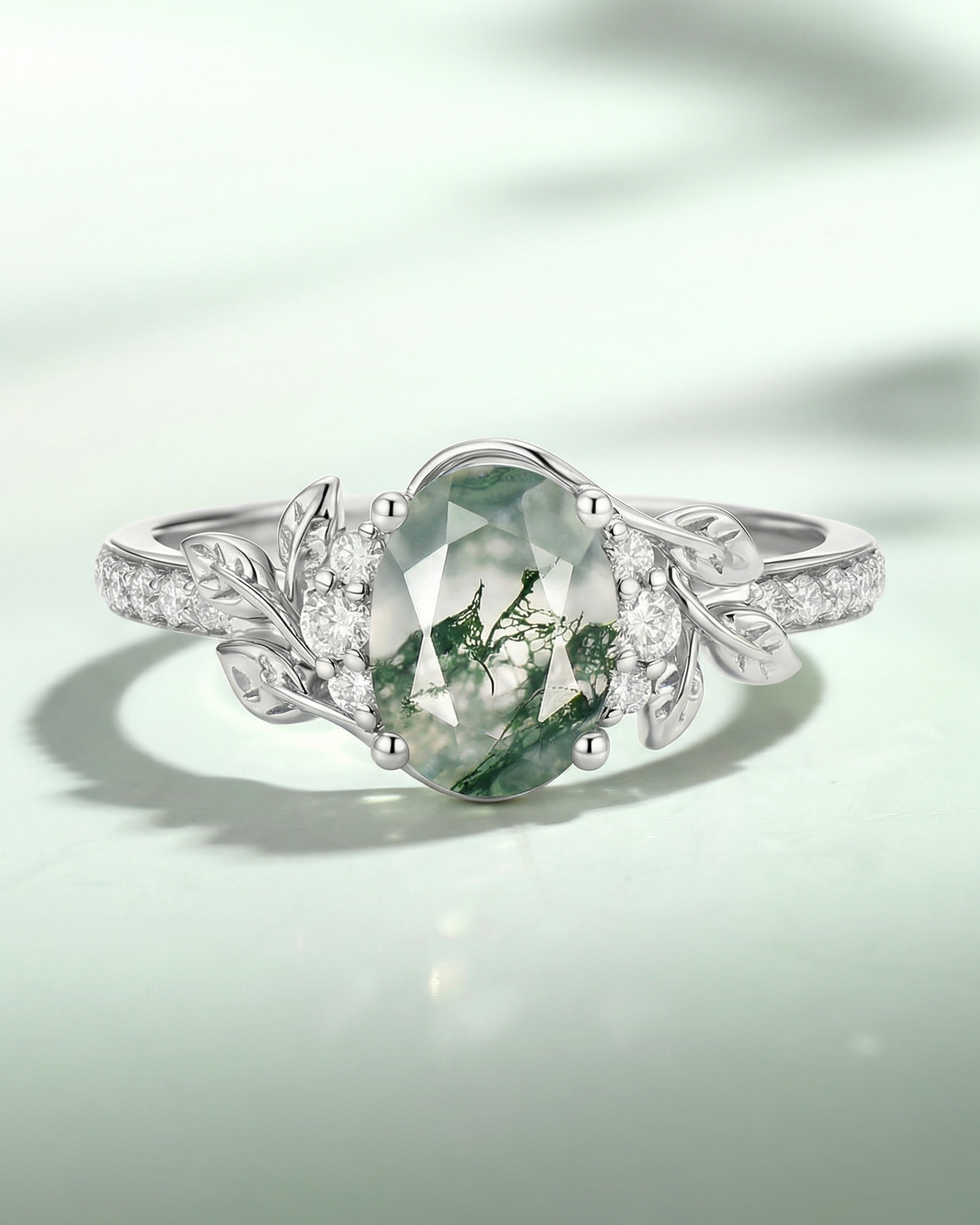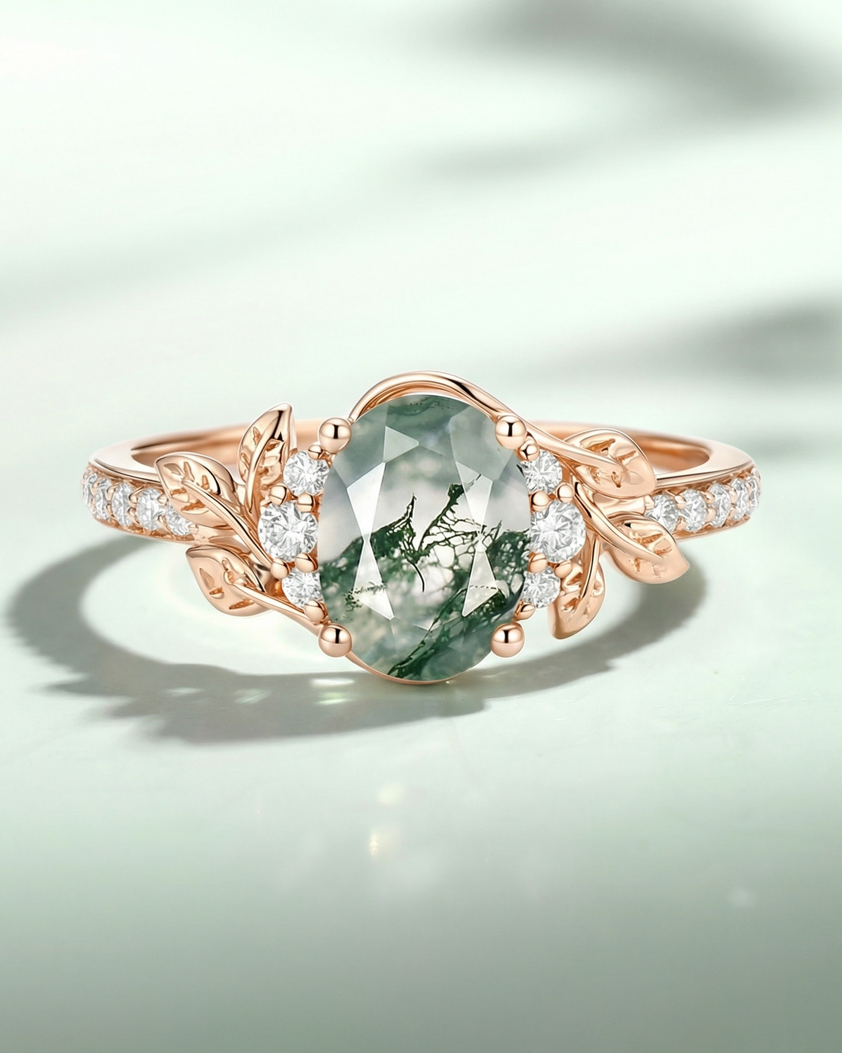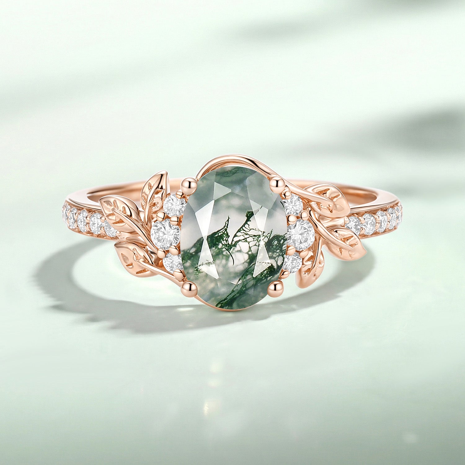 Moss Agate, a popular variety among gemstones and the aristocrat in the agate family, is widely loved and pursued by consumers. Its unique texture and pattern, reminiscent of swaying aquatic plants, creates a magical visual appeal with an excellent sense of depth. Moss agate ring makes it a perfect choice for engagement rings, symbolizing enduring love and the journey through hardship towards a fruitful relationship. Additionally, Moss Agate engagement rings are not only unique and symbolic, but also serve as affordable engagement rings, making them a great option for couples seeking a meaningful yet budget-friendly choice. Just as no two pieces of Moss Agate are identical, so too is every couple's love story unique and enchanting.