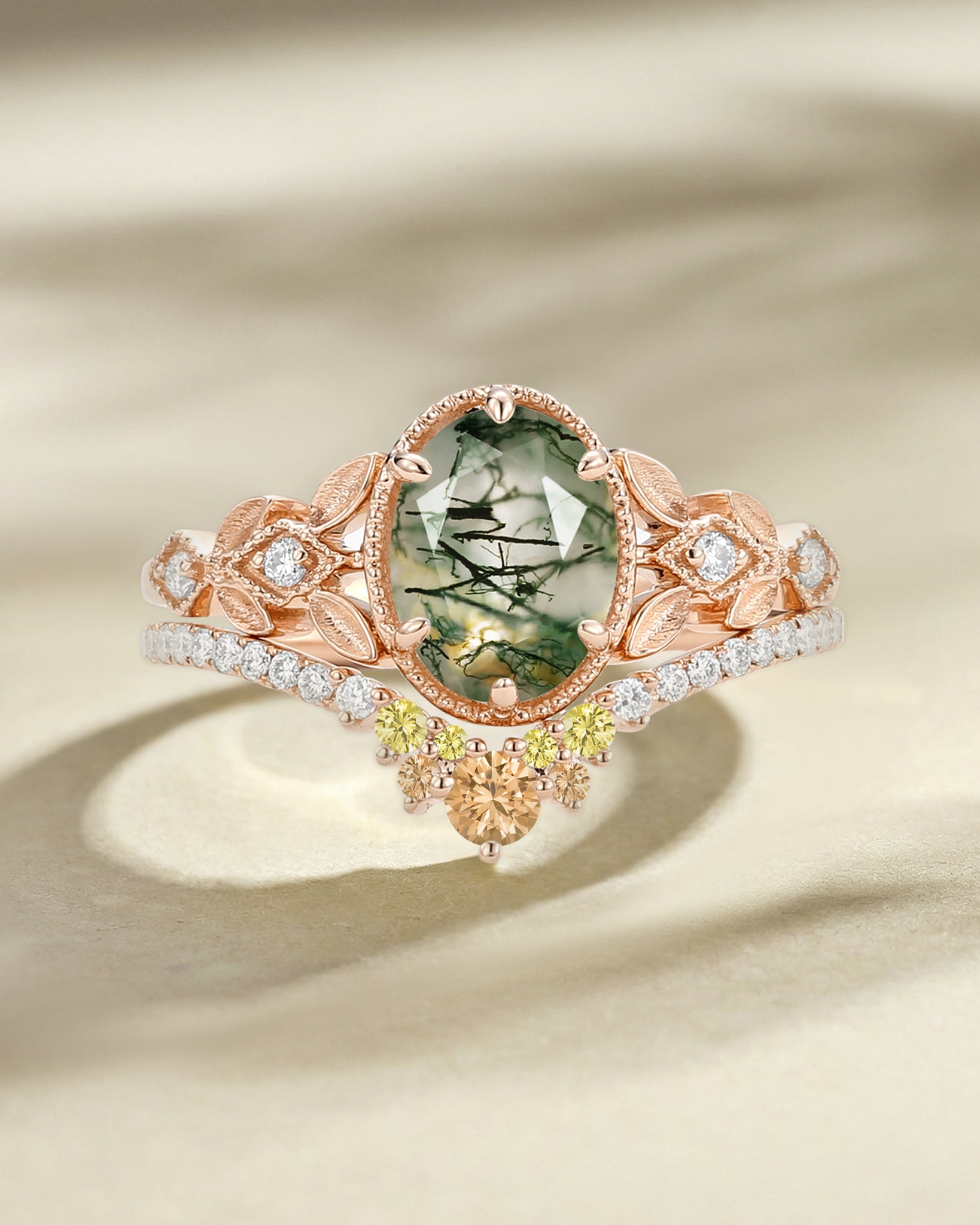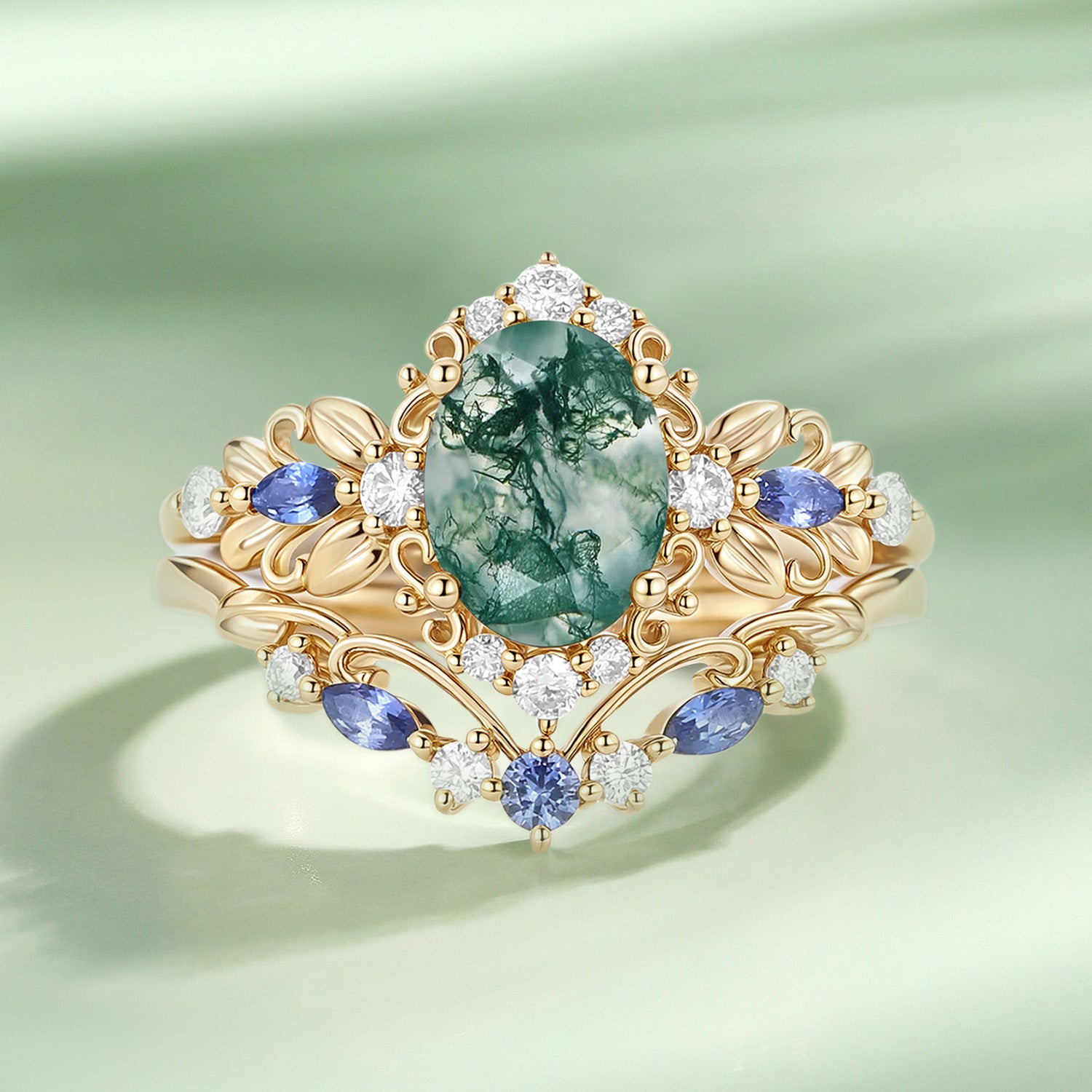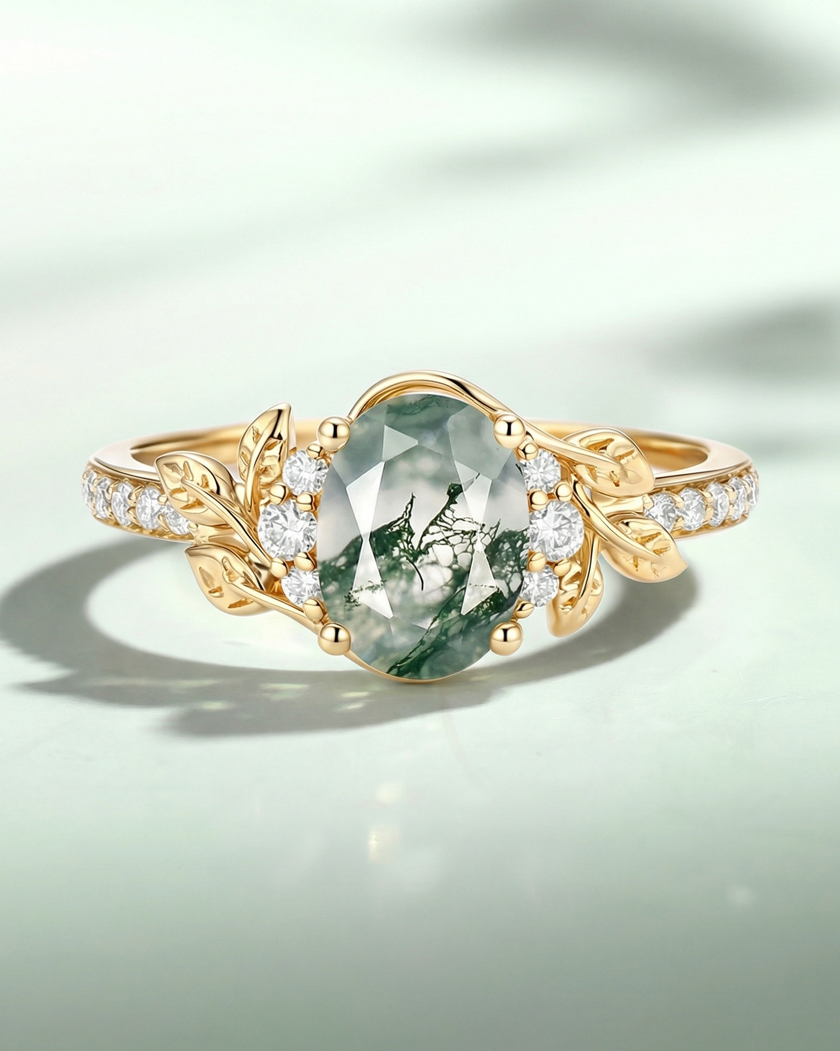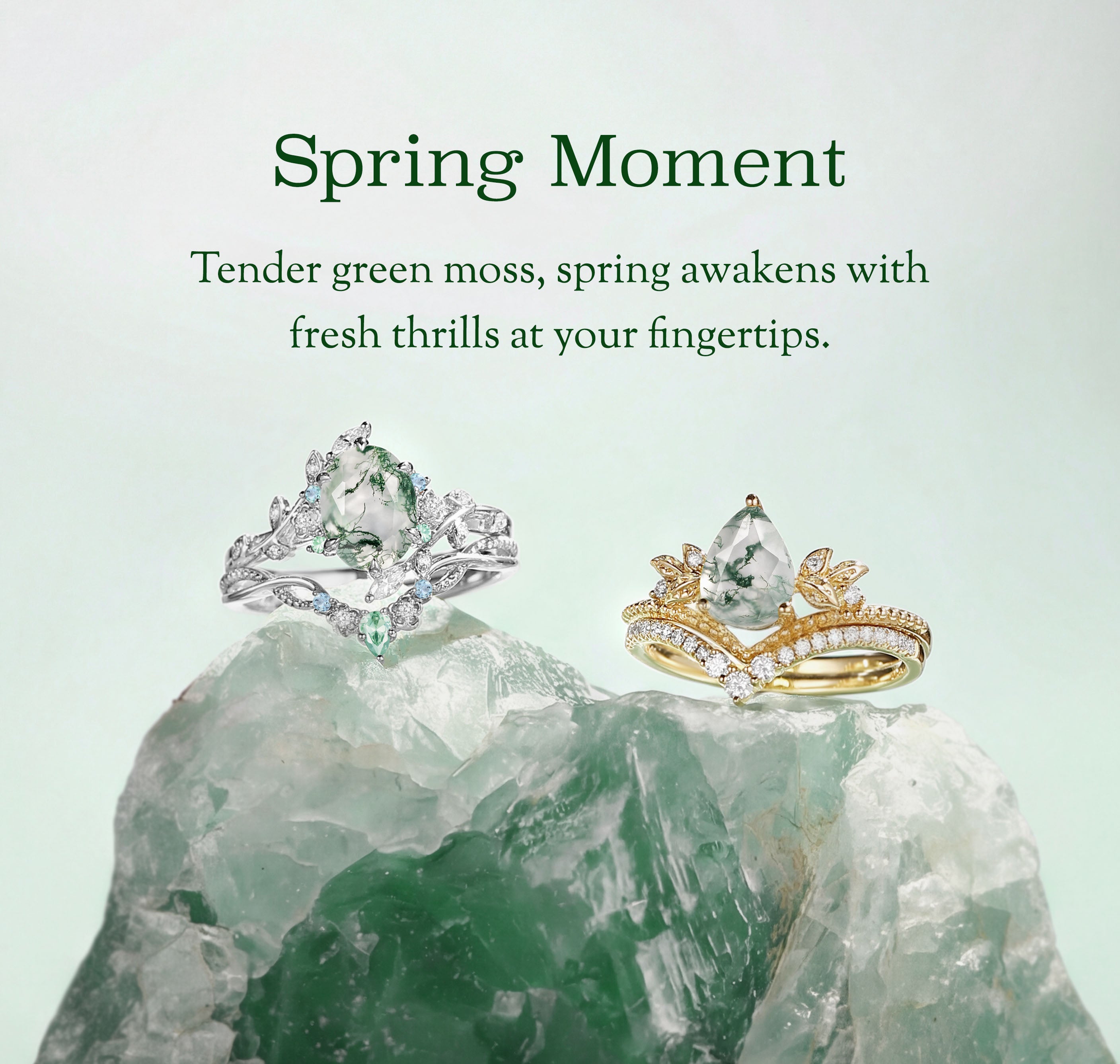 Moss Agate, a popular variety among gemstones and the aristocrat in the agate family, is widely loved and pursued by consumers. Its unique texture and pattern, reminiscent of swaying aquatic plants, creates a magical visual appeal with an excellent sense of depth. Moss agate ring makes it a perfect choice for engagement rings, symbolizing enduring love and the journey through hardship towards a fruitful relationship. Additionally, Moss Agate engagement rings are not only unique and symbolic, but also serve as affordable engagement rings, making them a great option for couples seeking a meaningful yet budget-friendly choice. Just as no two pieces of Moss Agate are identical, so too is every couple's love story unique and enchanting.