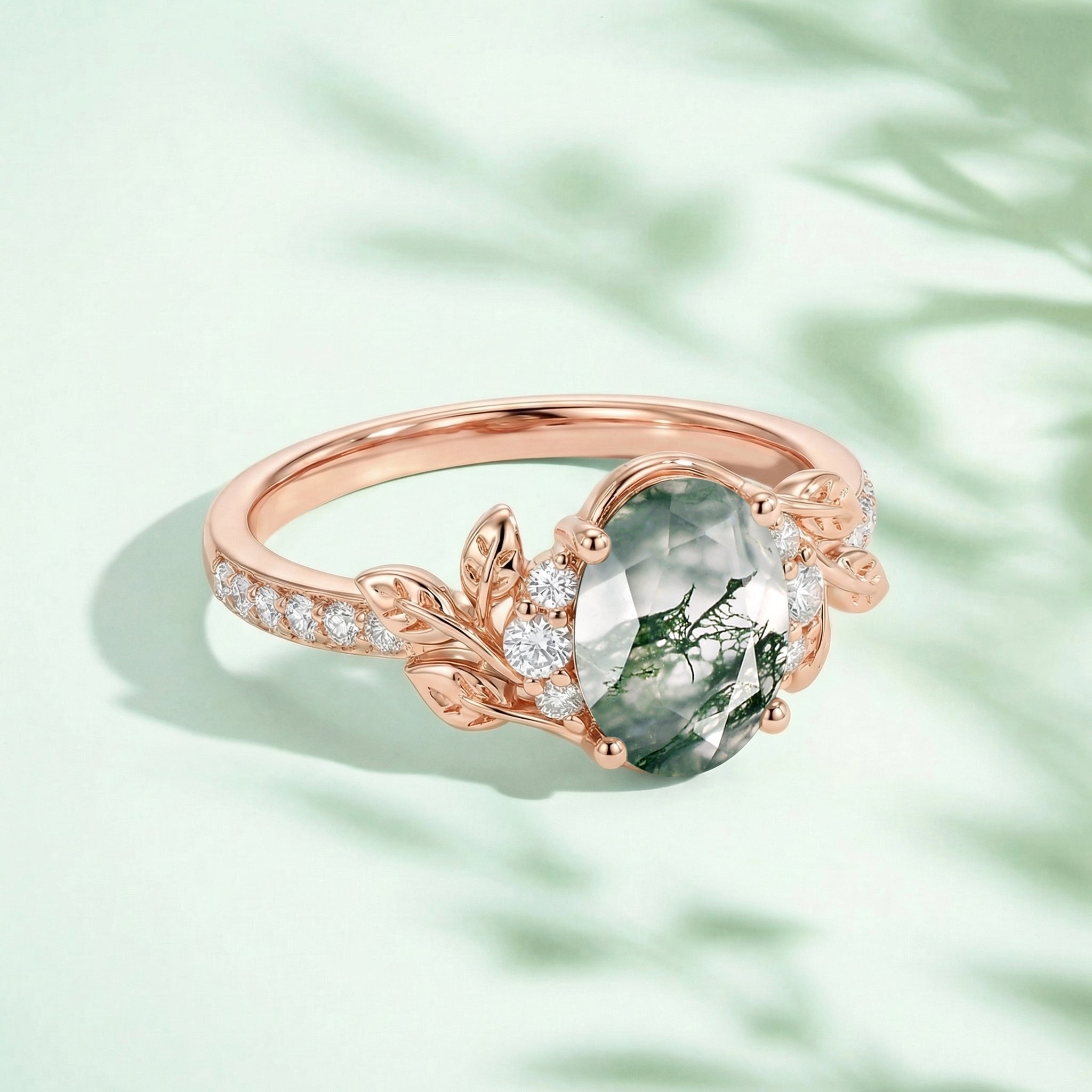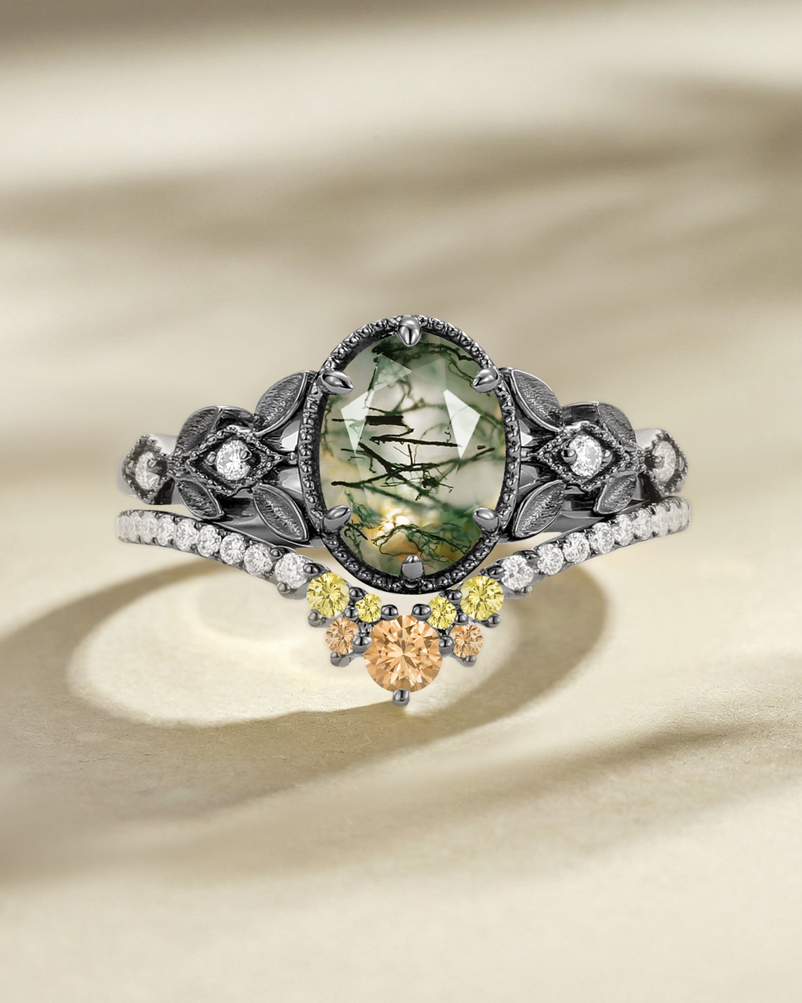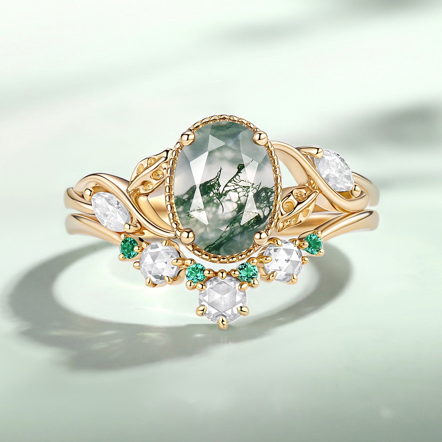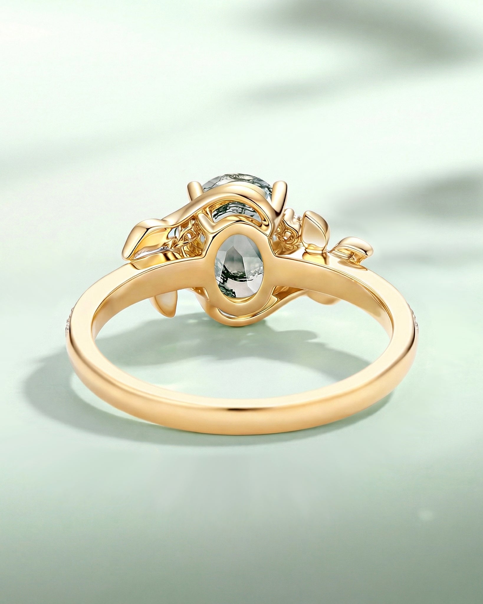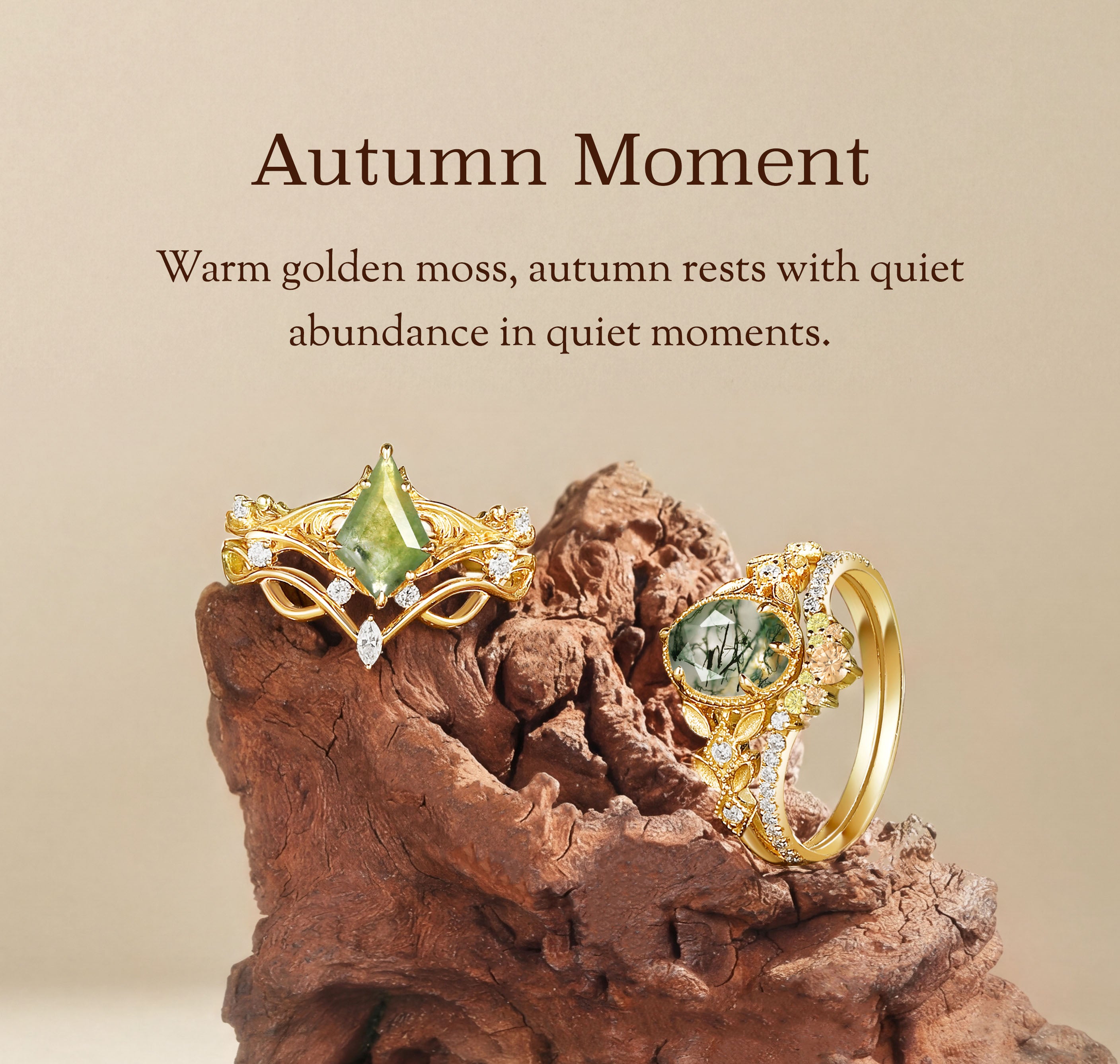 Moss Agate, a popular variety among gemstones and the aristocrat in the agate family, is widely loved and pursued by consumers. Its unique texture and pattern, reminiscent of swaying aquatic plants, creates a magical visual appeal with an excellent sense of depth. Moss agate ring makes it a perfect choice for engagement rings, symbolizing enduring love and the journey through hardship towards a fruitful relationship. Additionally, Moss Agate engagement rings are not only unique and symbolic, but also serve as affordable engagement rings, making them a great option for couples seeking a meaningful yet budget-friendly choice. Just as no two pieces of Moss Agate are identical, so too is every couple's love story unique and enchanting.