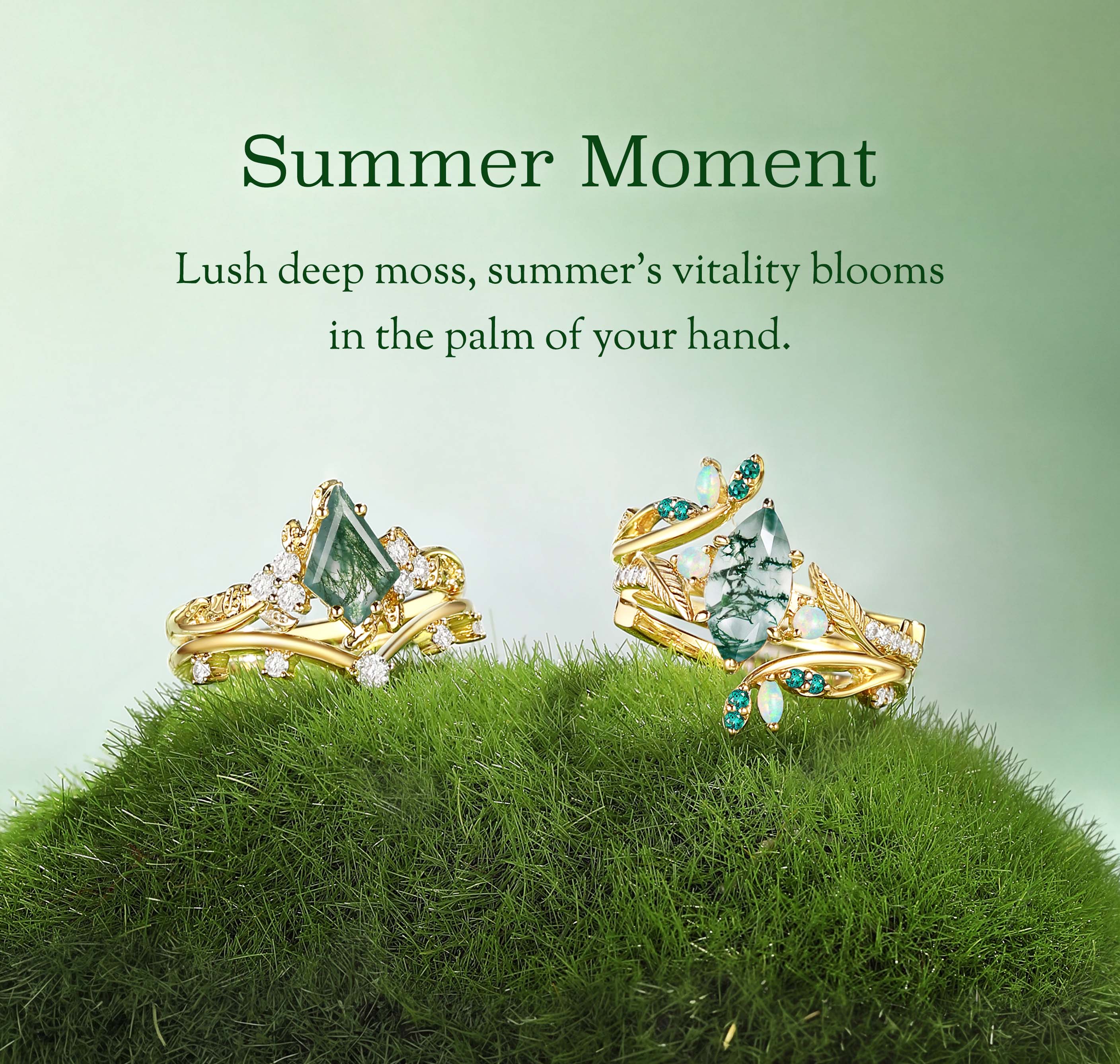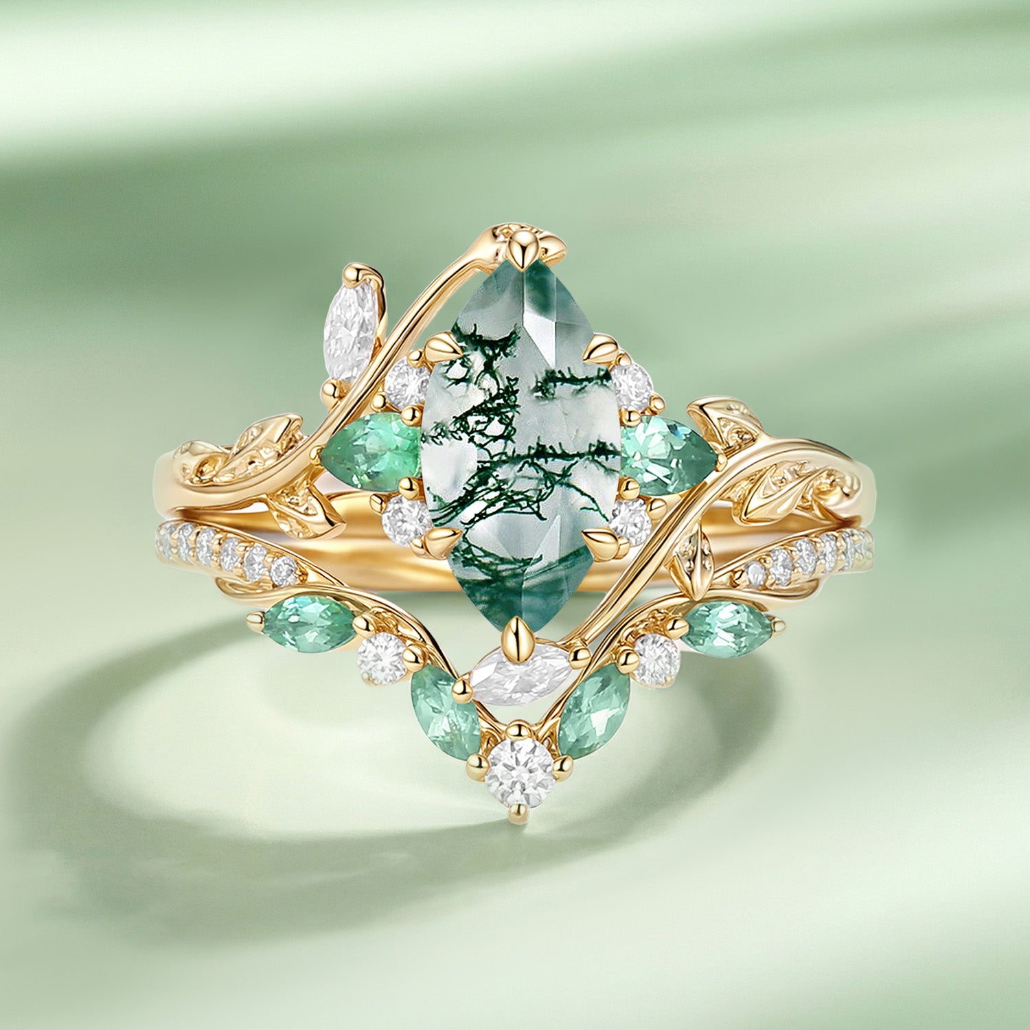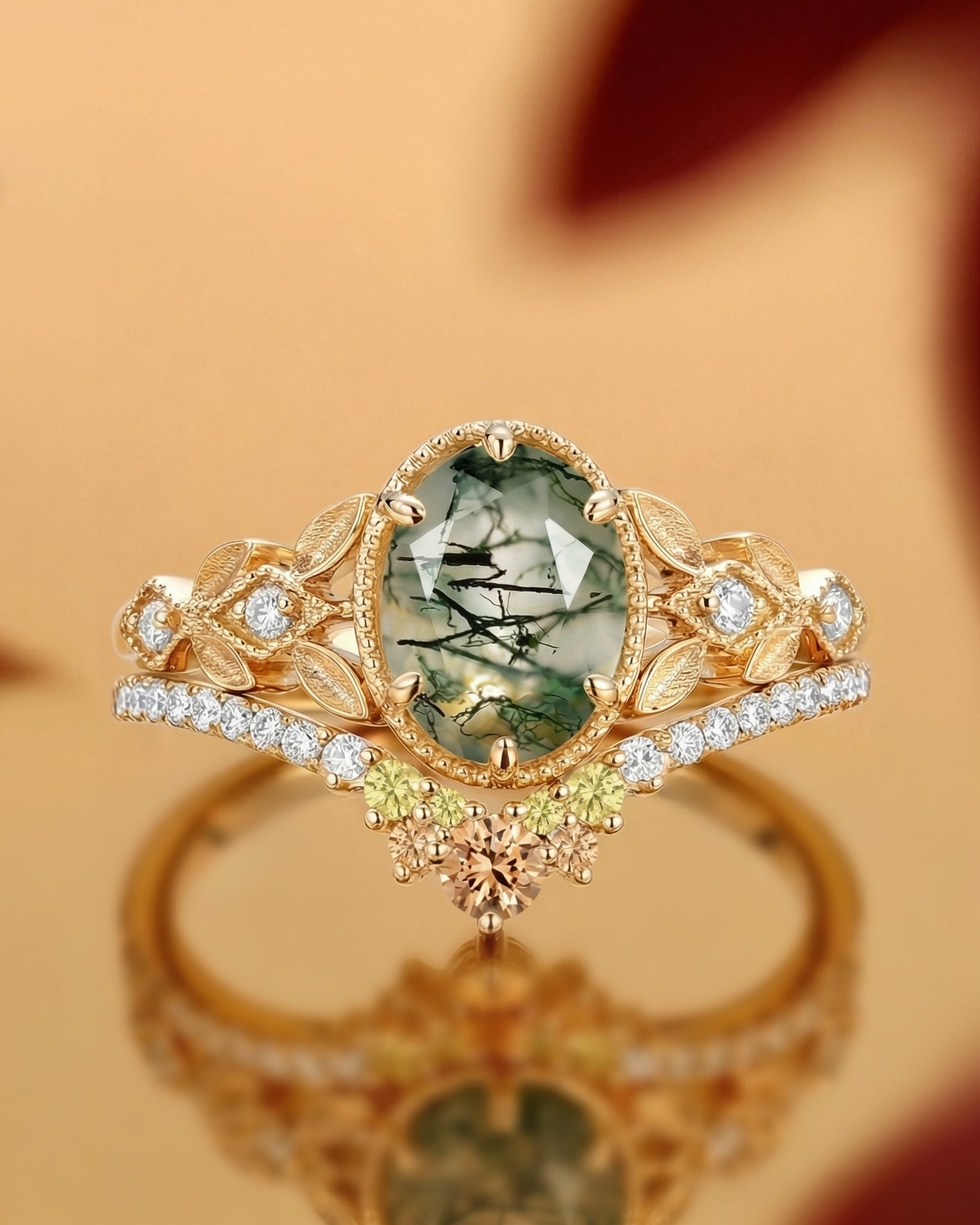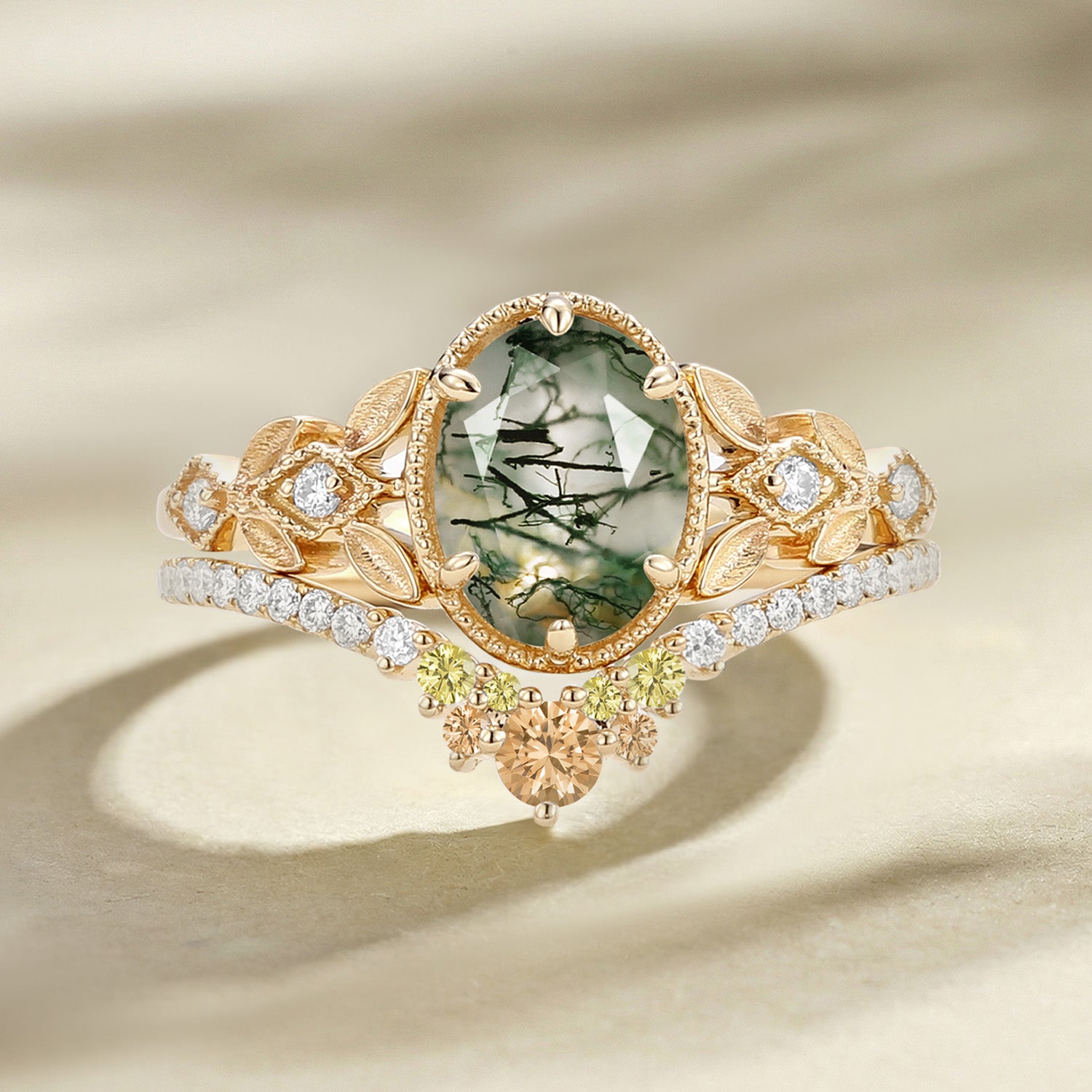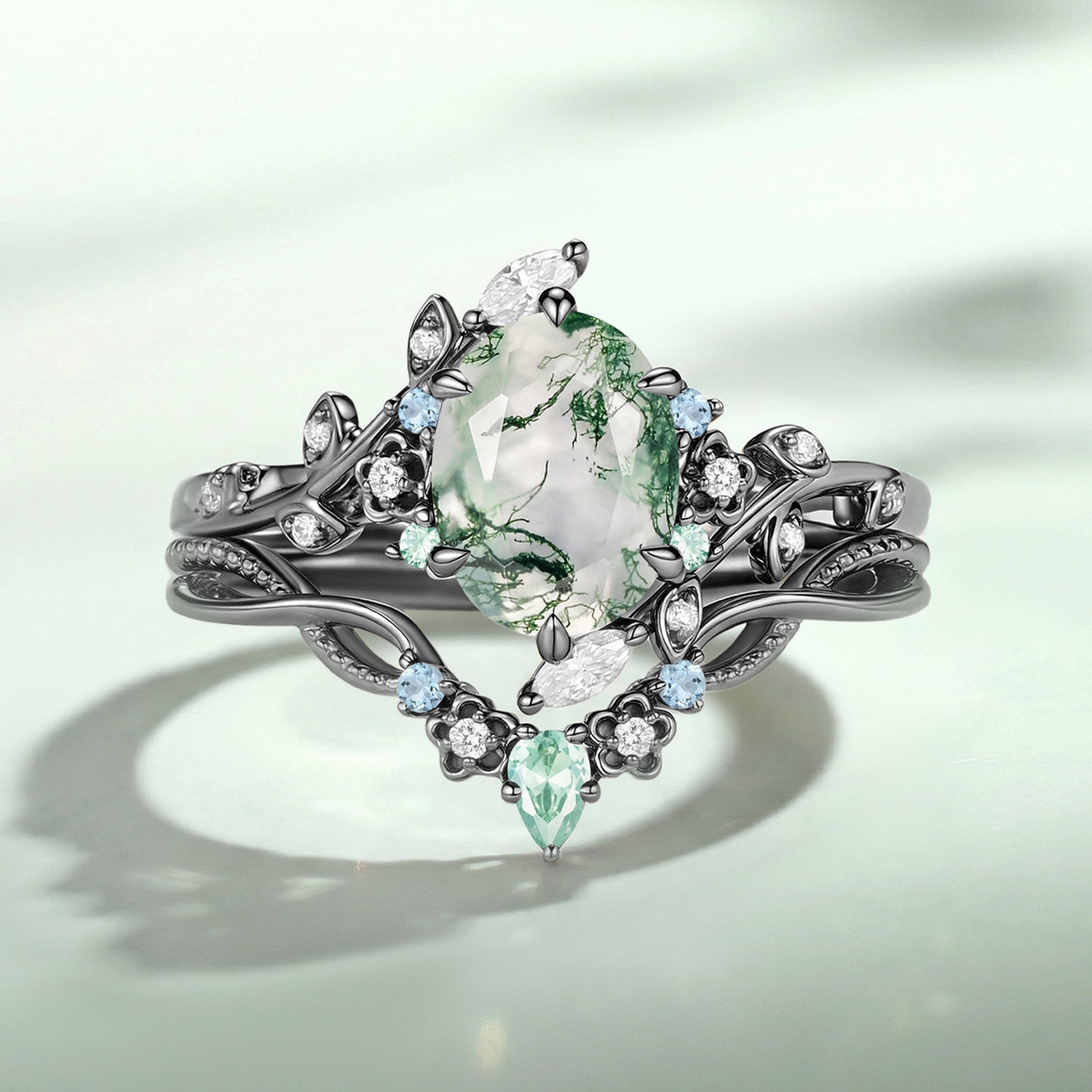 Moss Agate, a popular variety among gemstones and the aristocrat in the agate family, is widely loved and pursued by consumers. Its unique texture and pattern, reminiscent of swaying aquatic plants, creates a magical visual appeal with an excellent sense of depth. Moss agate ring makes it a perfect choice for engagement rings, symbolizing enduring love and the journey through hardship towards a fruitful relationship. Additionally, Moss Agate engagement rings are not only unique and symbolic, but also serve as affordable engagement rings, making them a great option for couples seeking a meaningful yet budget-friendly choice. Just as no two pieces of Moss Agate are identical, so too is every couple's love story unique and enchanting.