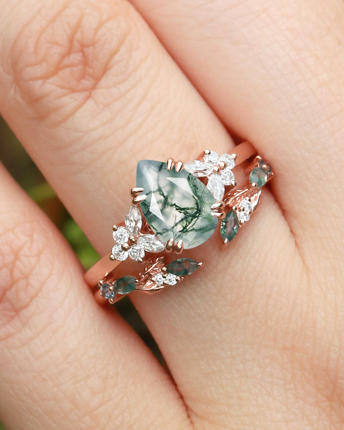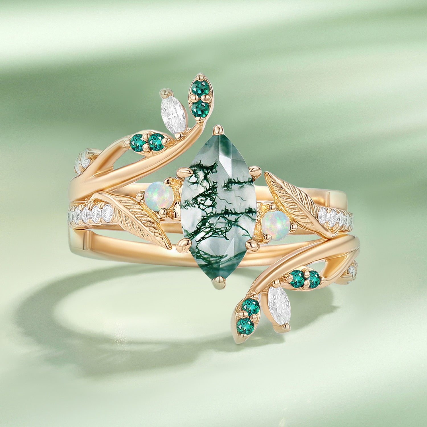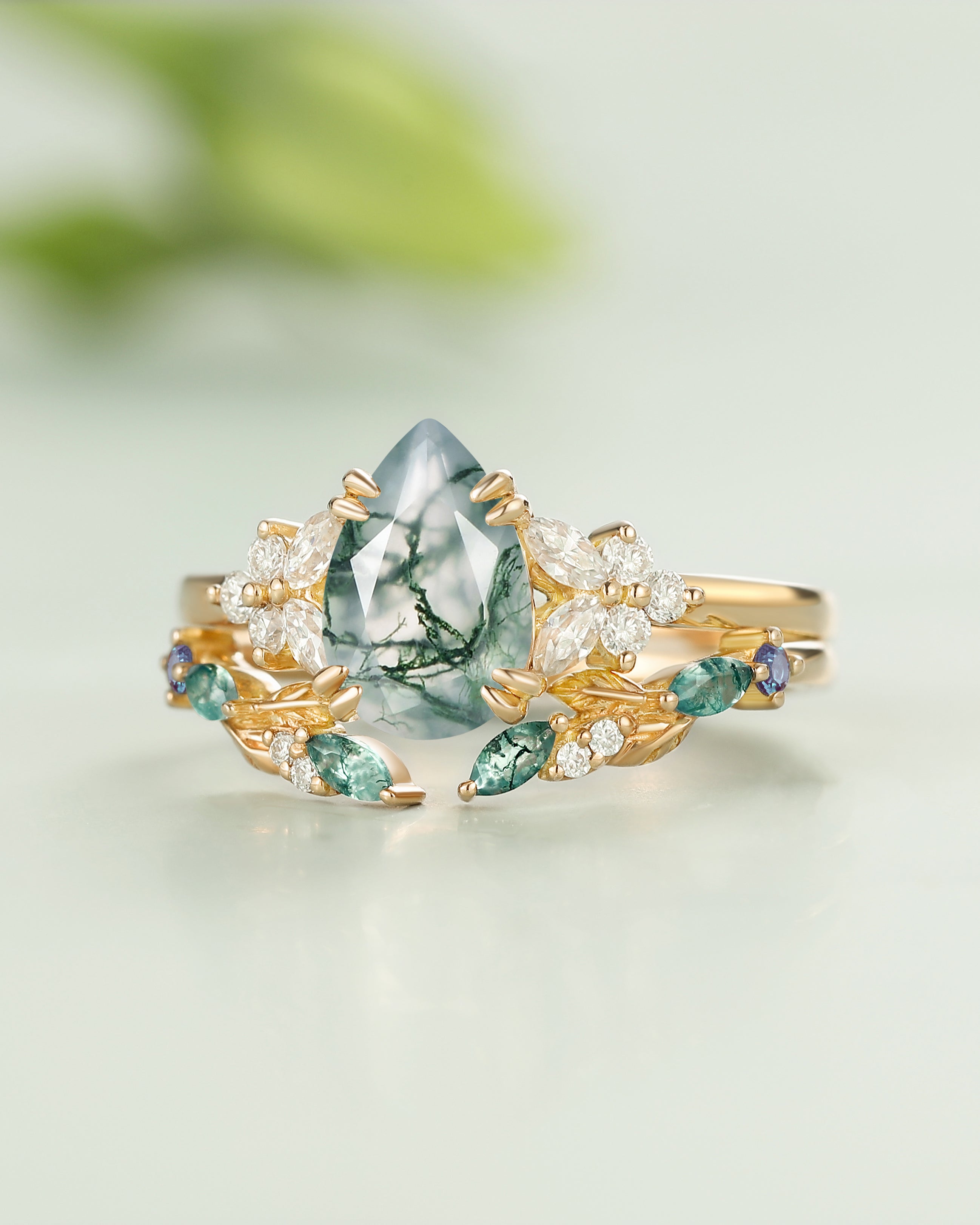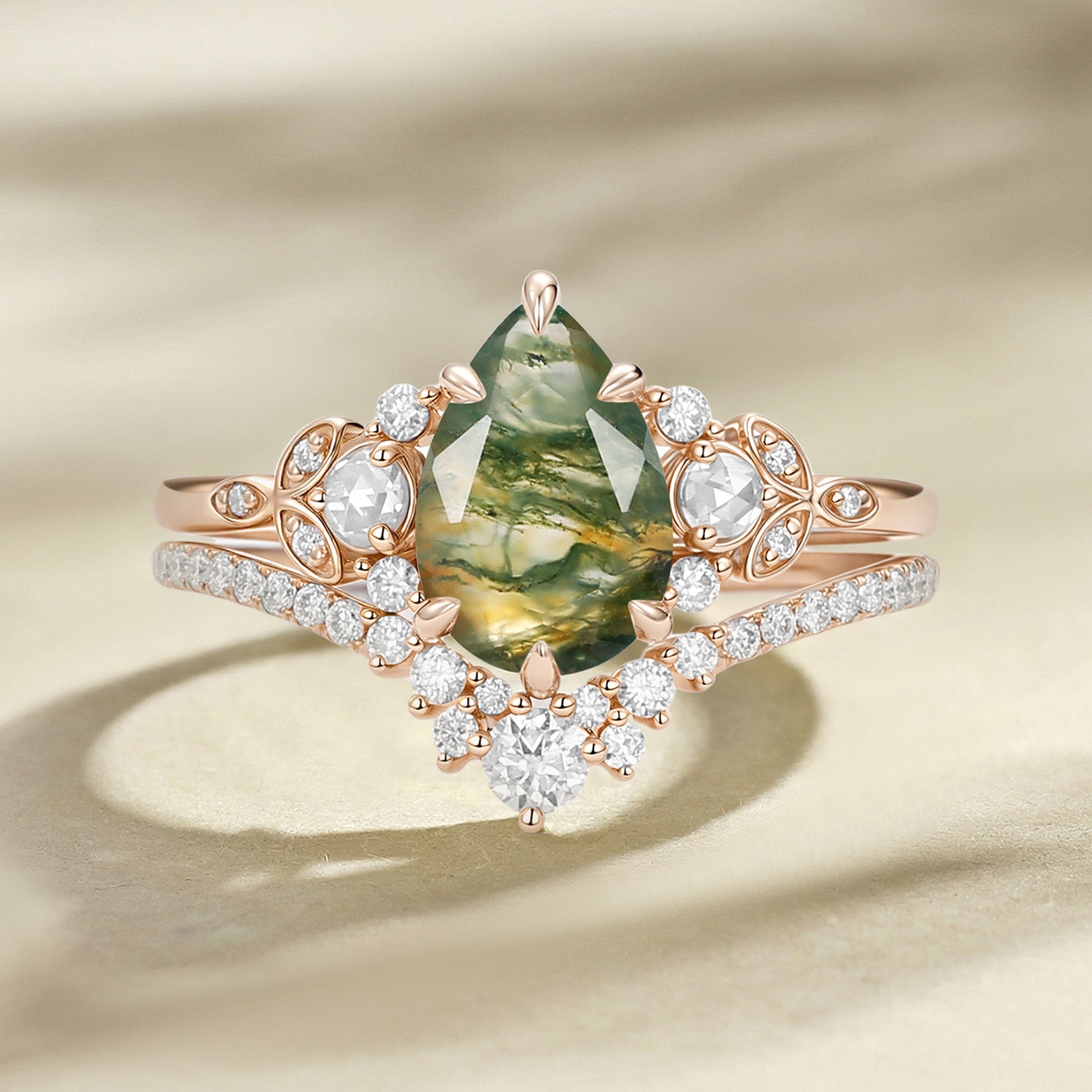 Moss Agate, a popular variety among gemstones and the aristocrat in the agate family, is widely loved and pursued by consumers. Its unique texture and pattern, reminiscent of swaying aquatic plants, creates a magical visual appeal with an excellent sense of depth. Moss agate ring makes it a perfect choice for engagement rings, symbolizing enduring love and the journey through hardship towards a fruitful relationship. Additionally, Moss Agate engagement rings are not only unique and symbolic, but also serve as affordable engagement rings, making them a great option for couples seeking a meaningful yet budget-friendly choice. Just as no two pieces of Moss Agate are identical, so too is every couple's love story unique and enchanting.