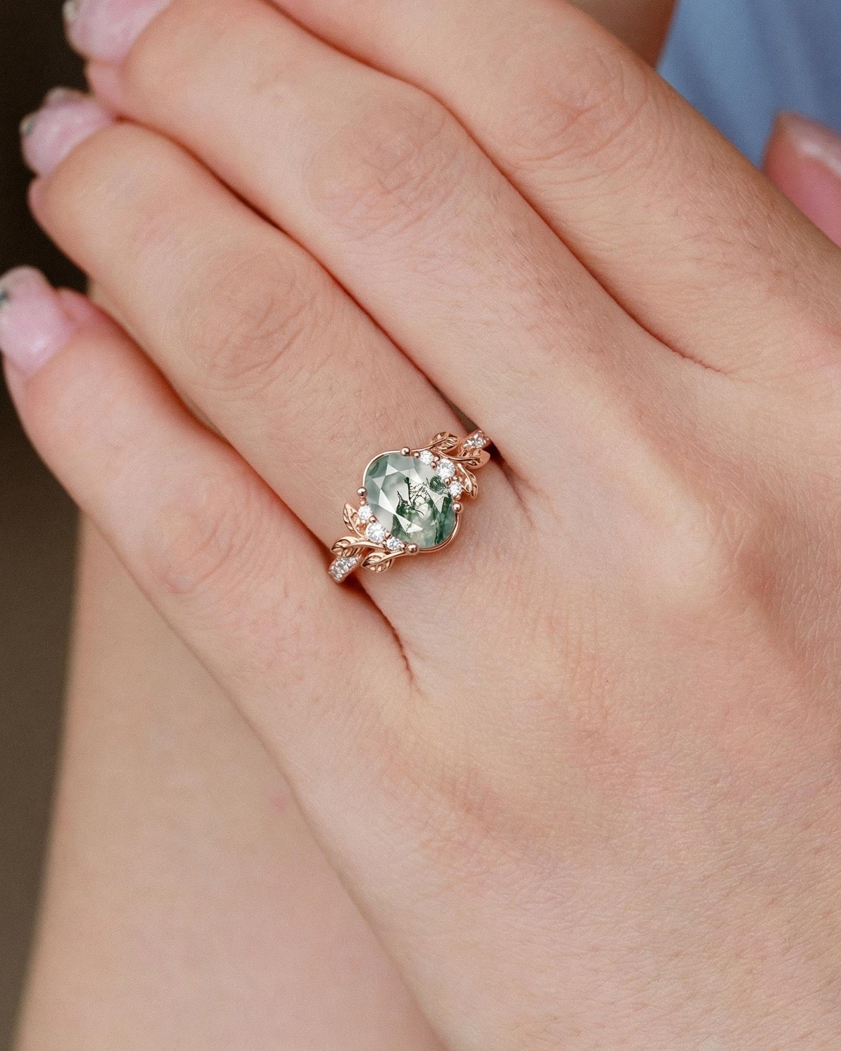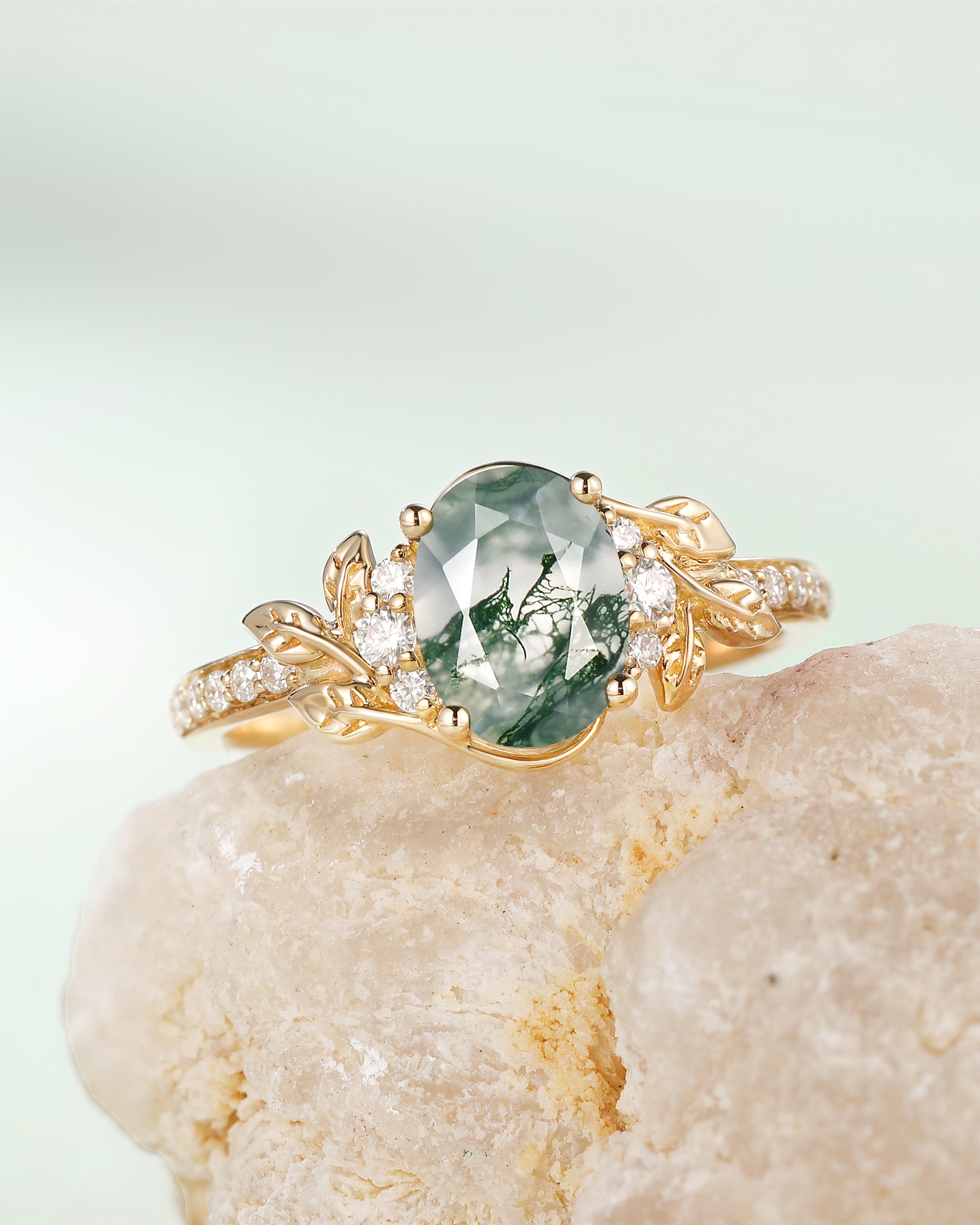 The hardness of moss agate is 6.5-7, so please rest assured that this is enough to make it a long-lasting engagement ring. We also offer moss agate stone selection services. If you purchase a moss agate engagement ring, you can contact our customer service to select the stone.