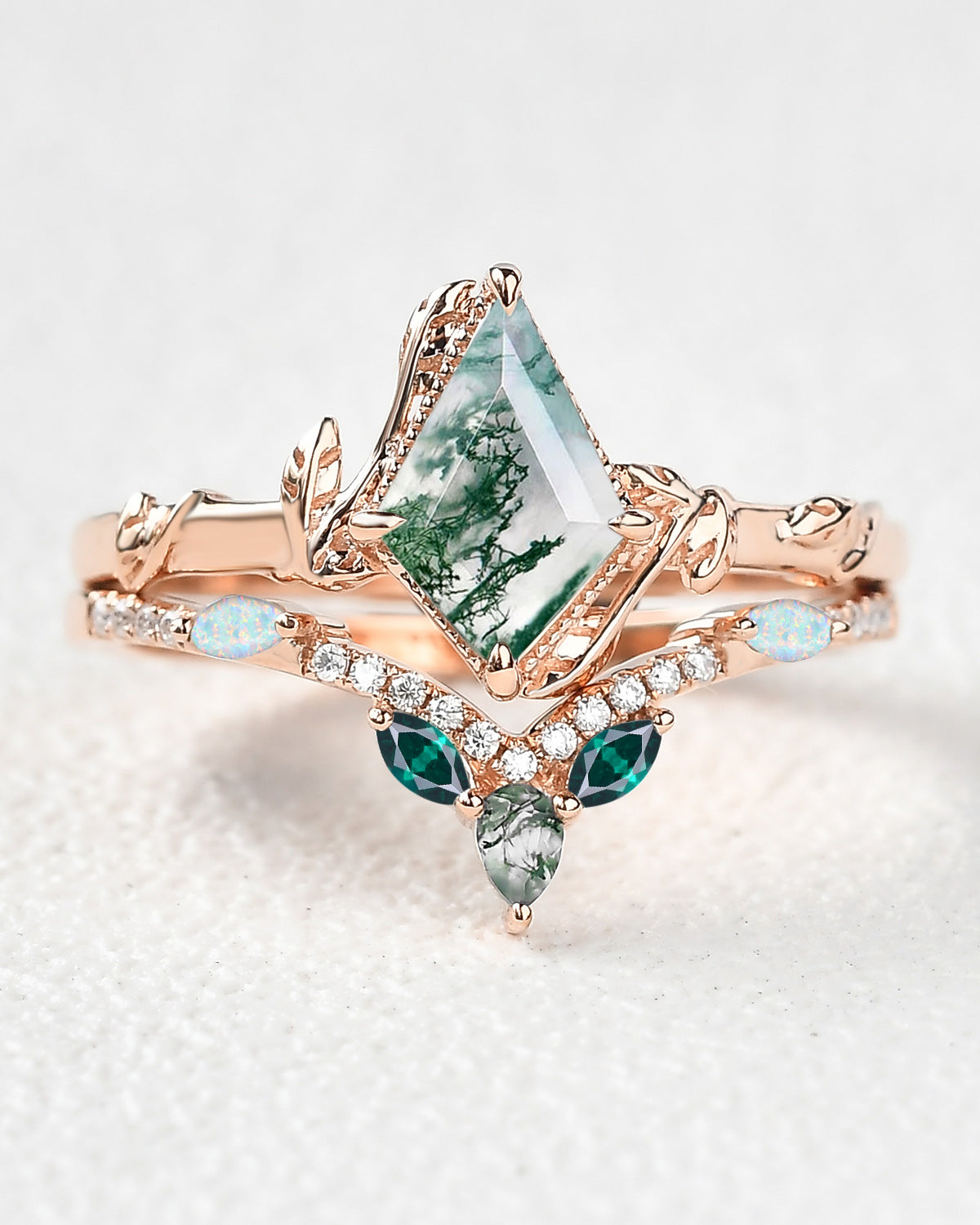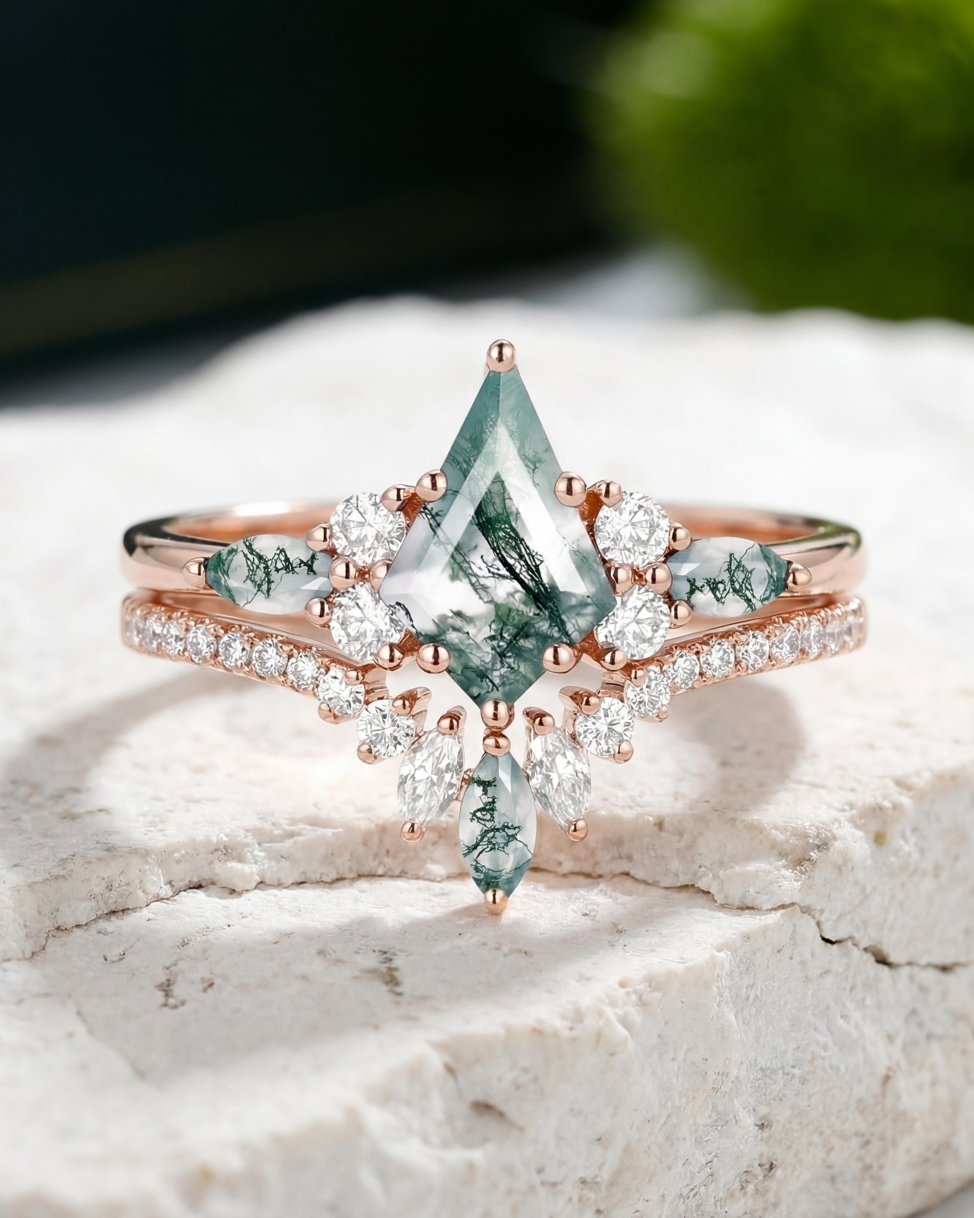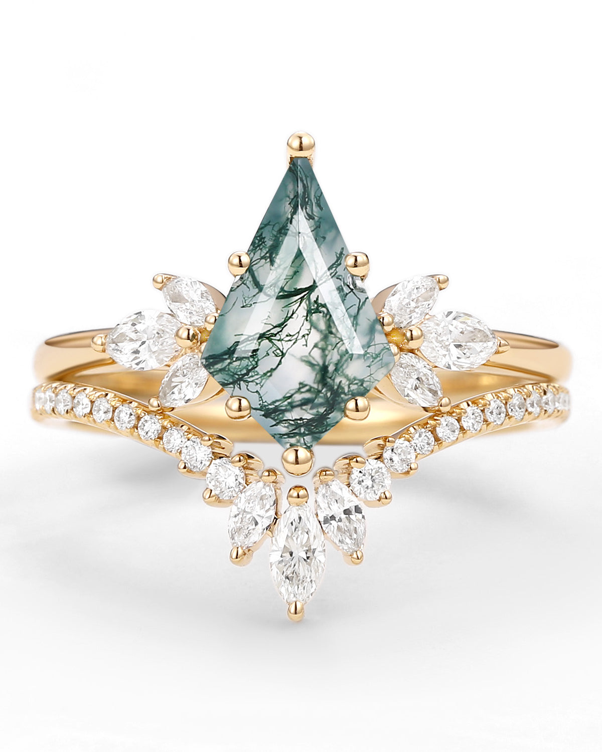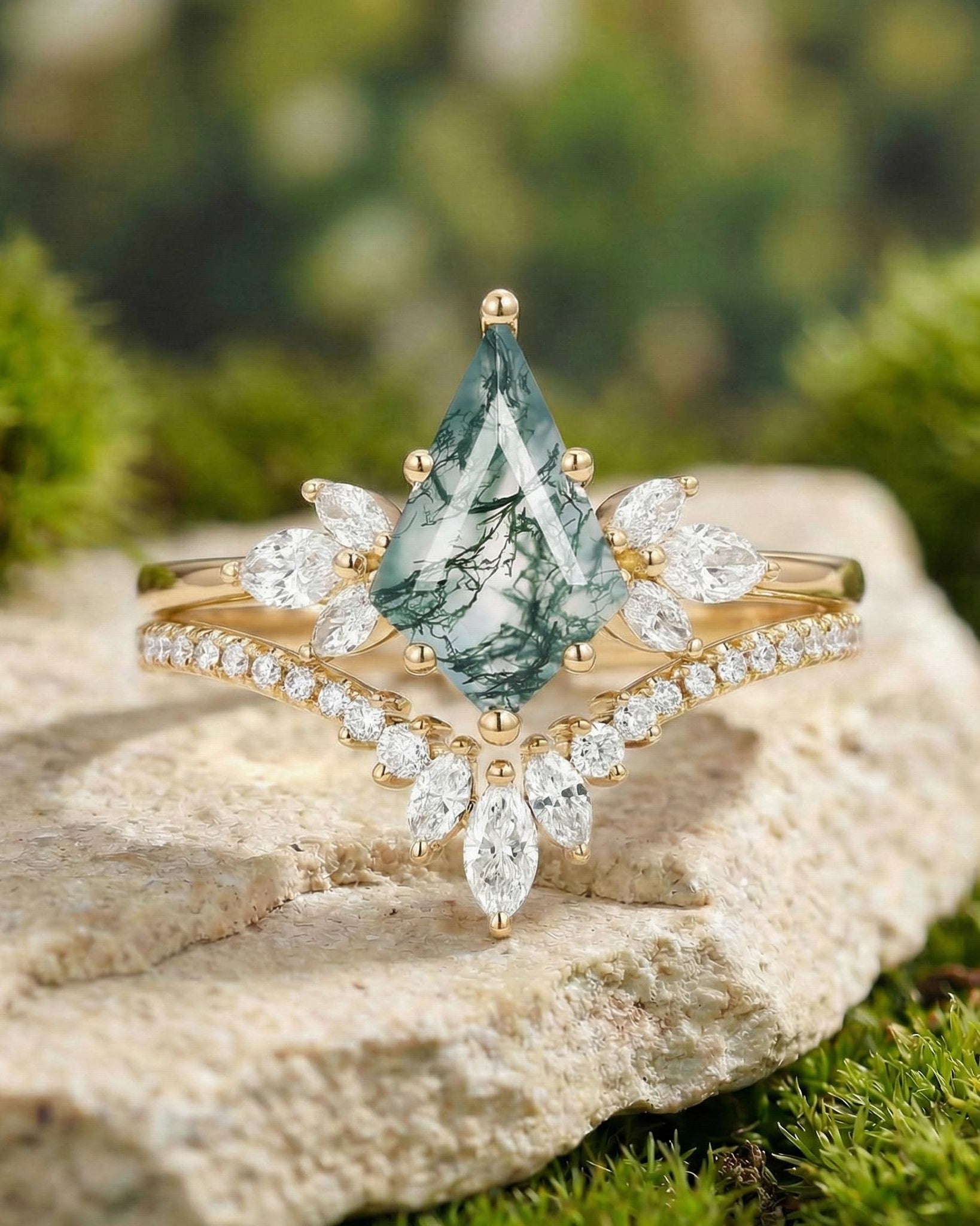 We offer you Kite-shaped Moss Agate rings, the Kite-shaped cut makes these rings even more eye-catching, showcasing the beautiful texture and color of Moss Agate. Each ring is carefully selected to ensure the perfect combination of quality and craftsmanship. Whether given as a gift or worn on your own, these kite-shaped moss agate rings will become a treasured addition to your collection. Come and choose your favorite style to show your unique personality and taste!