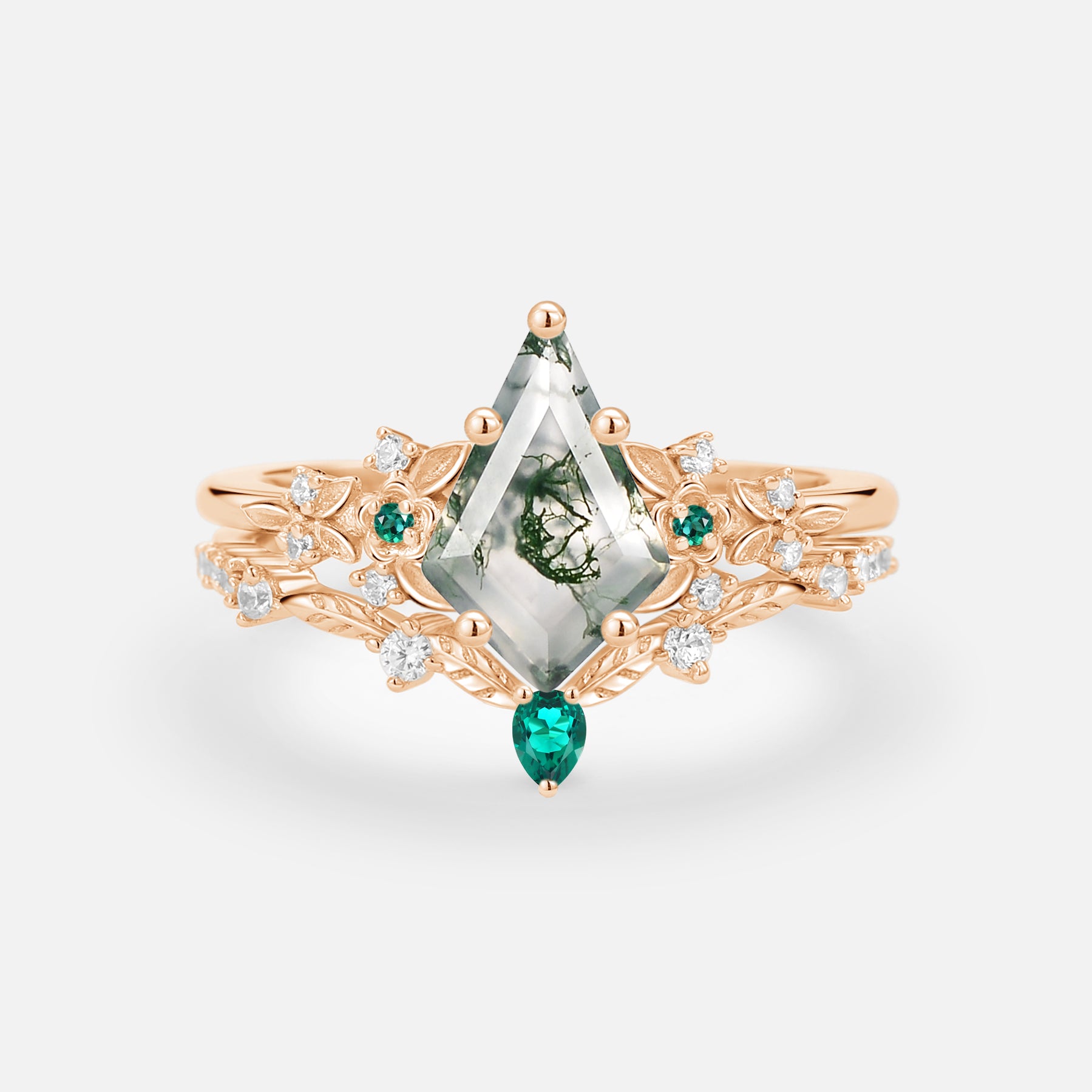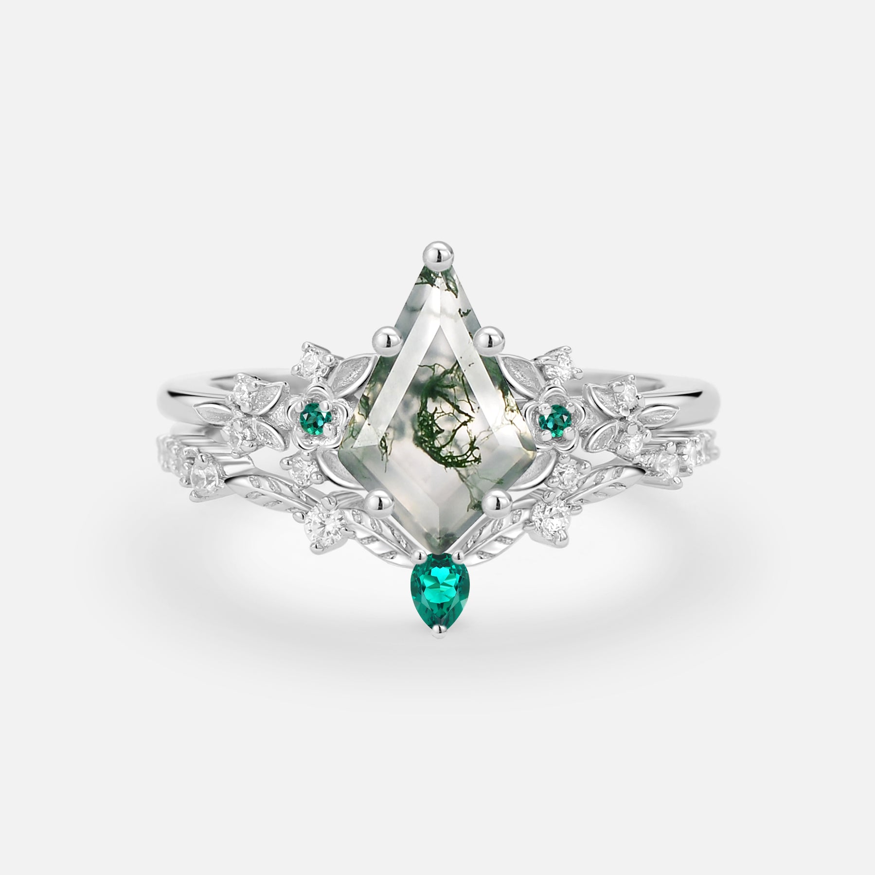 Kite Shaped Moss Agate Flower Bridal Ring Set 2pcs - Loretta