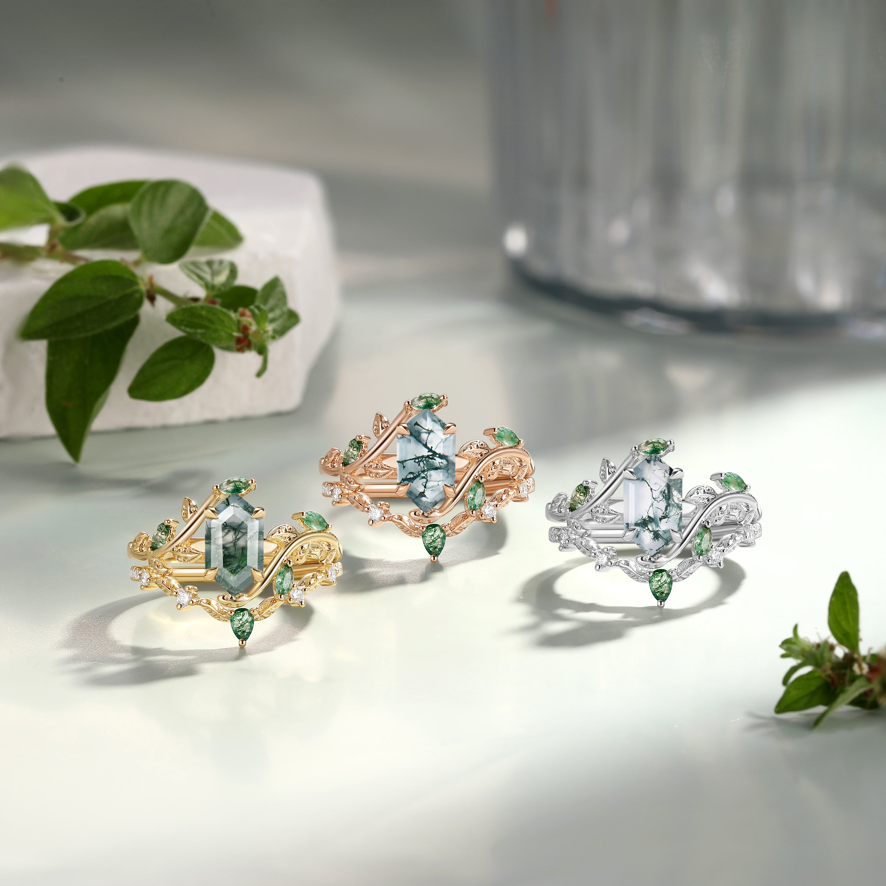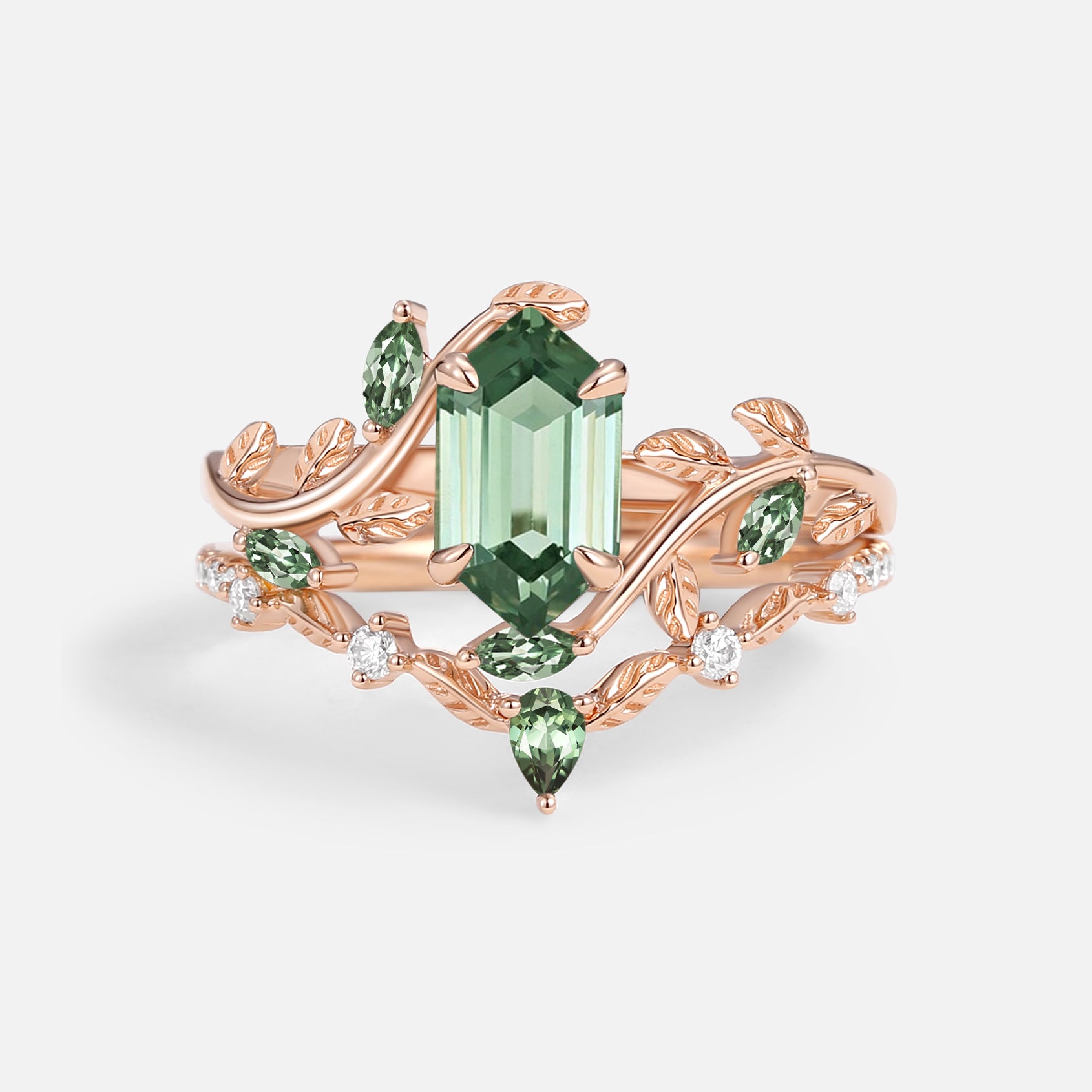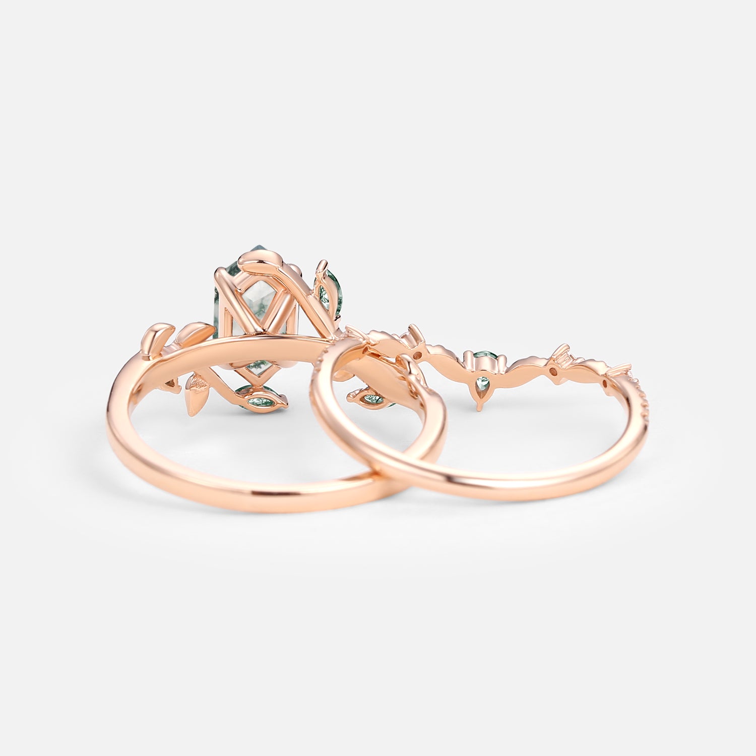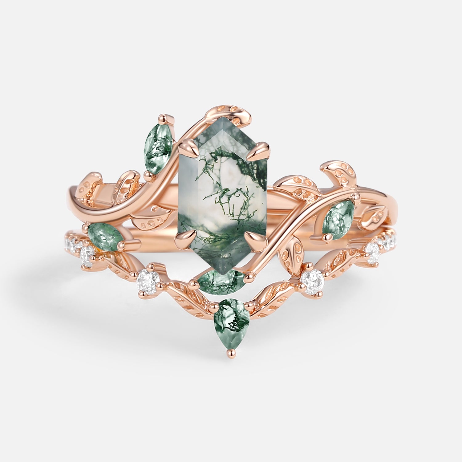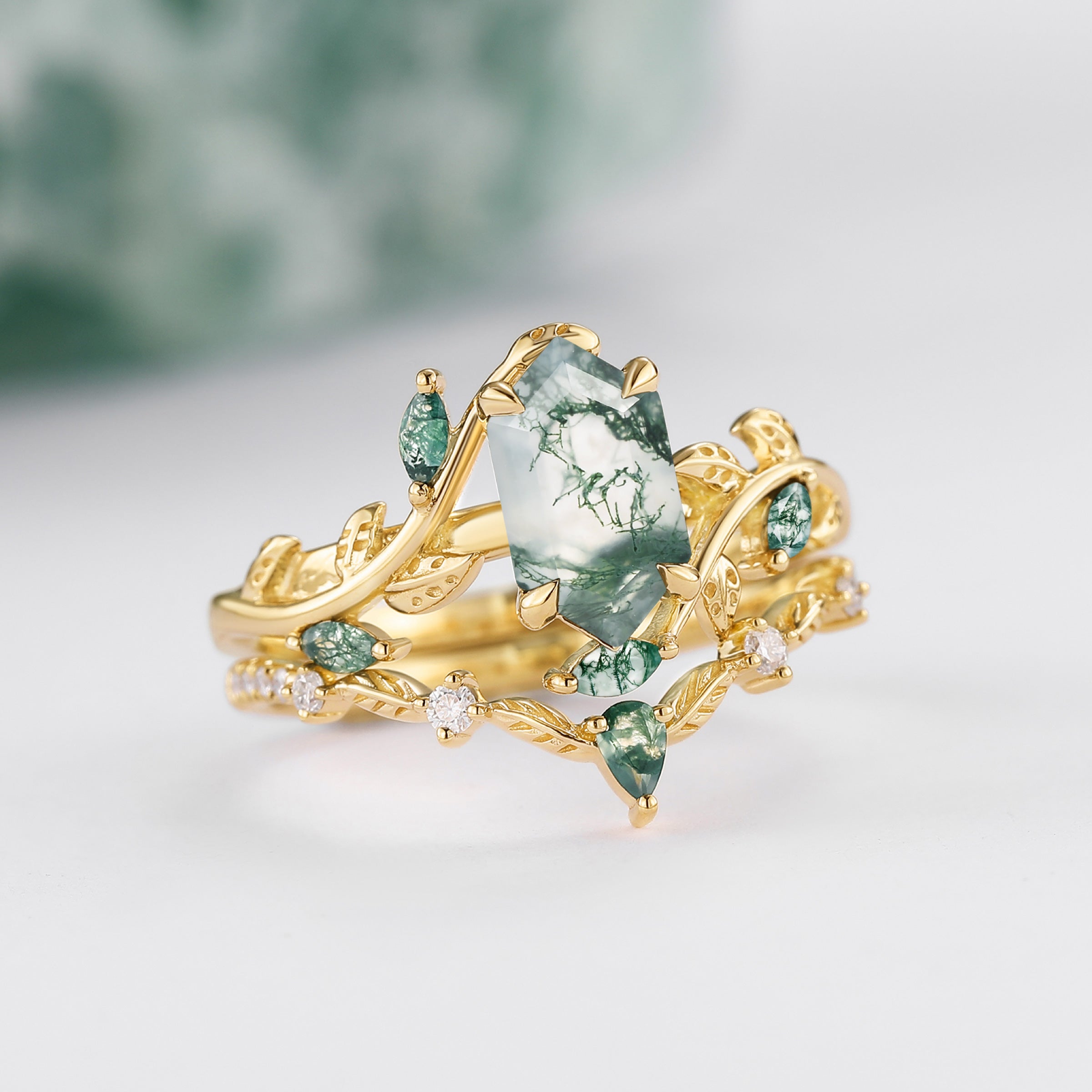 Green Moss Agate Long Hexagon Vine Engagement Ring Set 2pcs - Daphne