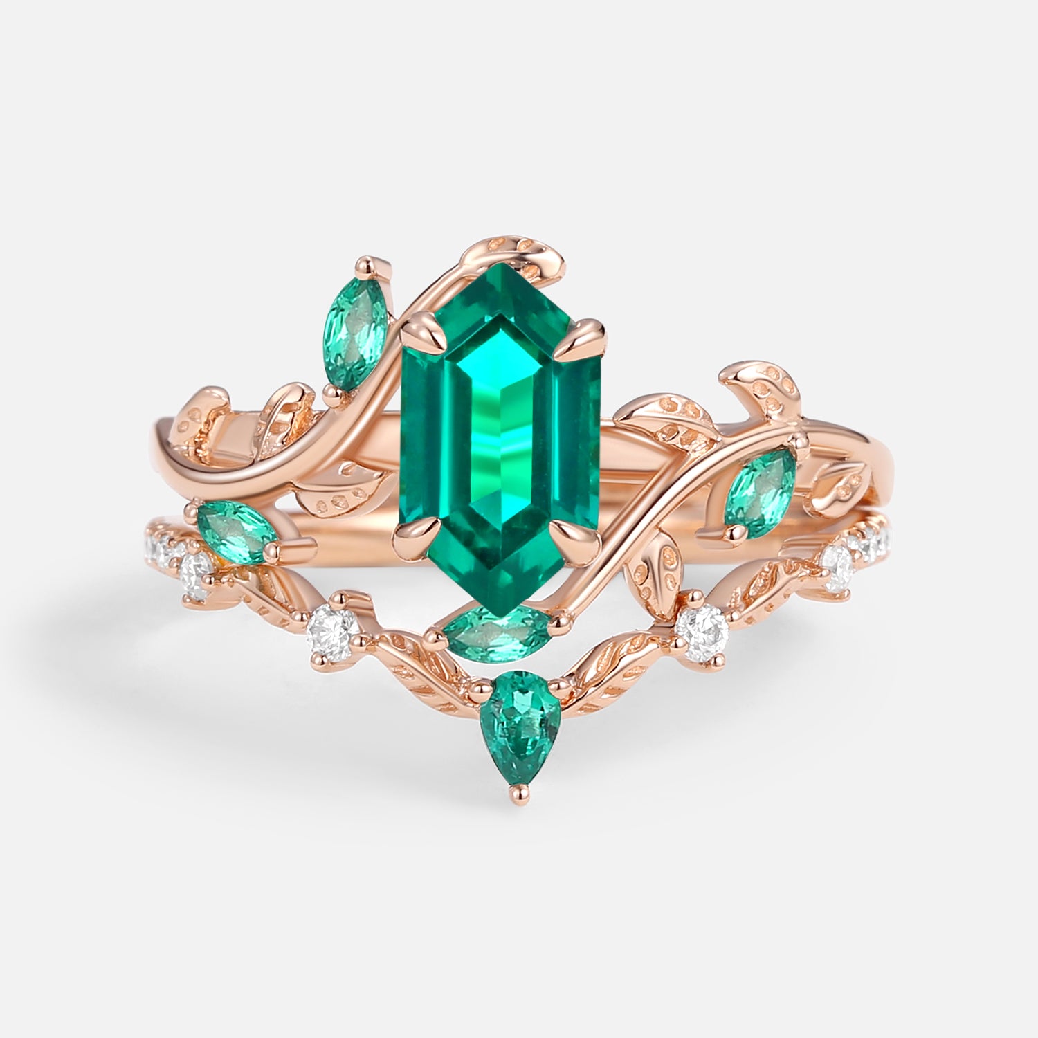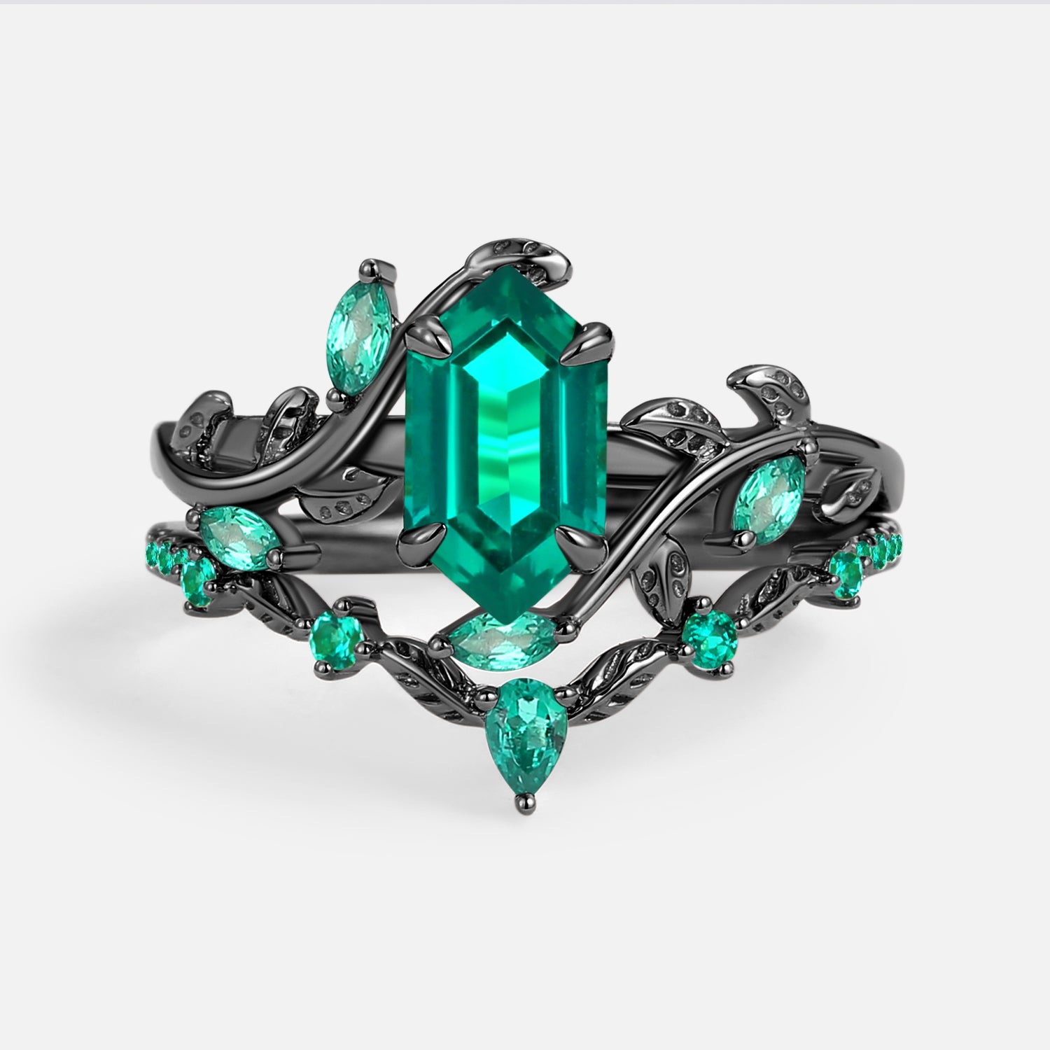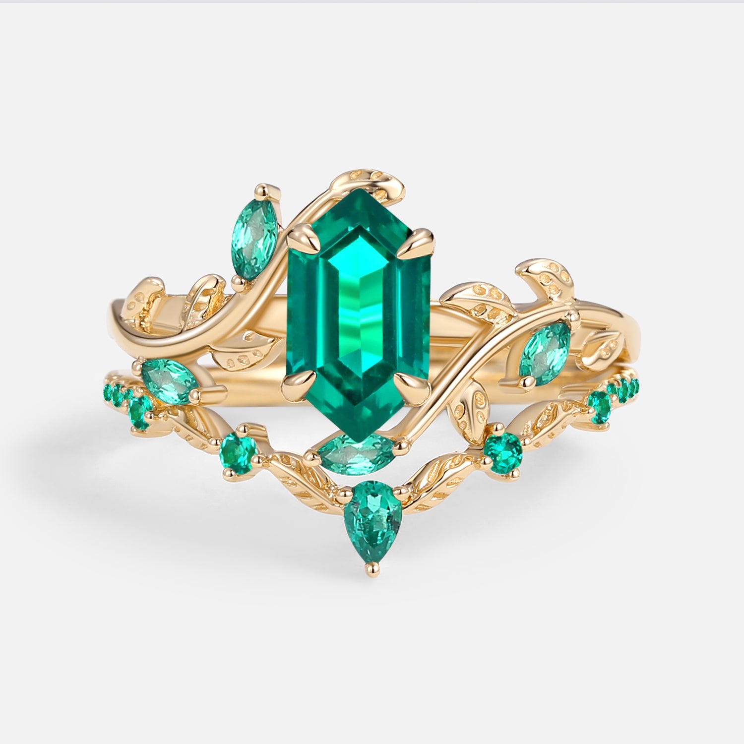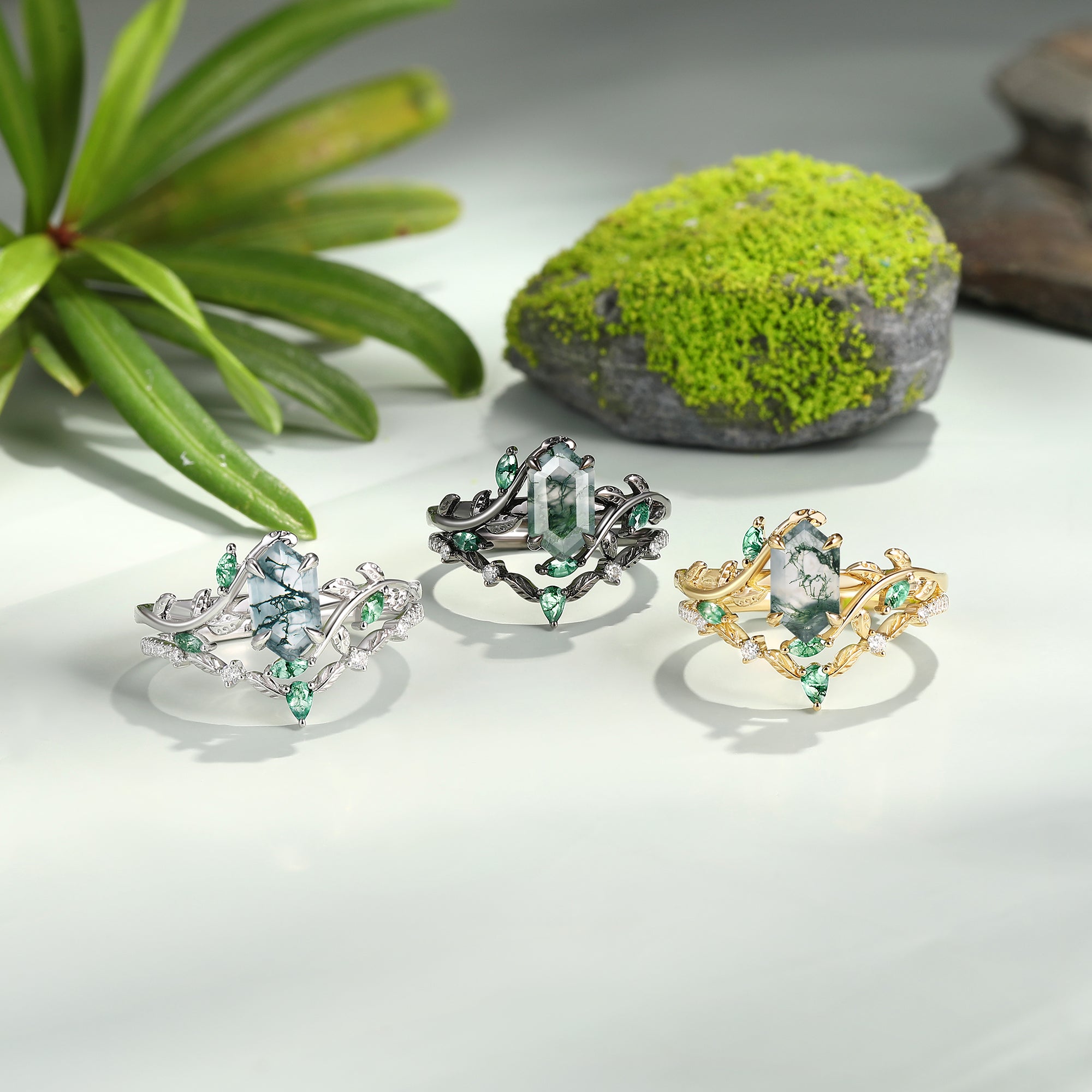 Green Moss Agate Long Hexagon Vine Engagement Ring Set 2pcs - Daphne