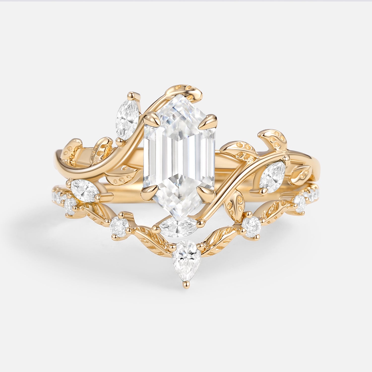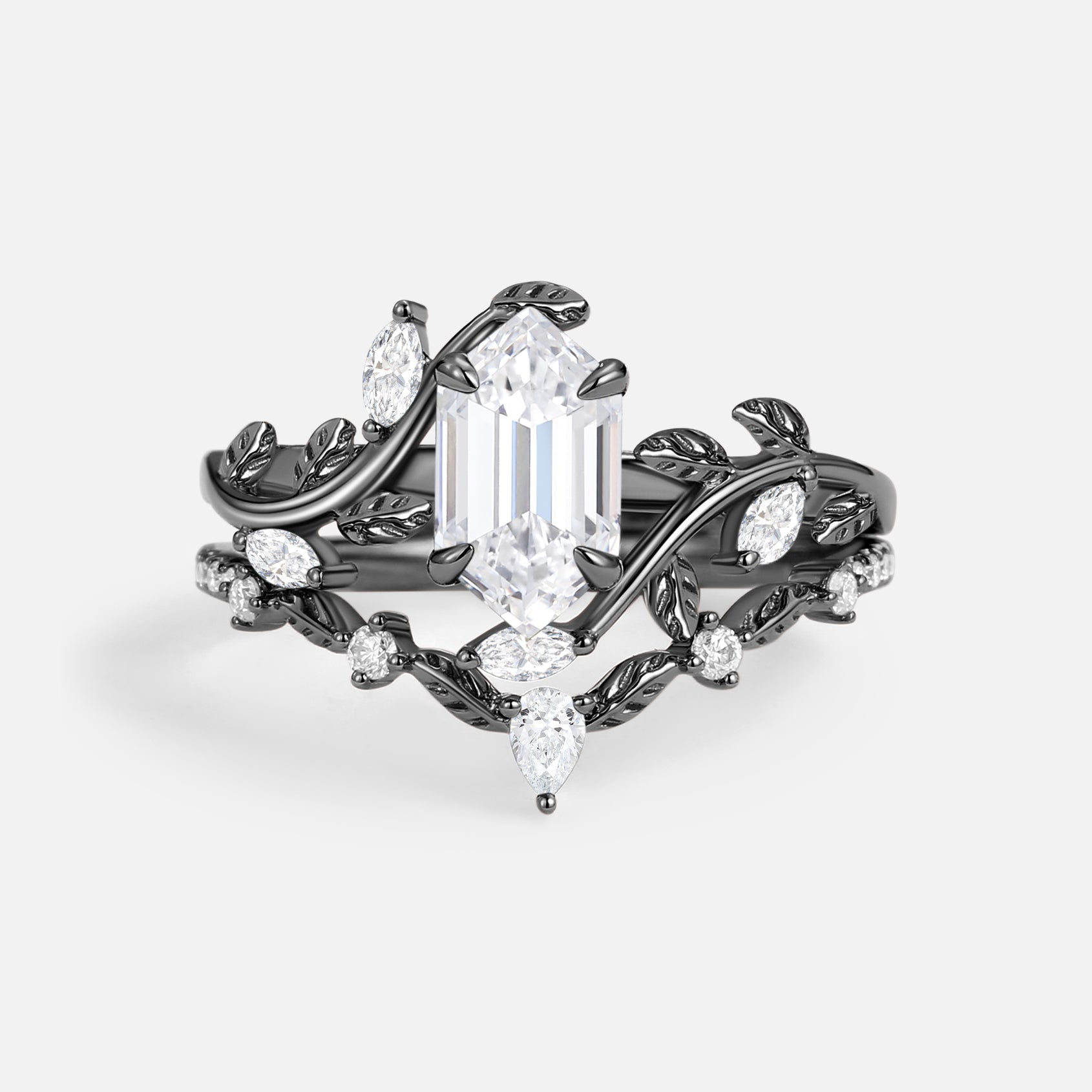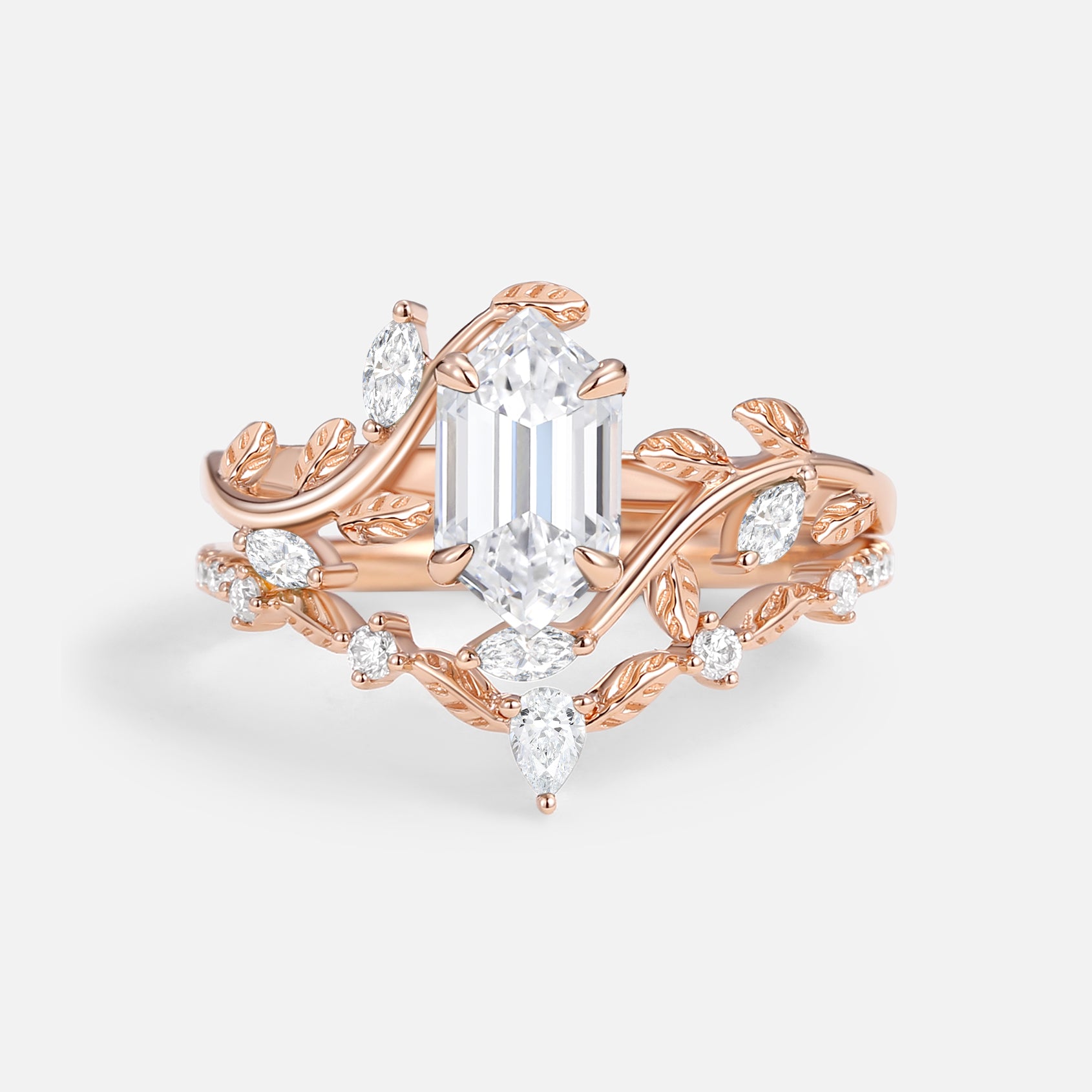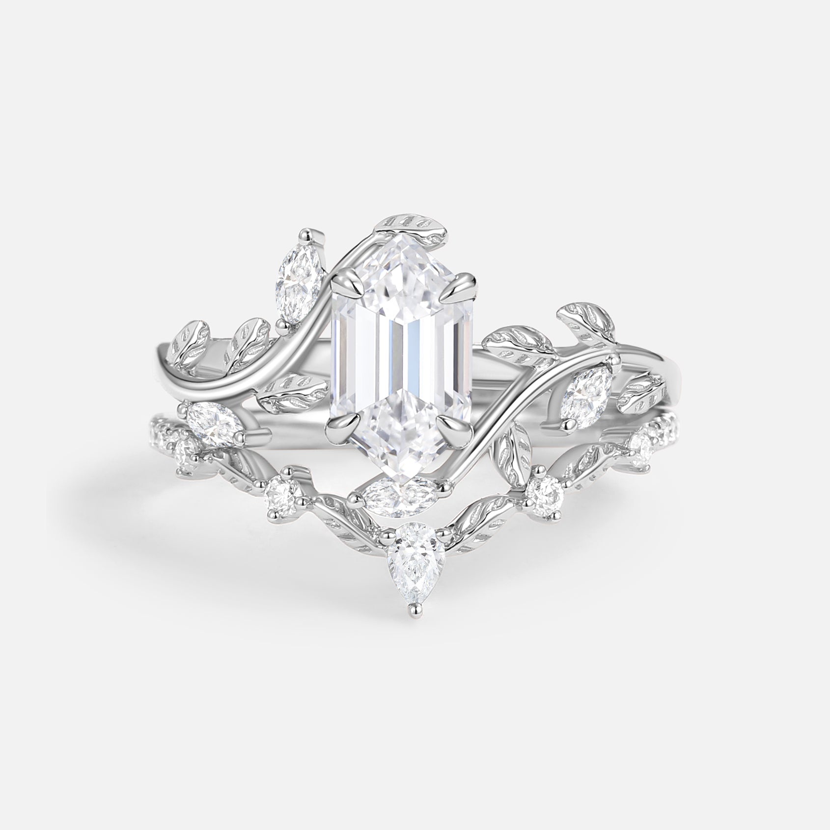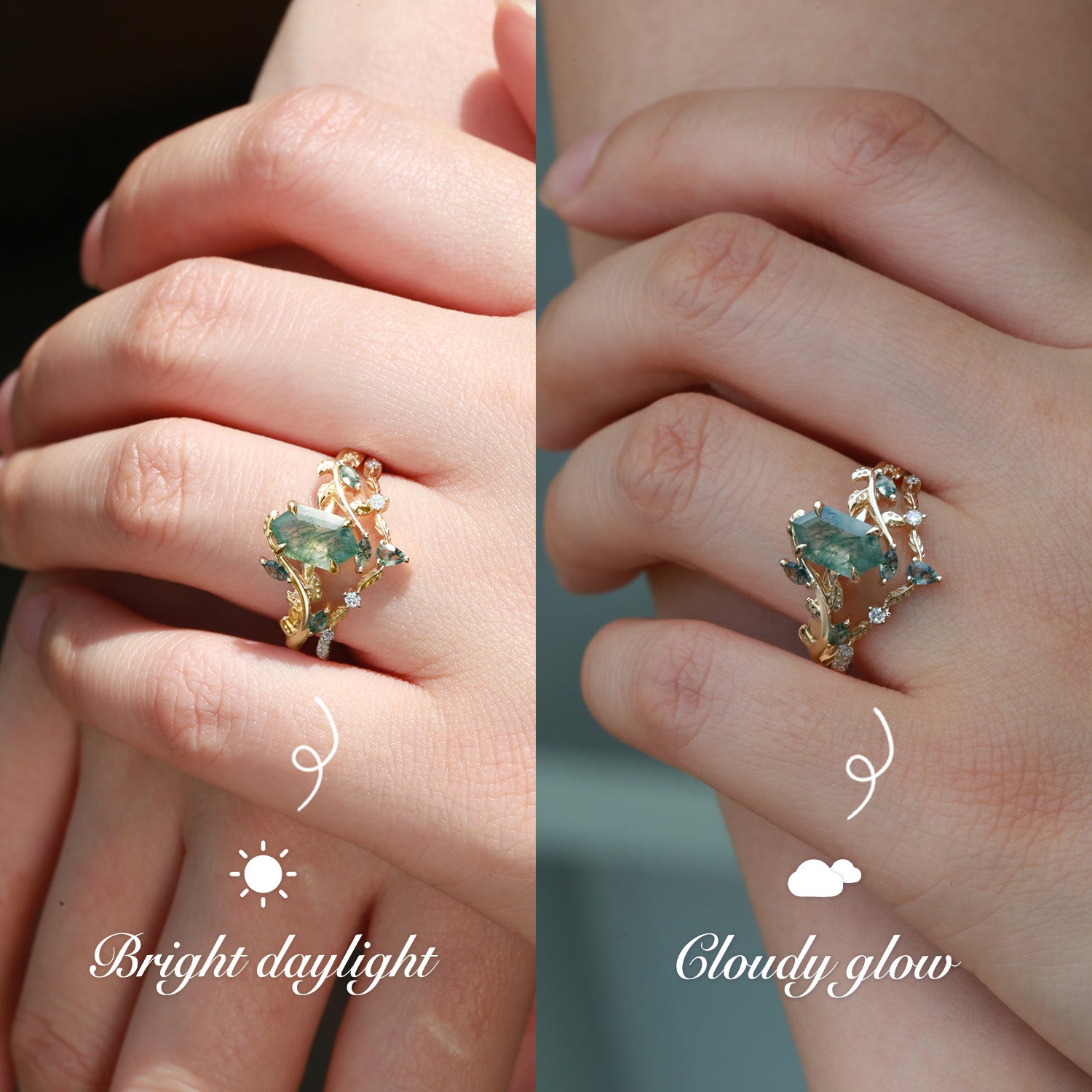 Green Moss Agate Long Hexagon Vine Engagement Ring Set 2pcs - Daphne