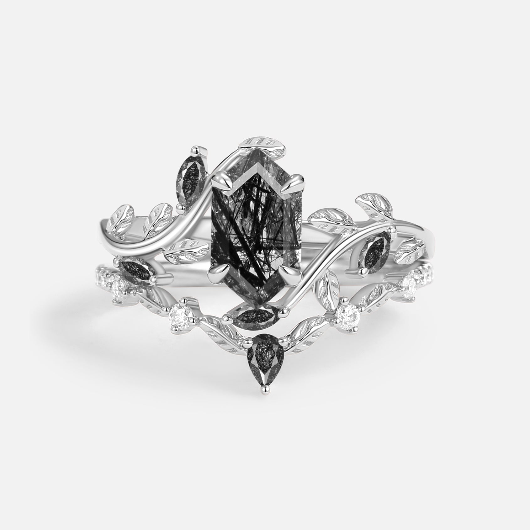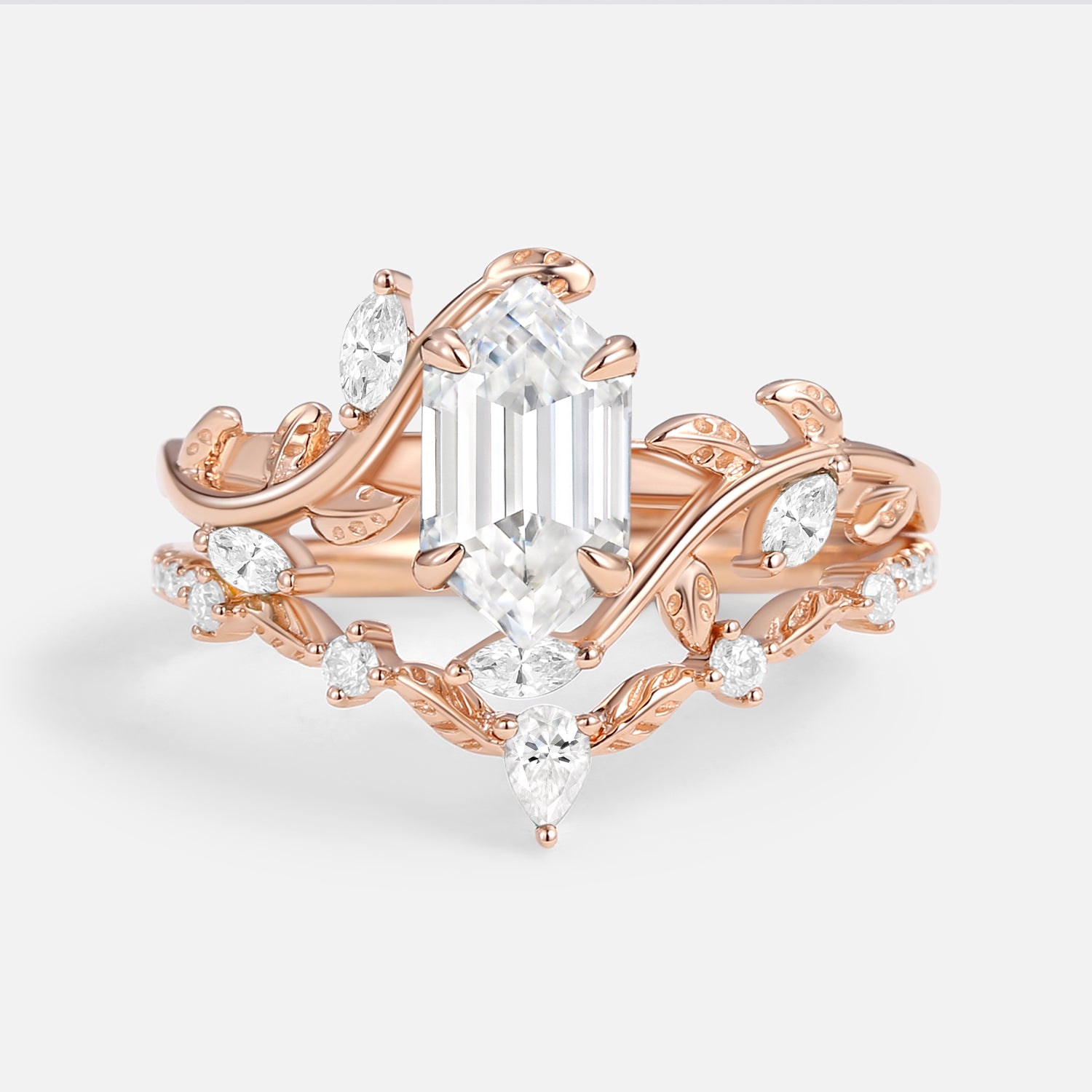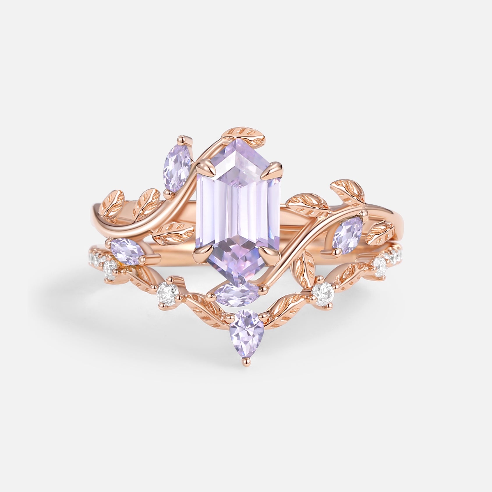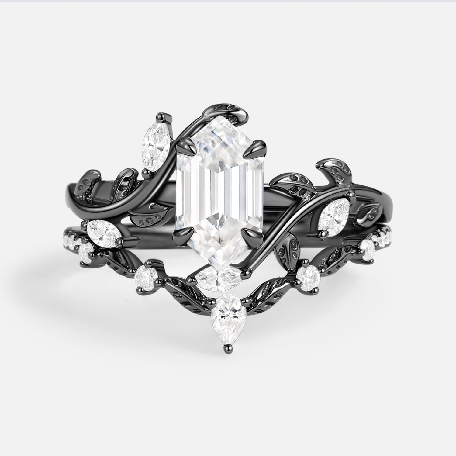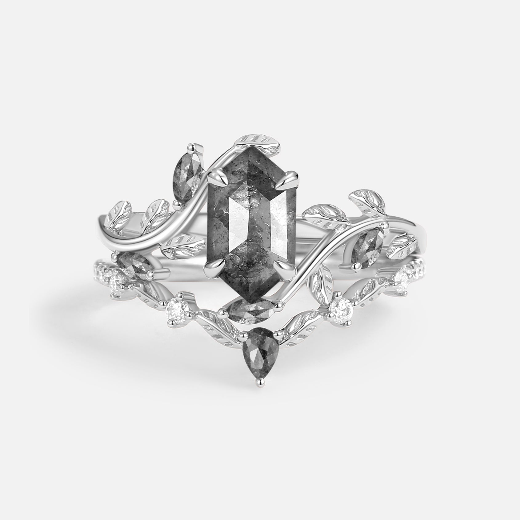Green Moss Agate Long Hexagon Vine Engagement Ring Set 2pcs - Daphne