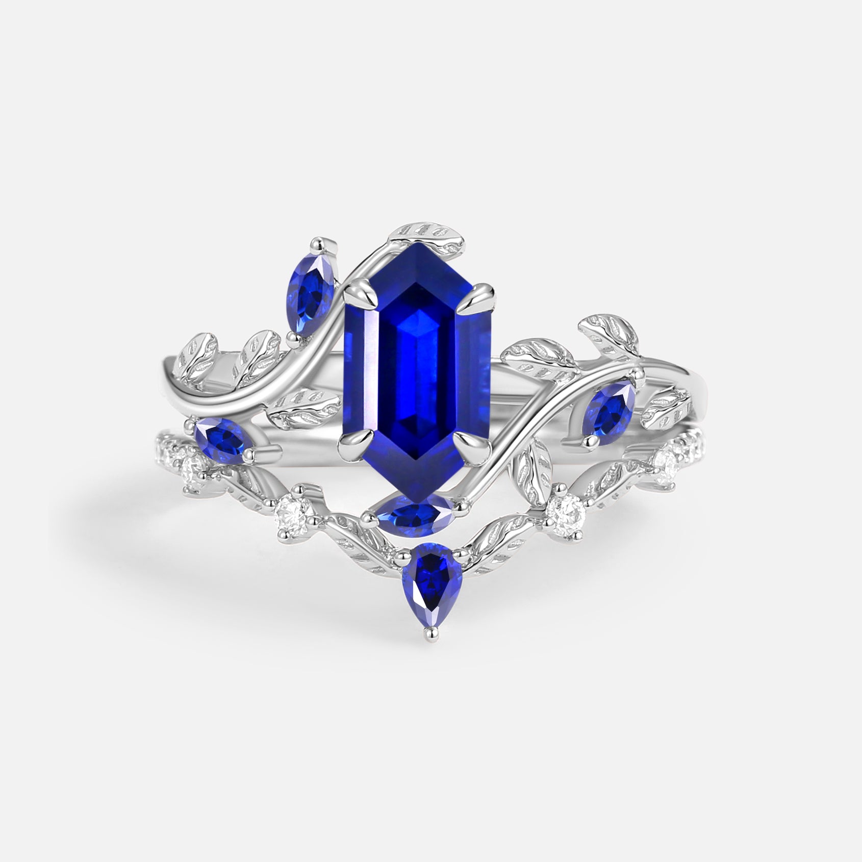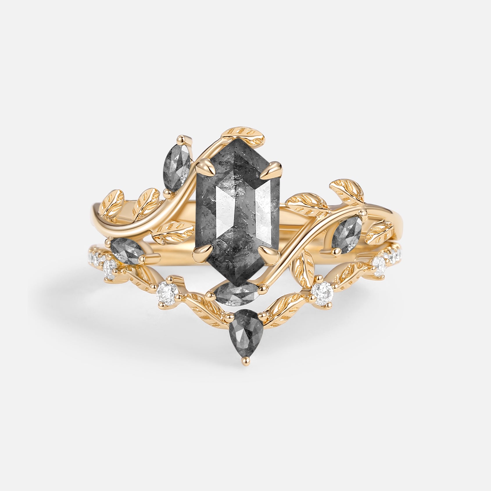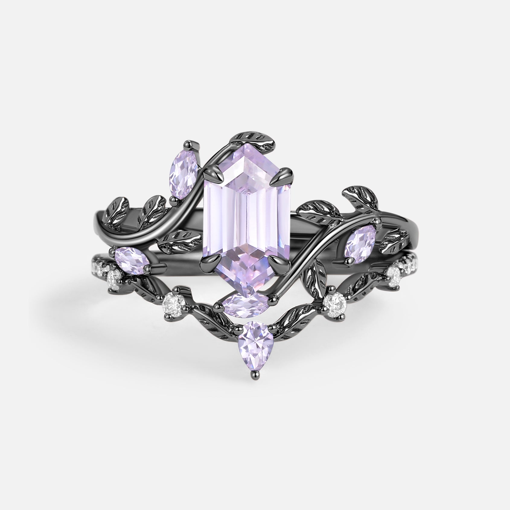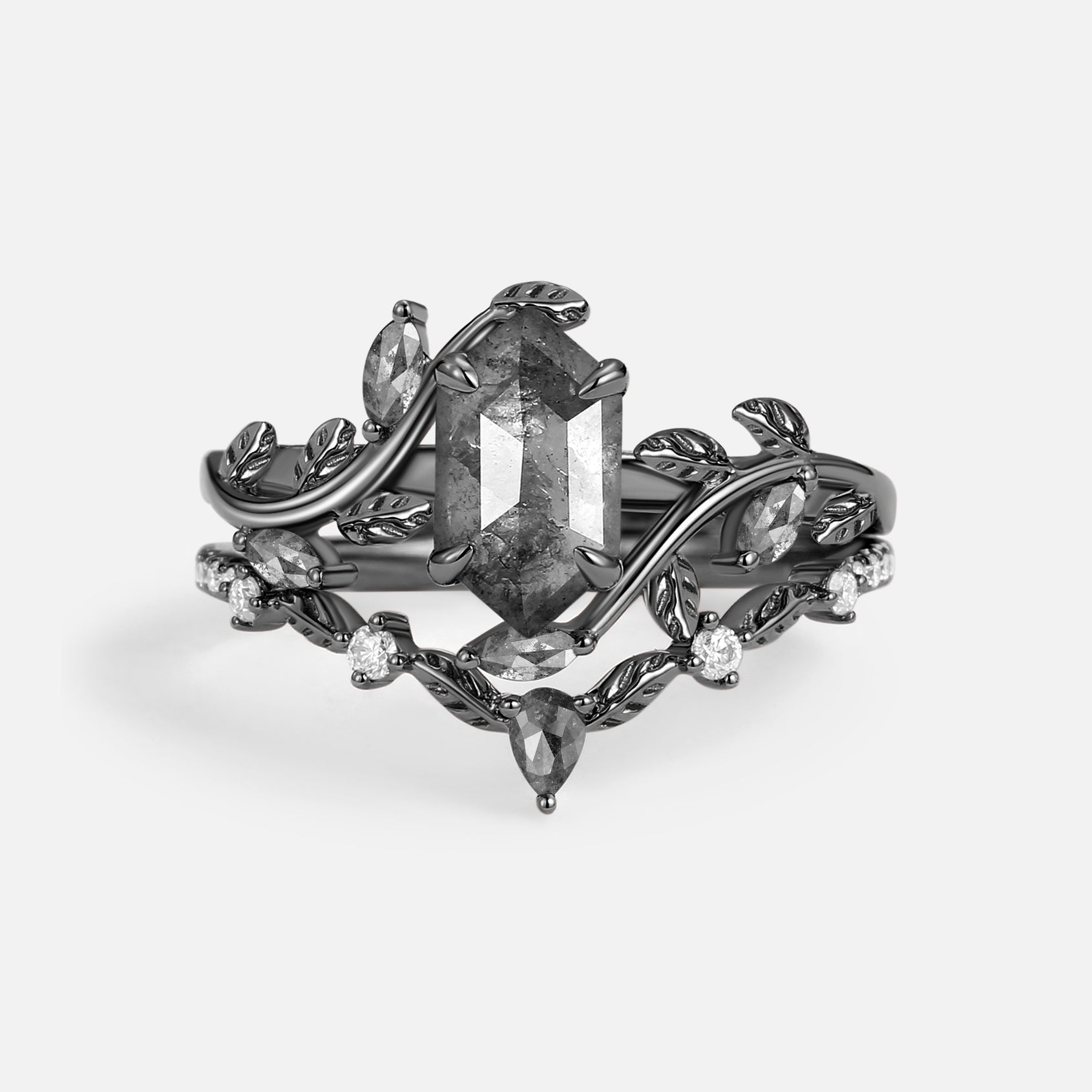 Green Moss Agate Long Hexagon Vine Engagement Ring Set 2pcs - Daphne
