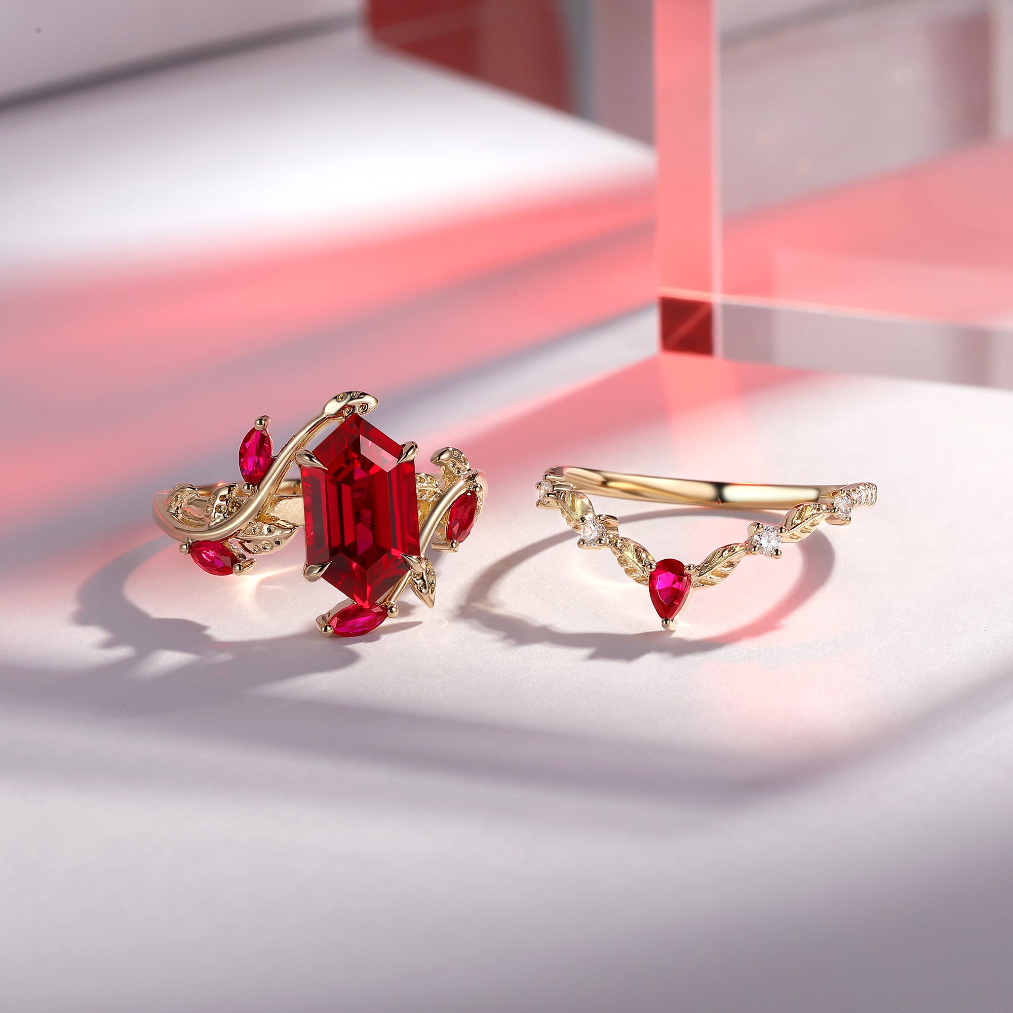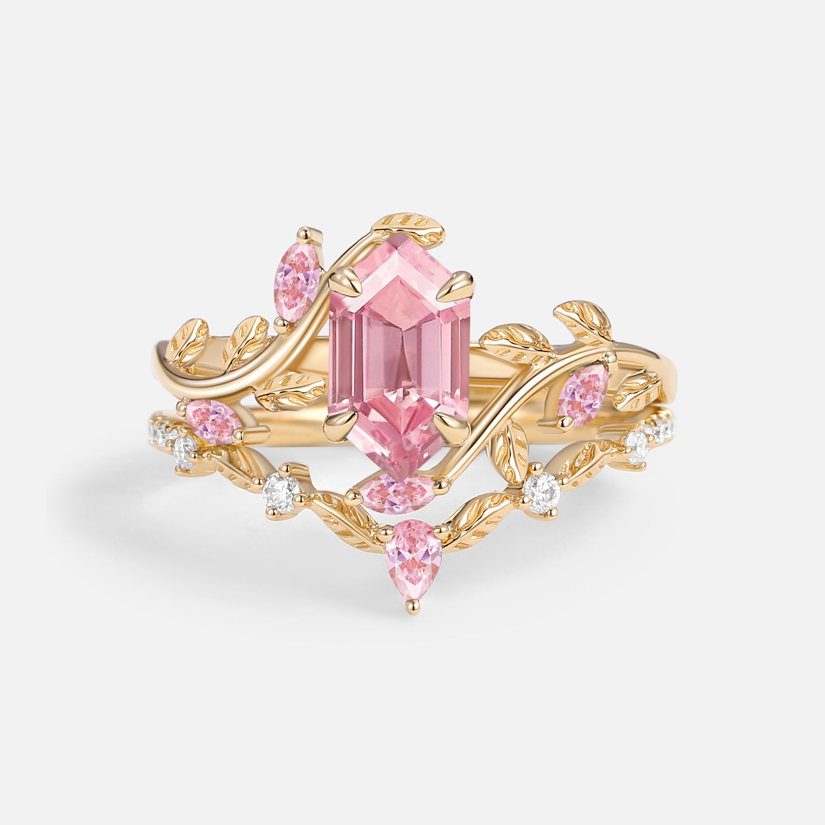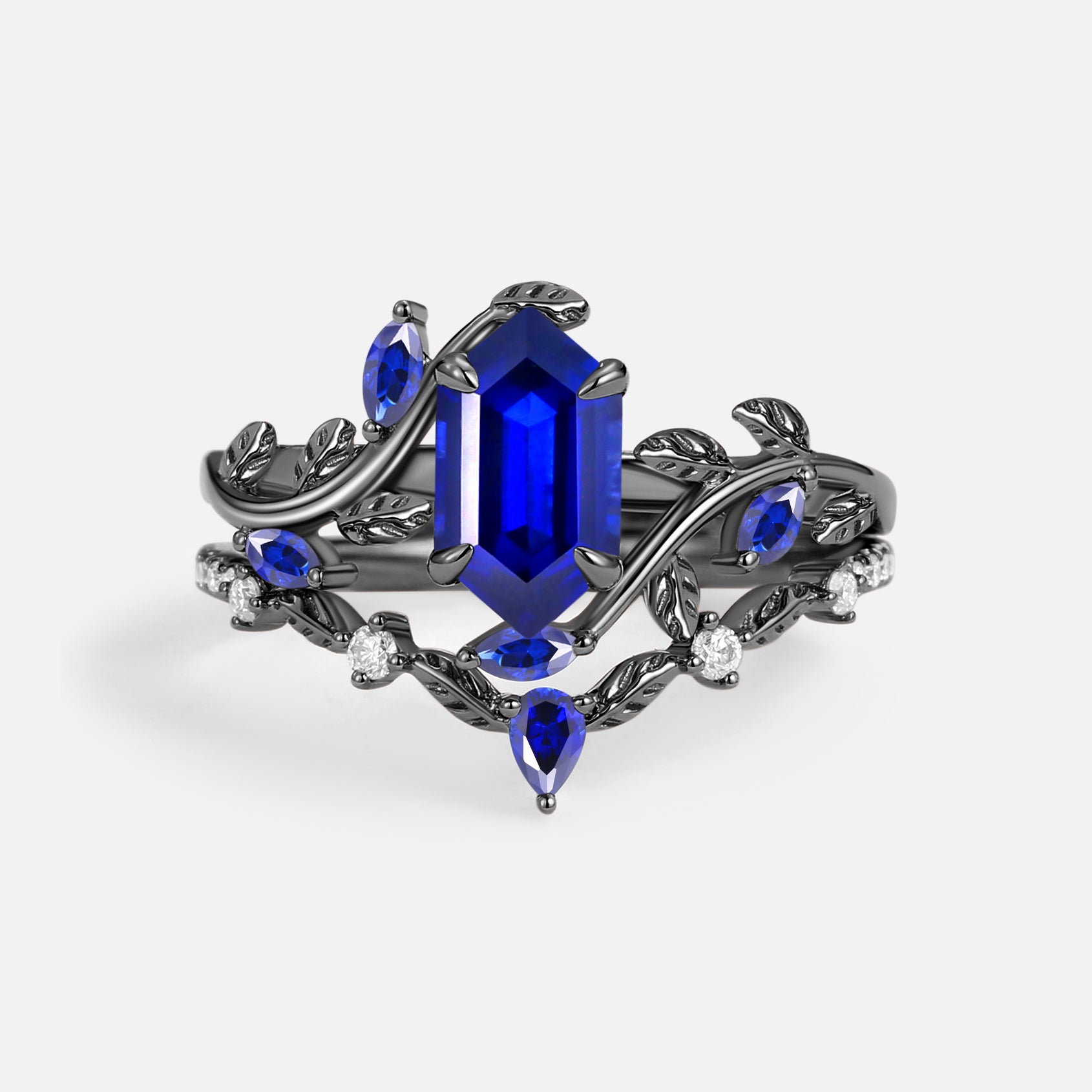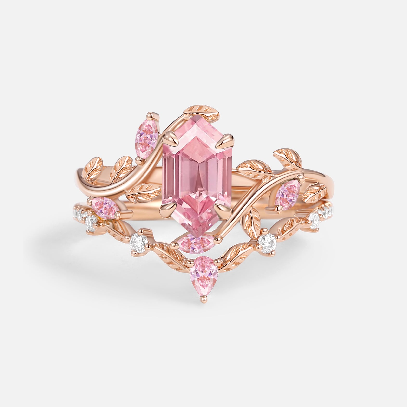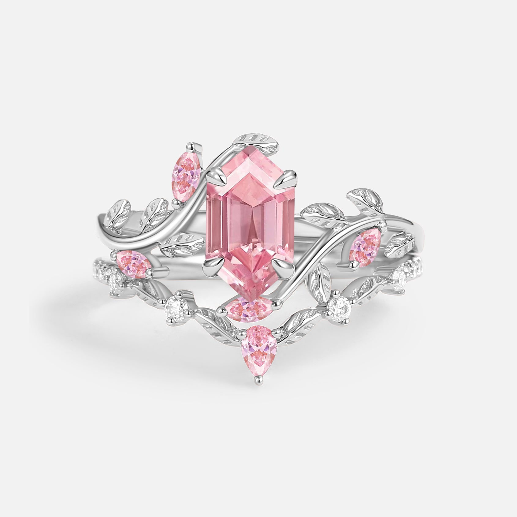 Green Moss Agate Long Hexagon Vine Engagement Ring Set 2pcs - Daphne