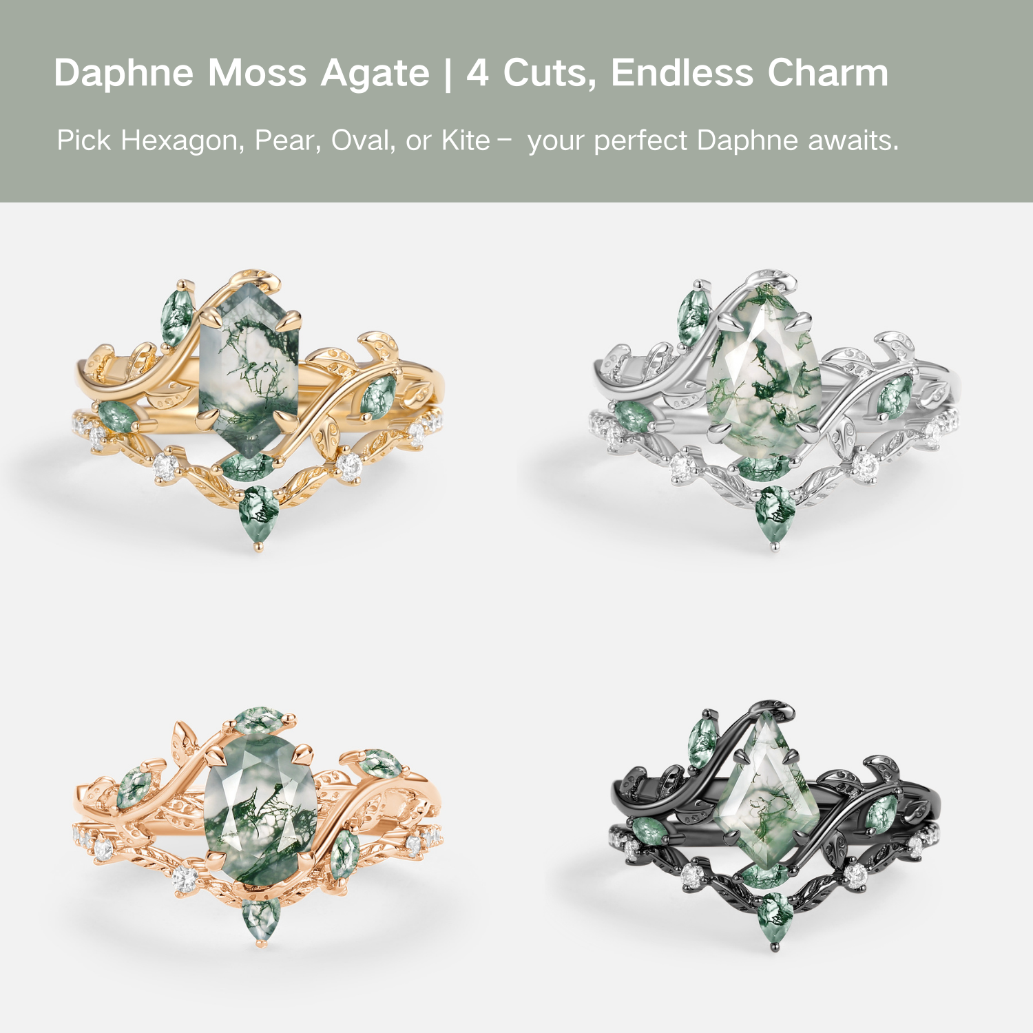 Celebrate nature’s gentle charm with the Daphne engagement ring. At its center, a luminous green moss agate shines in an elegant pear cut, showcasing delicate foliar traces that resemble tiny snippets of a sunlit forest frozen in stone. Firmly anchored by four sleek prongs, the band is adorned with twisting vine motifs accented by tiny leaf details, infusing it with an added layer of organic grace. This pear-shaped Daphne ring is crafted to embody flourishing love and a deep bond with the natural world.