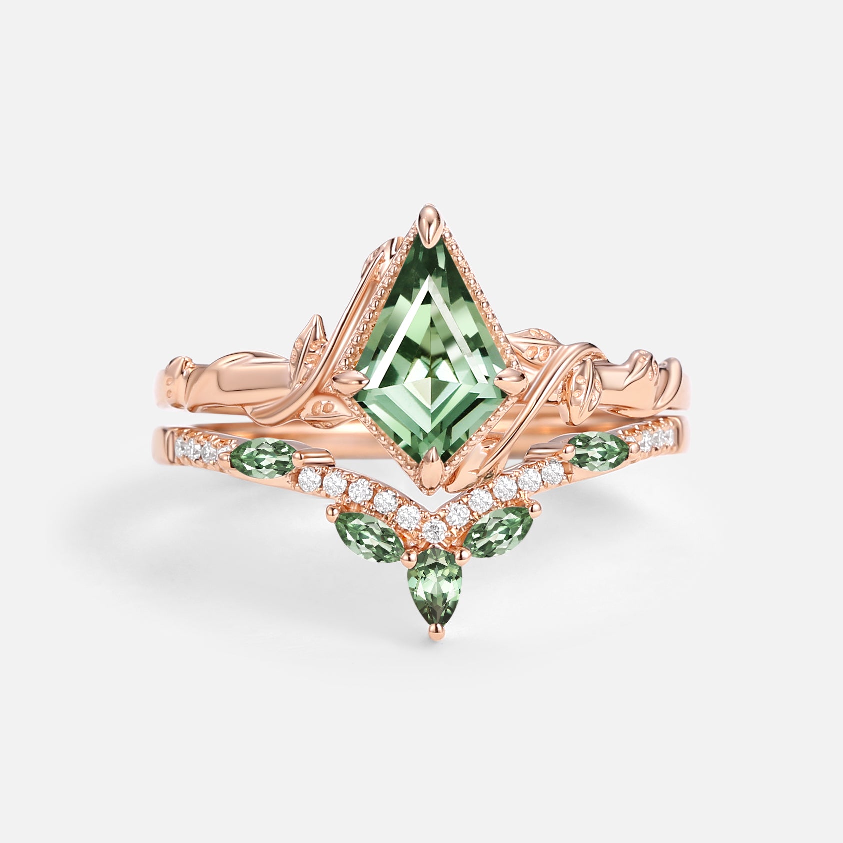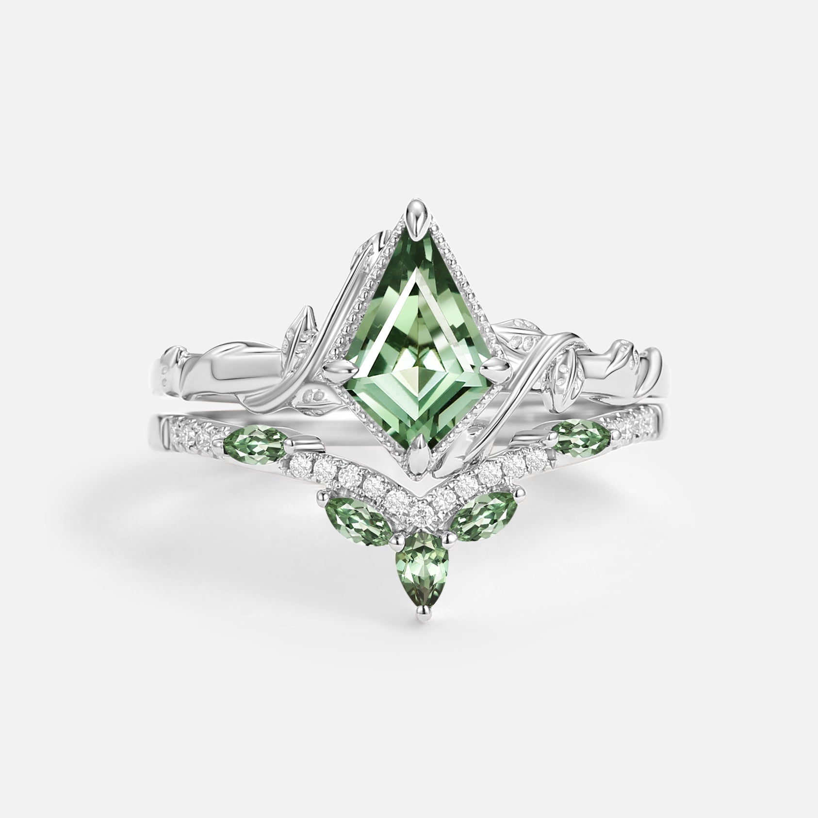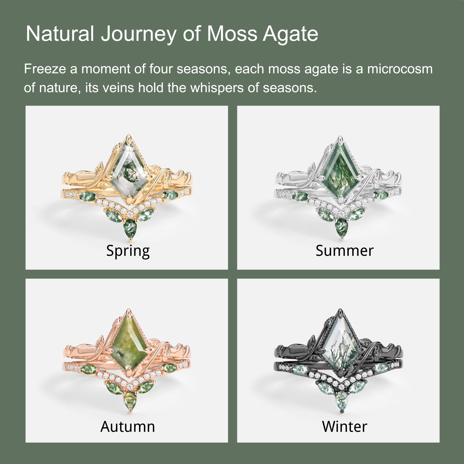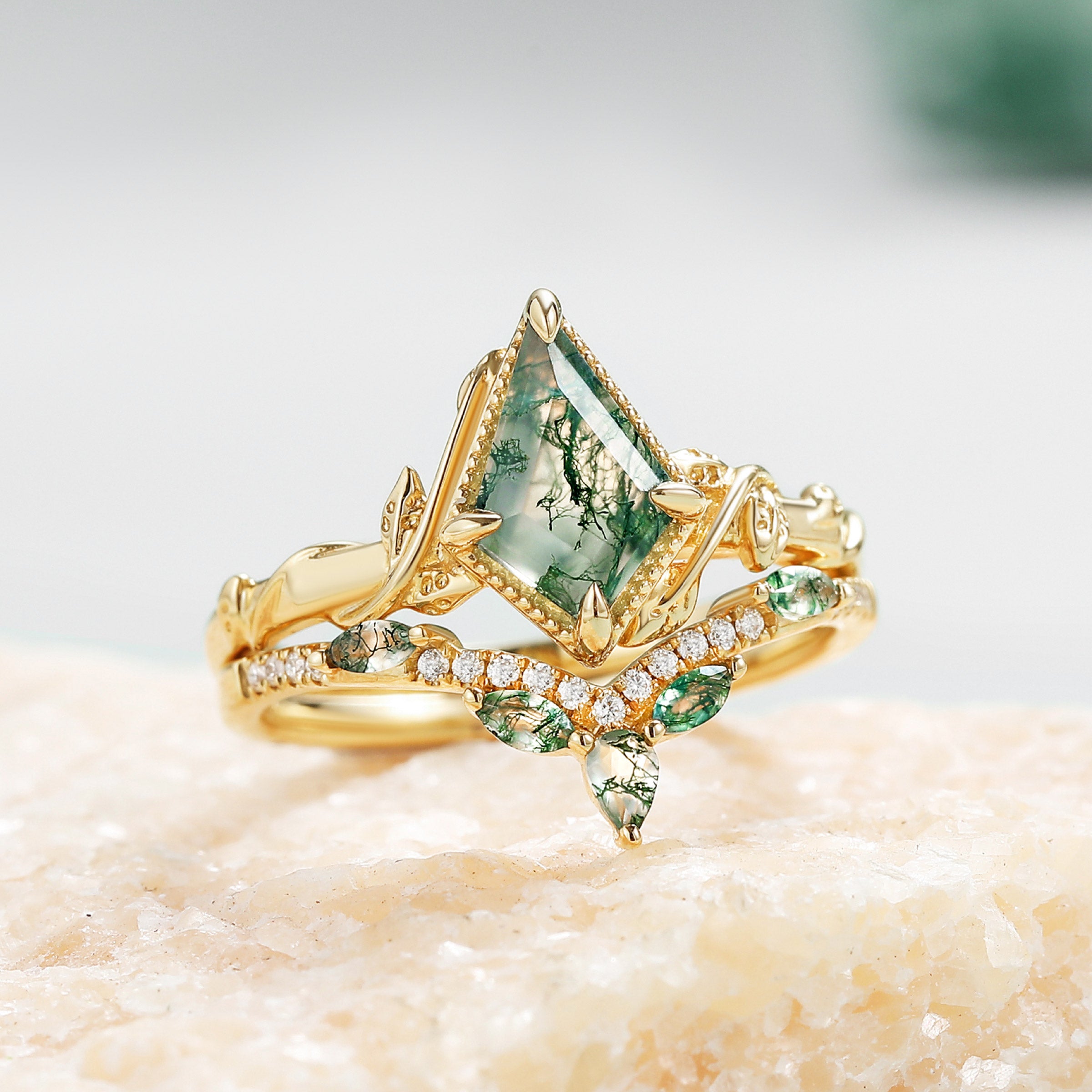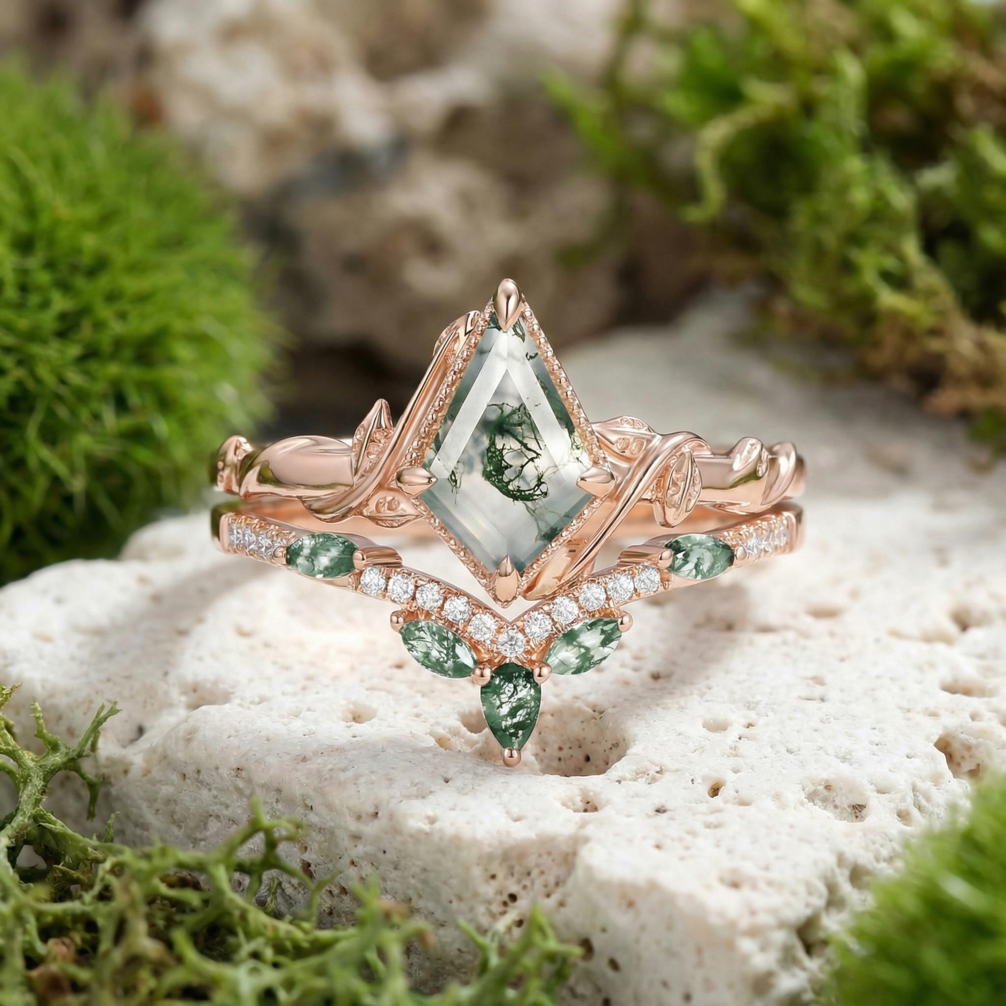 Kite Cut Moss Agate Leafy Engagement Ring Sets 2pcs - Lark