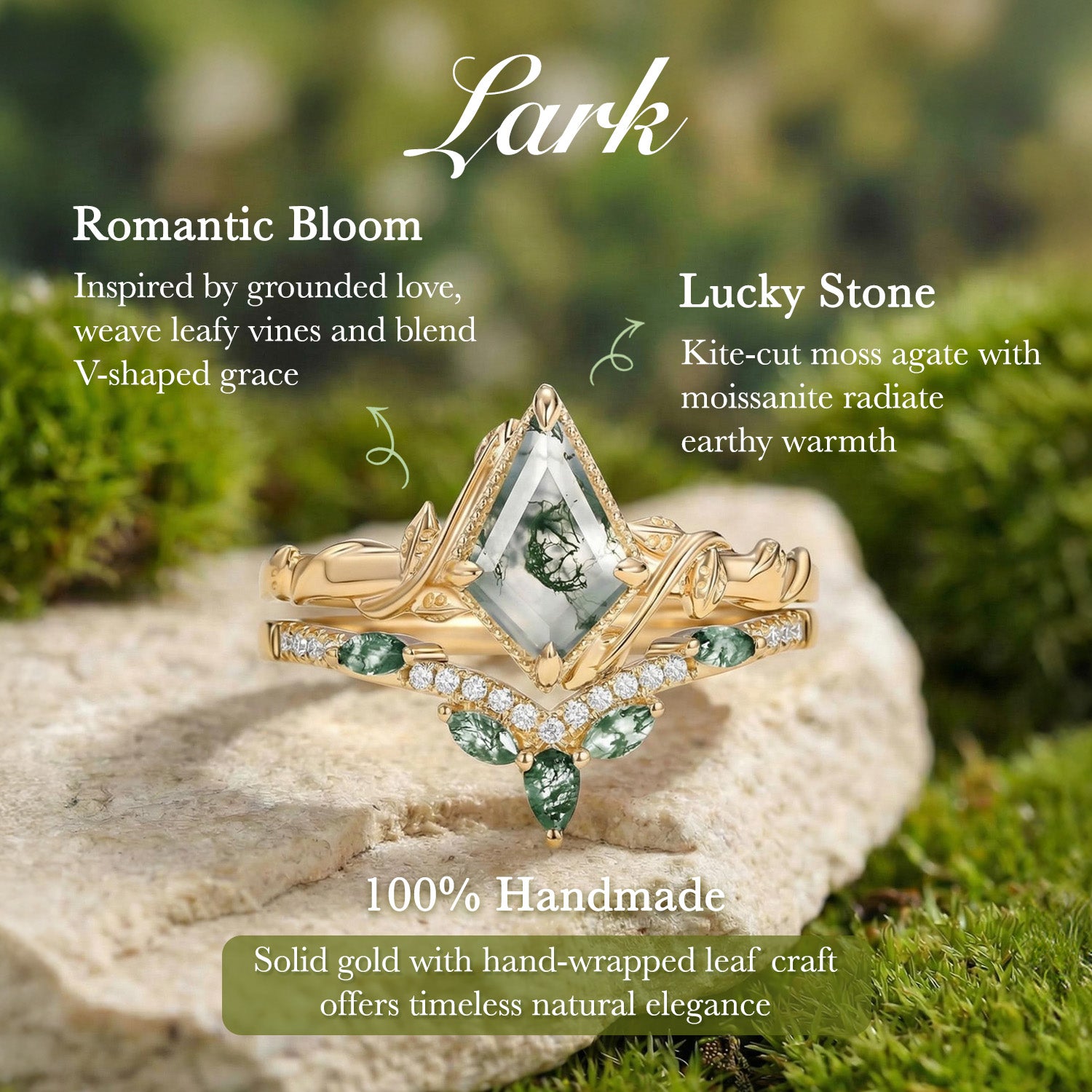 Lark is a tangible love letter from nature, woven with earthy romance. The intricately wrapped leafy vines on the main ring and the V-shaped wedding band adorned with moissanite + marquise moss agate strike a perfect balance between natural grace and timeless elegance. The poetic kite-cut Moss Agate centerpiece is the crowning glory, bringing nature’s essence front and center. Your Love, Forever Grounded in Growth. If you’re a nature-loving soul who cherishes rooted romance, Lark is made for you.