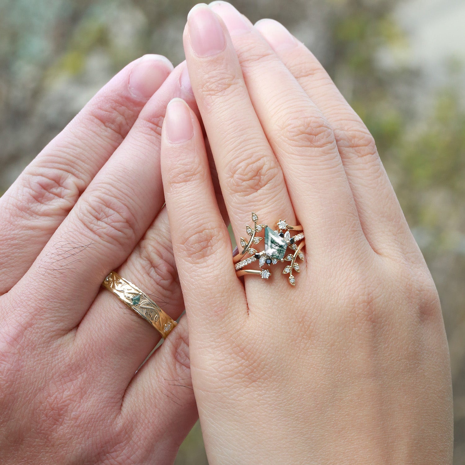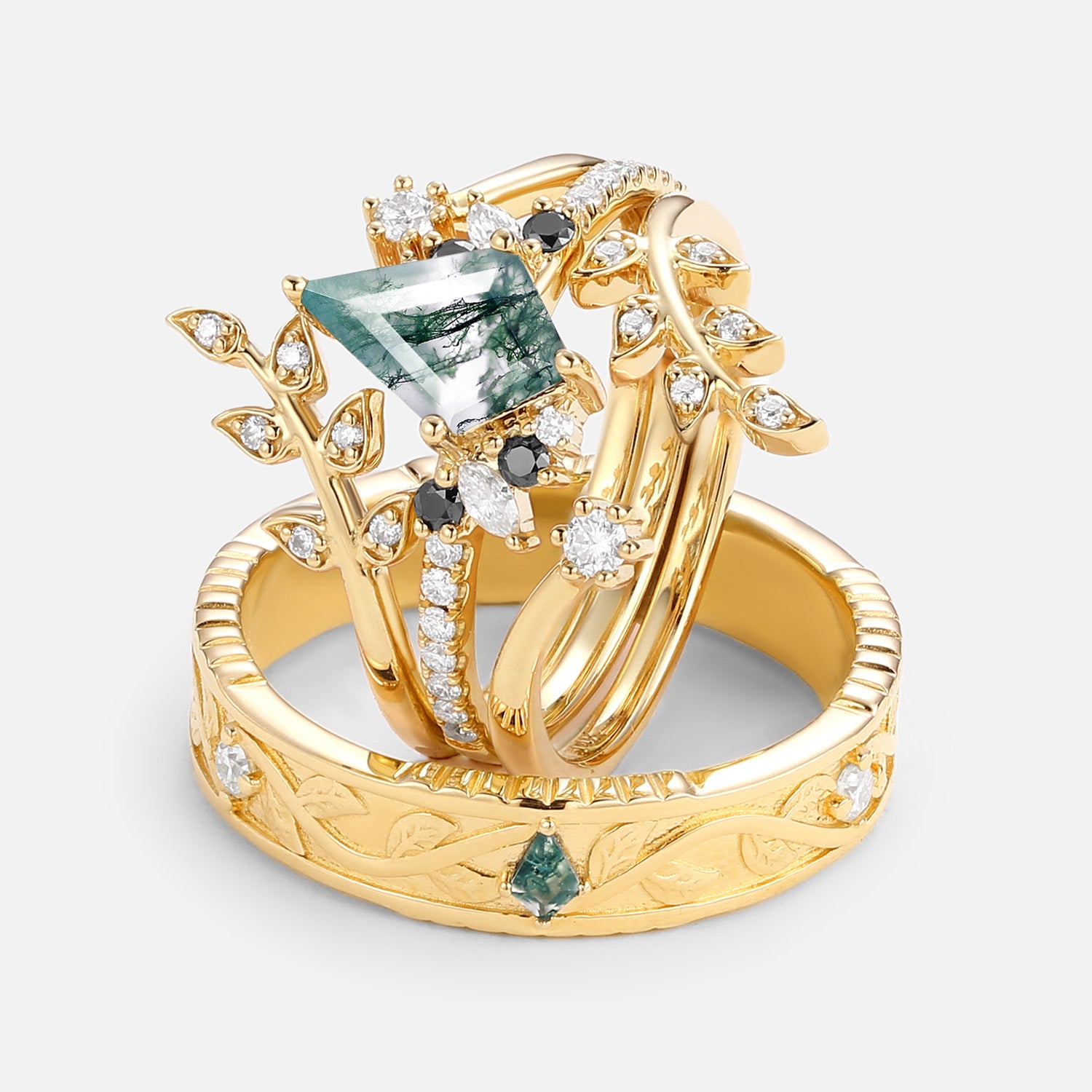 Leafy Kite Cut Moss Agate & Black Moissanite Couple Ring Set 4pcs