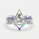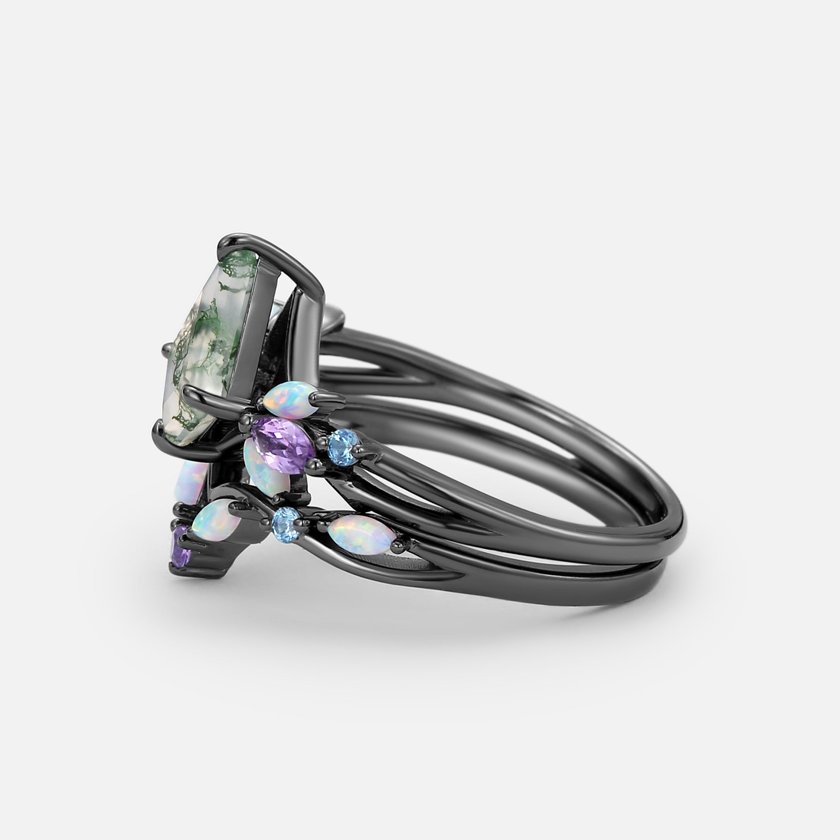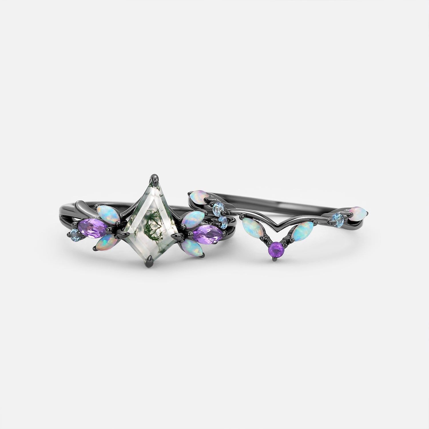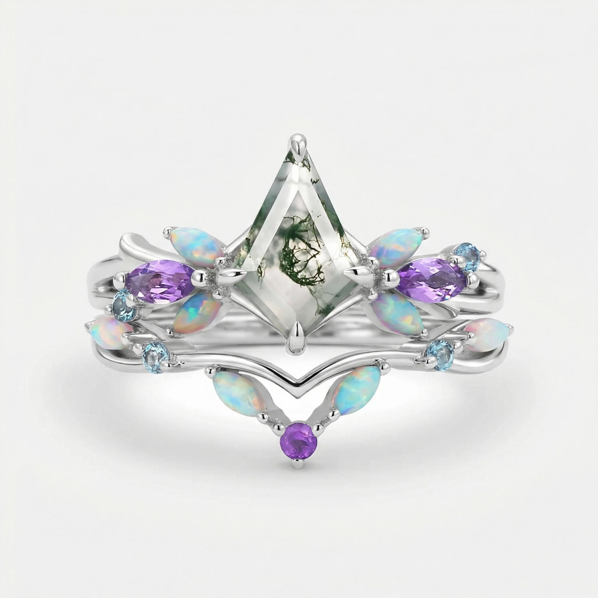 Moss Agate & Opal & Amethyst Unique Engagement Ring Set 2pcs - Bella