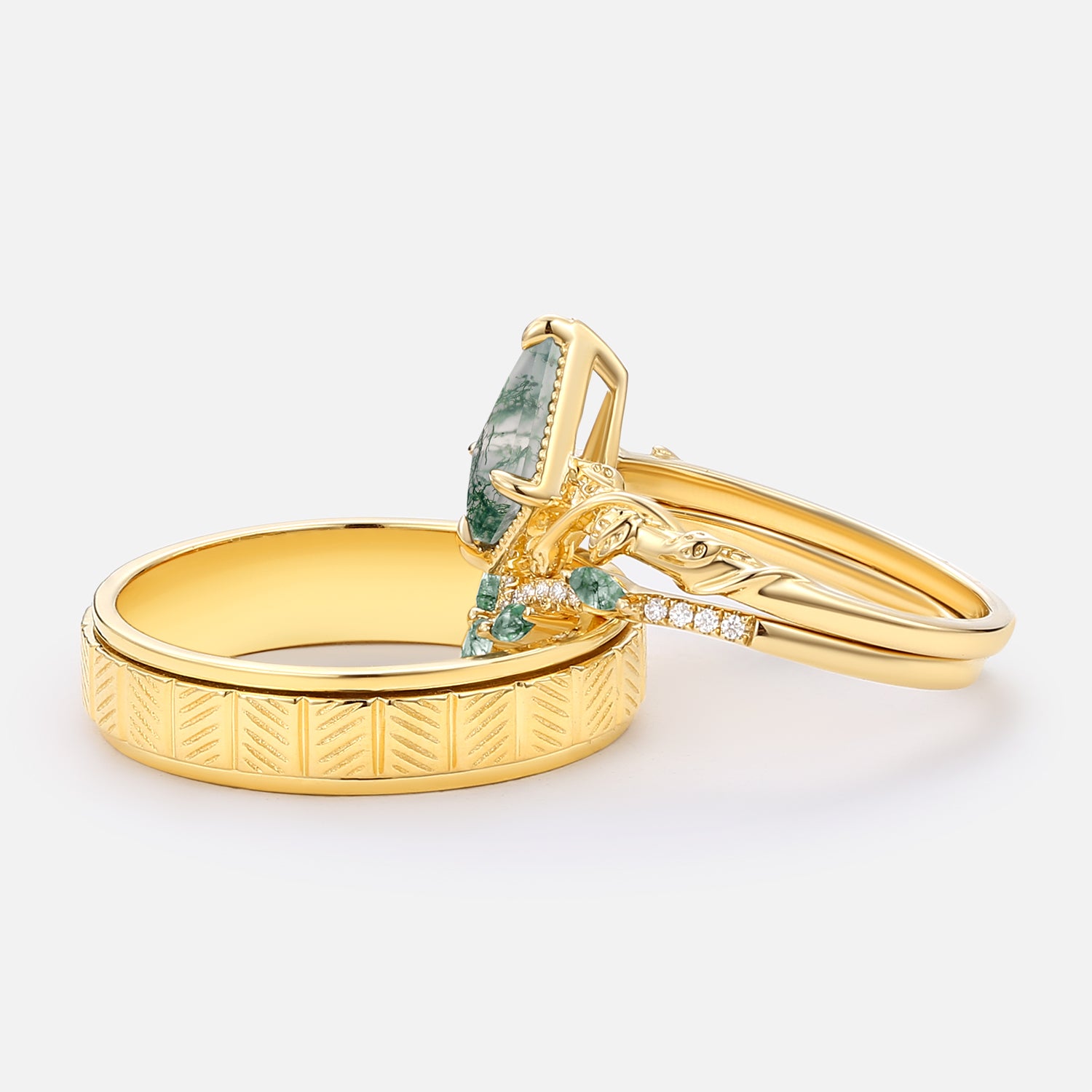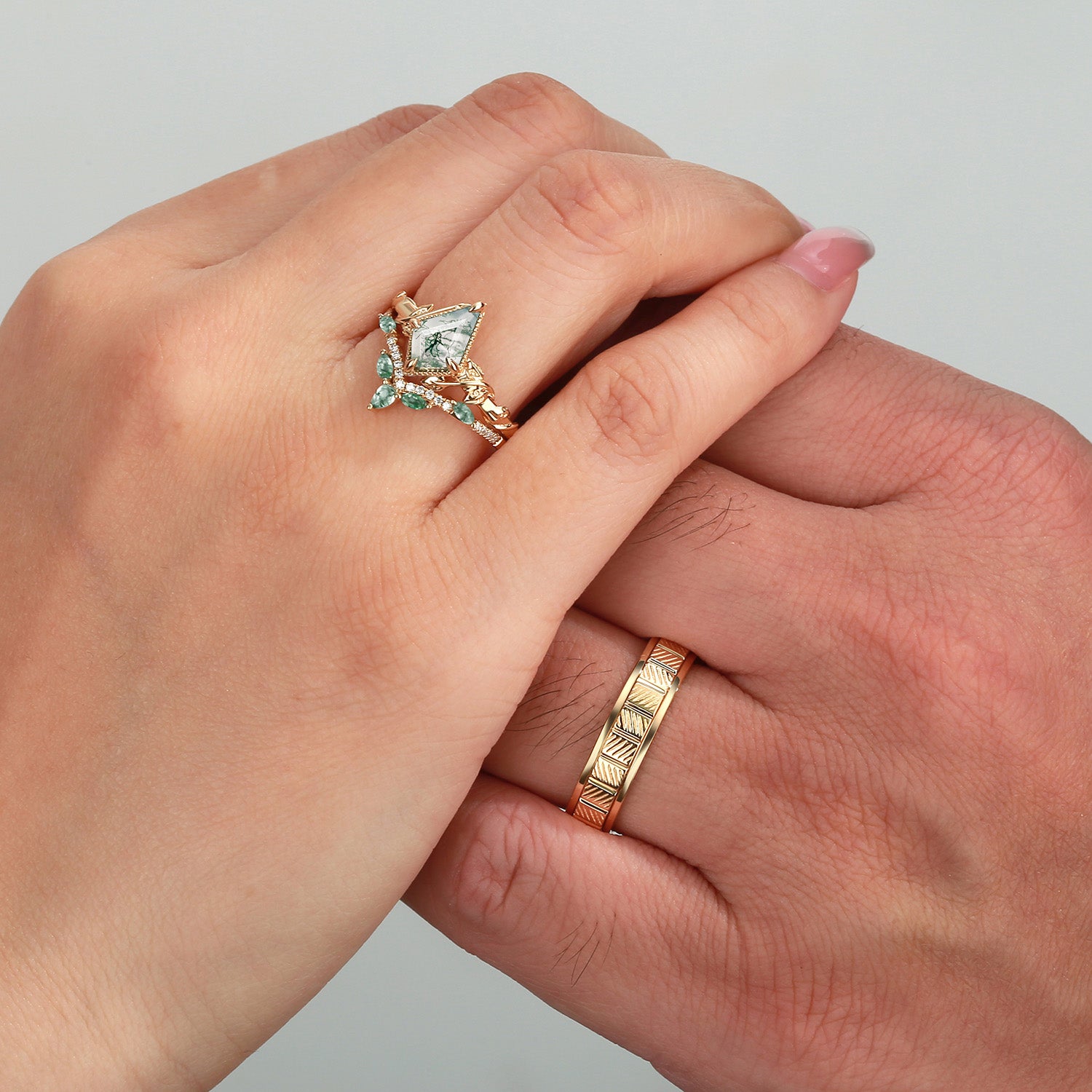 Nature Inspired - Unique Kite Cut Moss Agate Leafy Couple Ring Set 3pcs