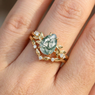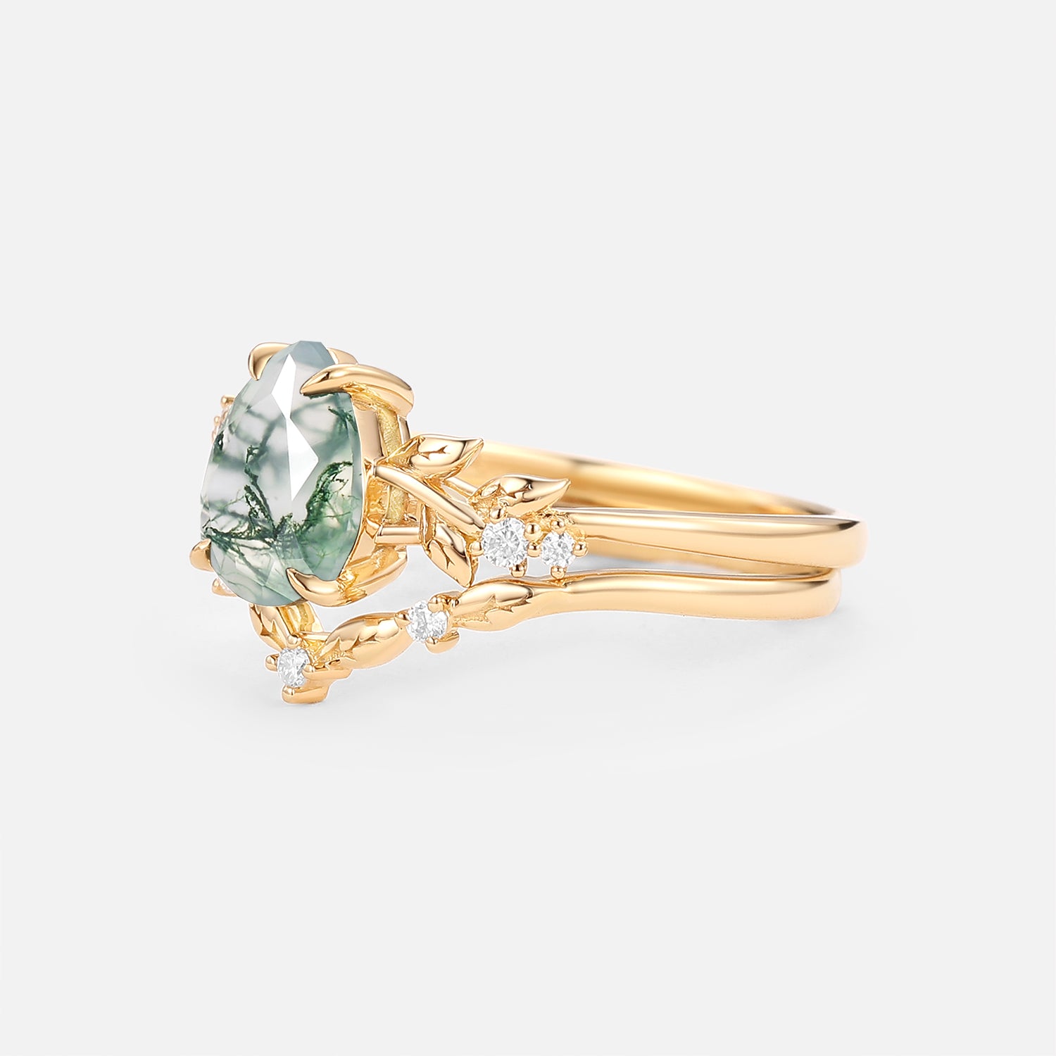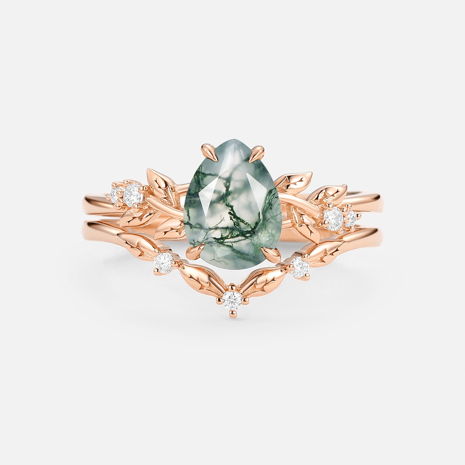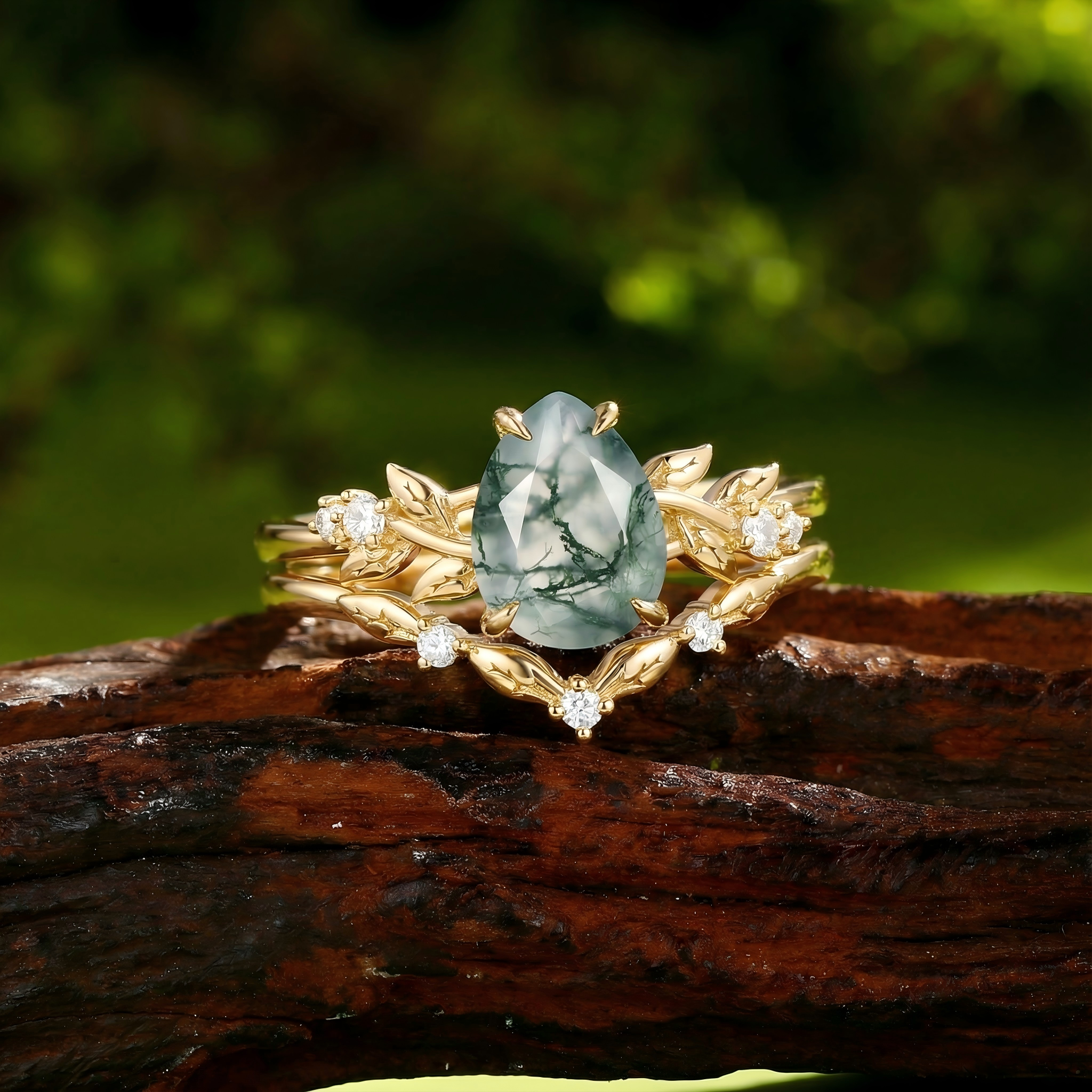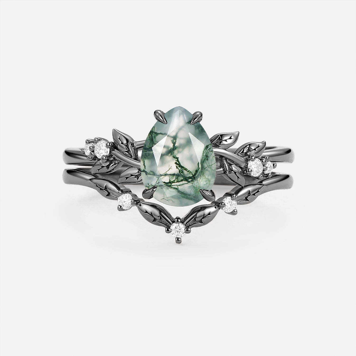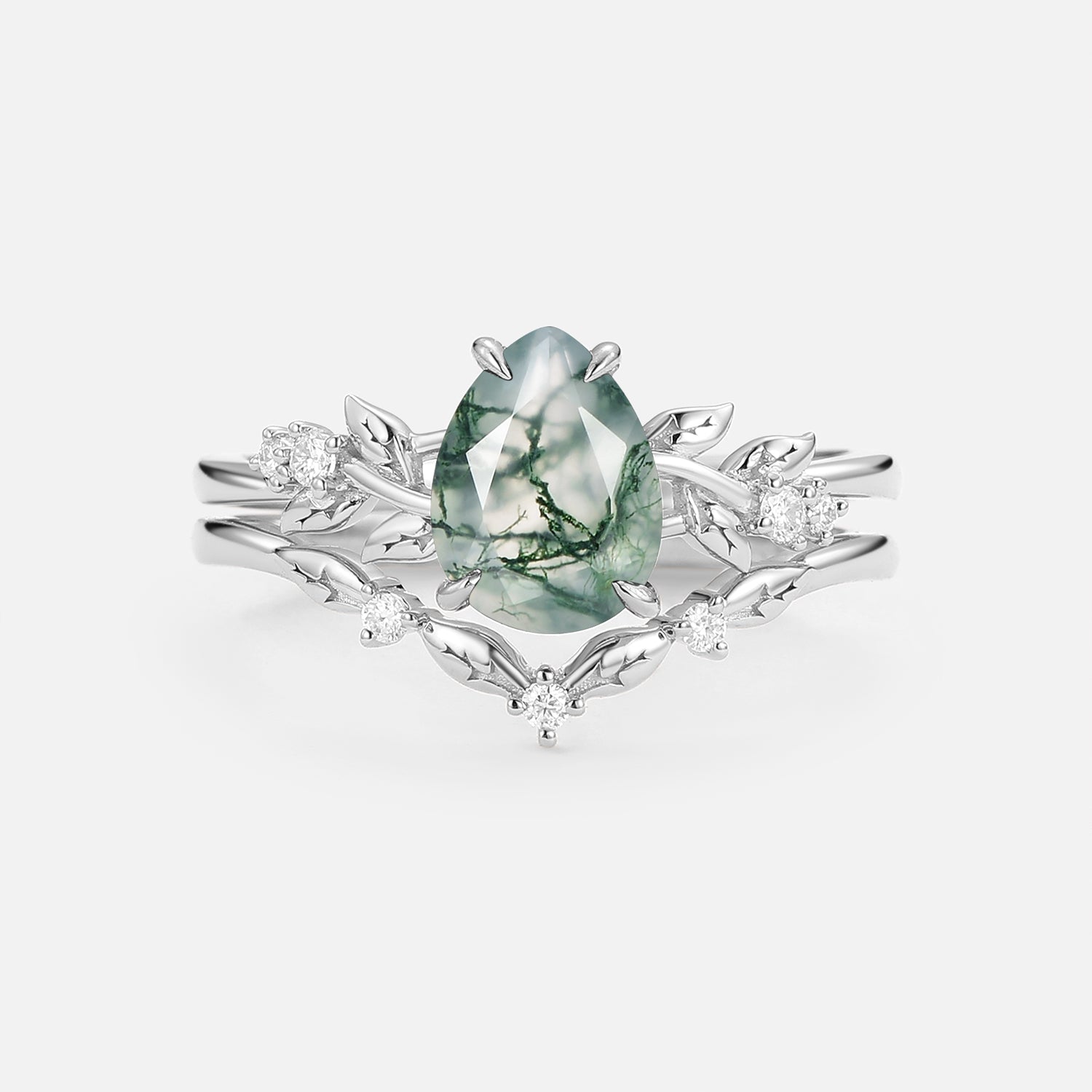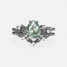 Pear Cut Leafy Moss Agate Engagement Ring Set 2pcs - Urea