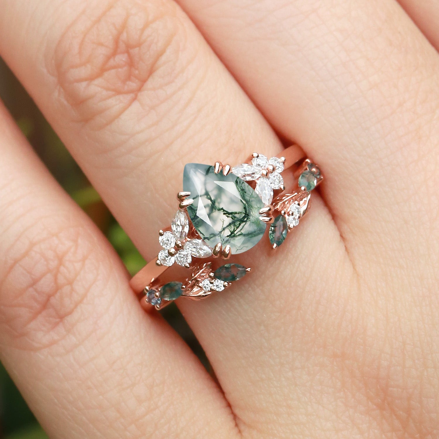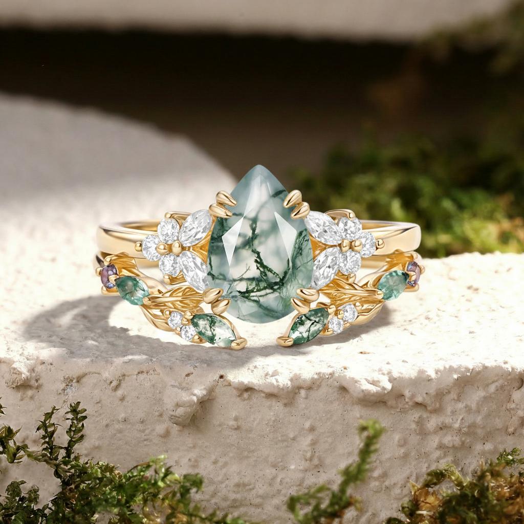 Pear Shaped Moss Agate Leafy Chevron Gold Ring Set 2pcs - Chloris